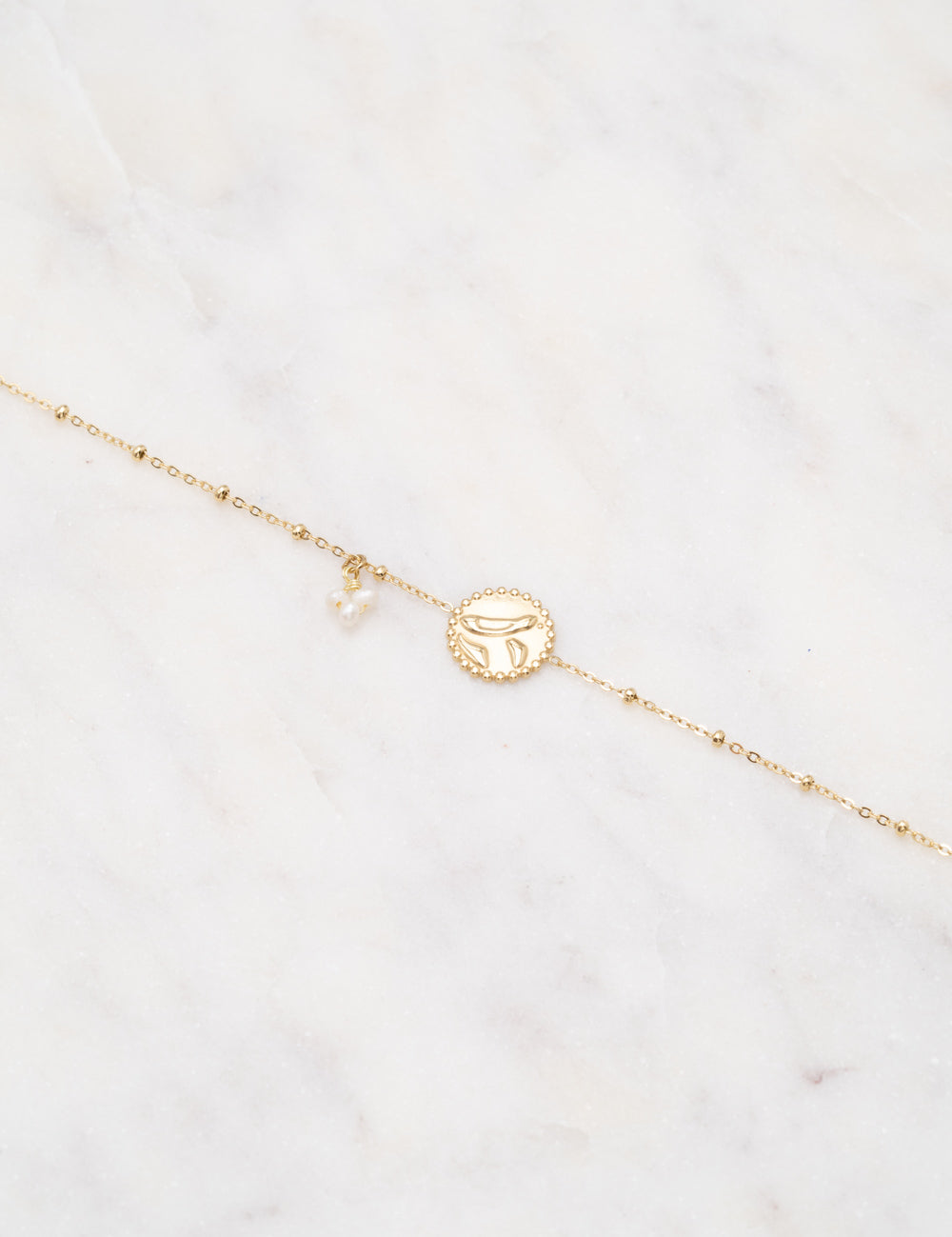 Bracelet réglable sur chaîne composé de perles en pierres naturelles et d'une pampille graphique.