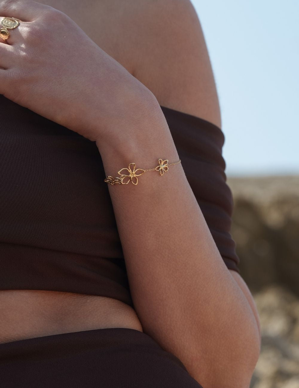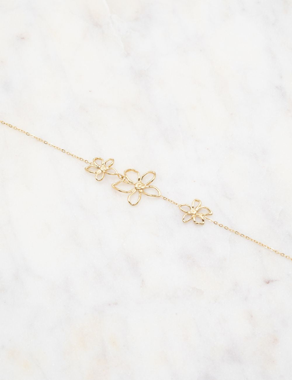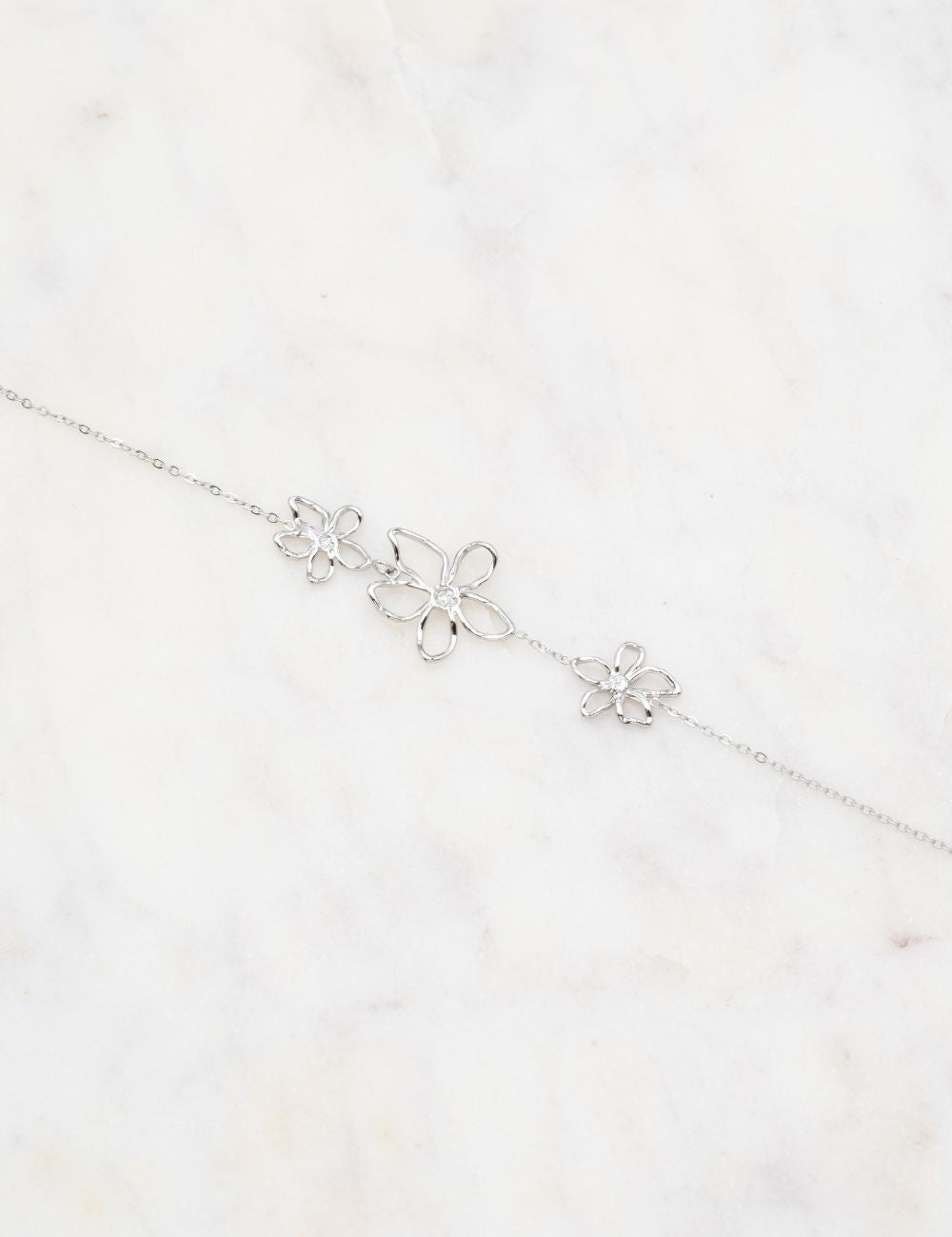 Bracelet réglable sur chaîne composé de plusieurs fleurs ajourées.