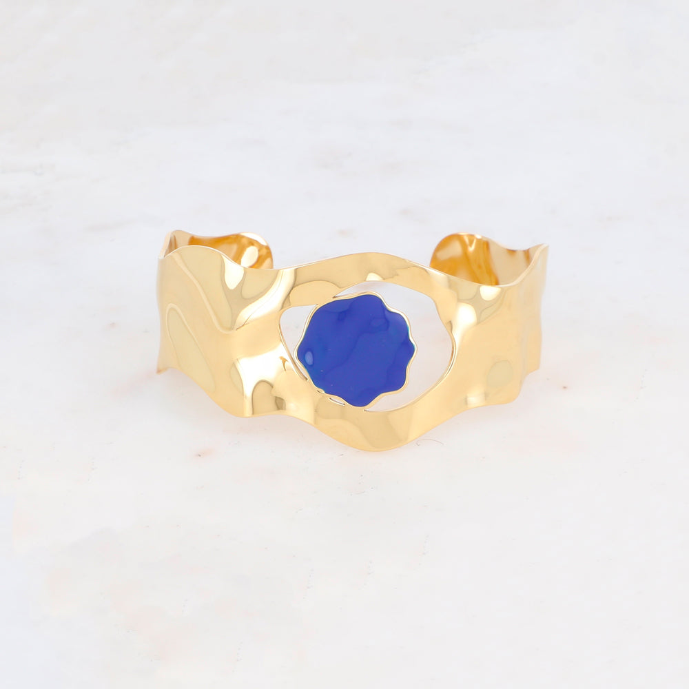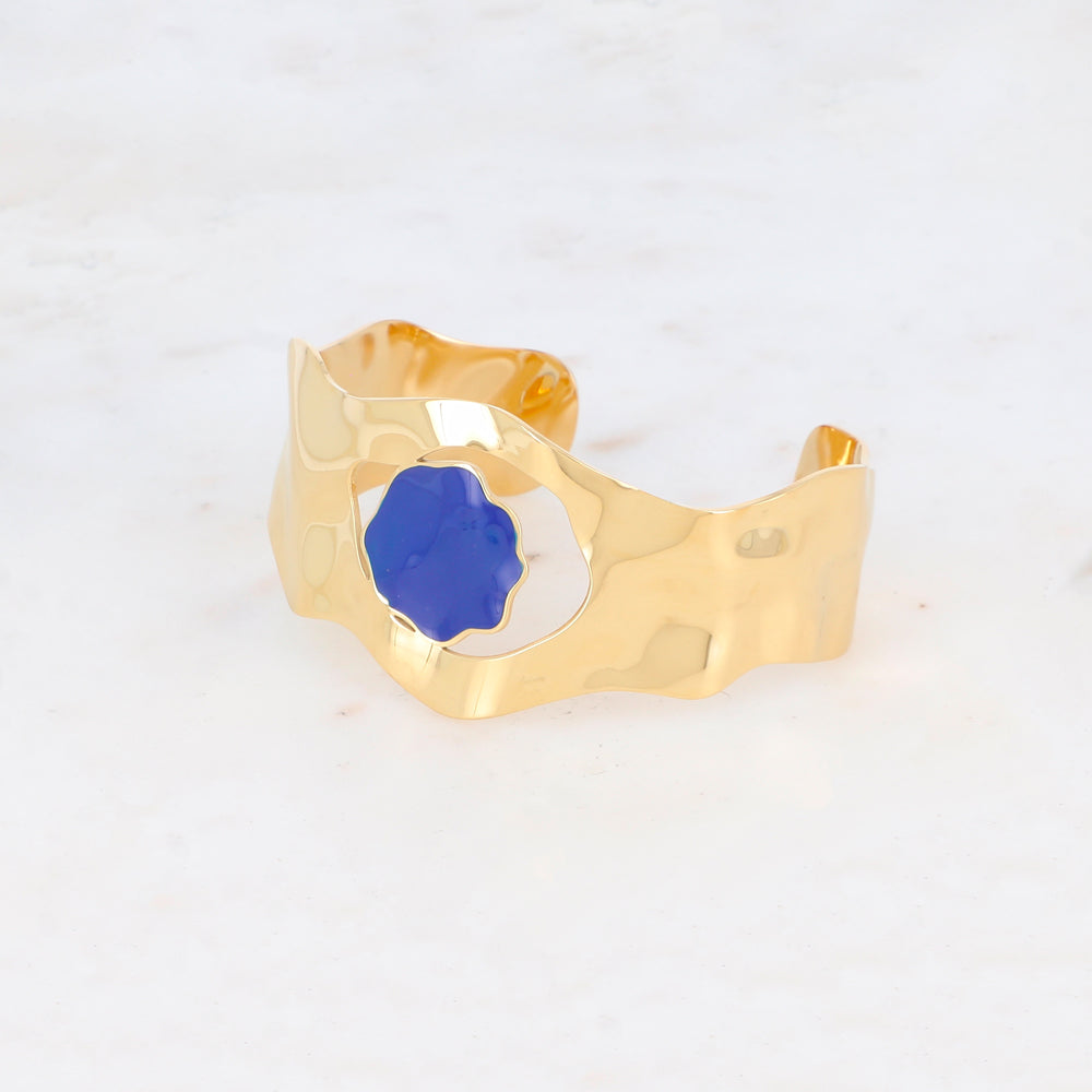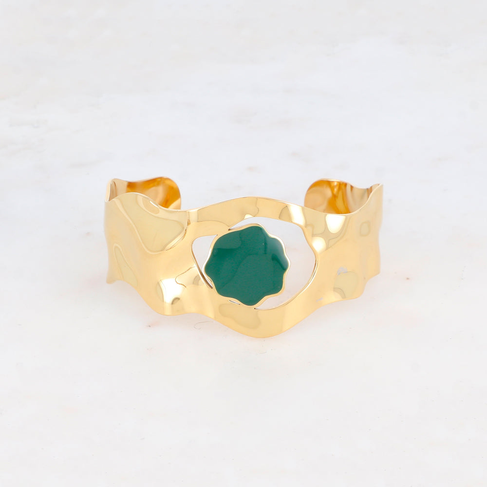 Bracelet type jonc composé d'une pièce graphique ajourée martelée et émaillée colorée.