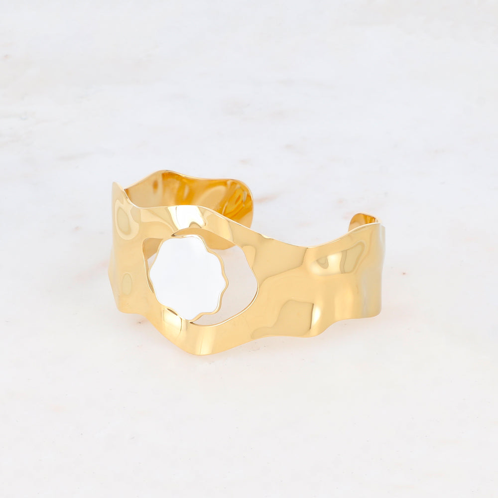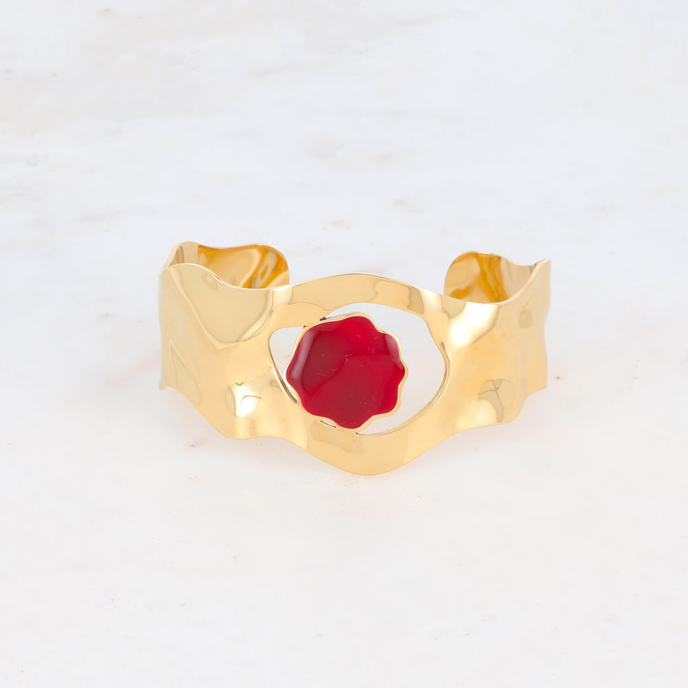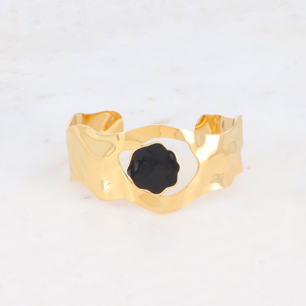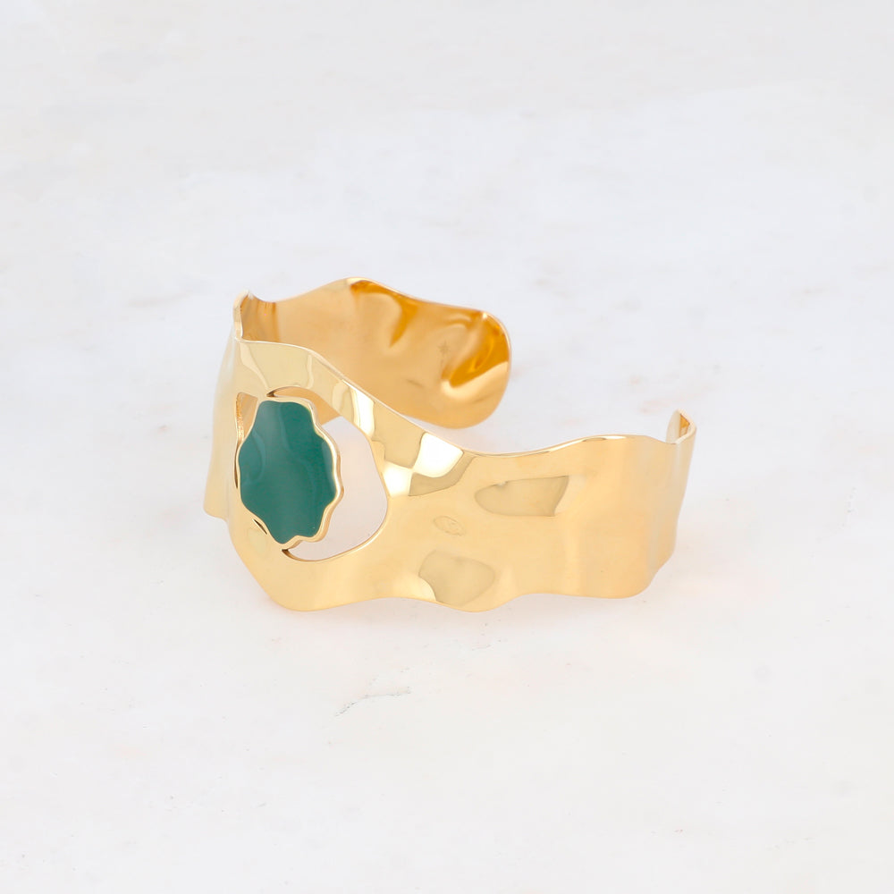 Bracelet type jonc composé d'une pièce graphique ajourée martelée et émaillée colorée.