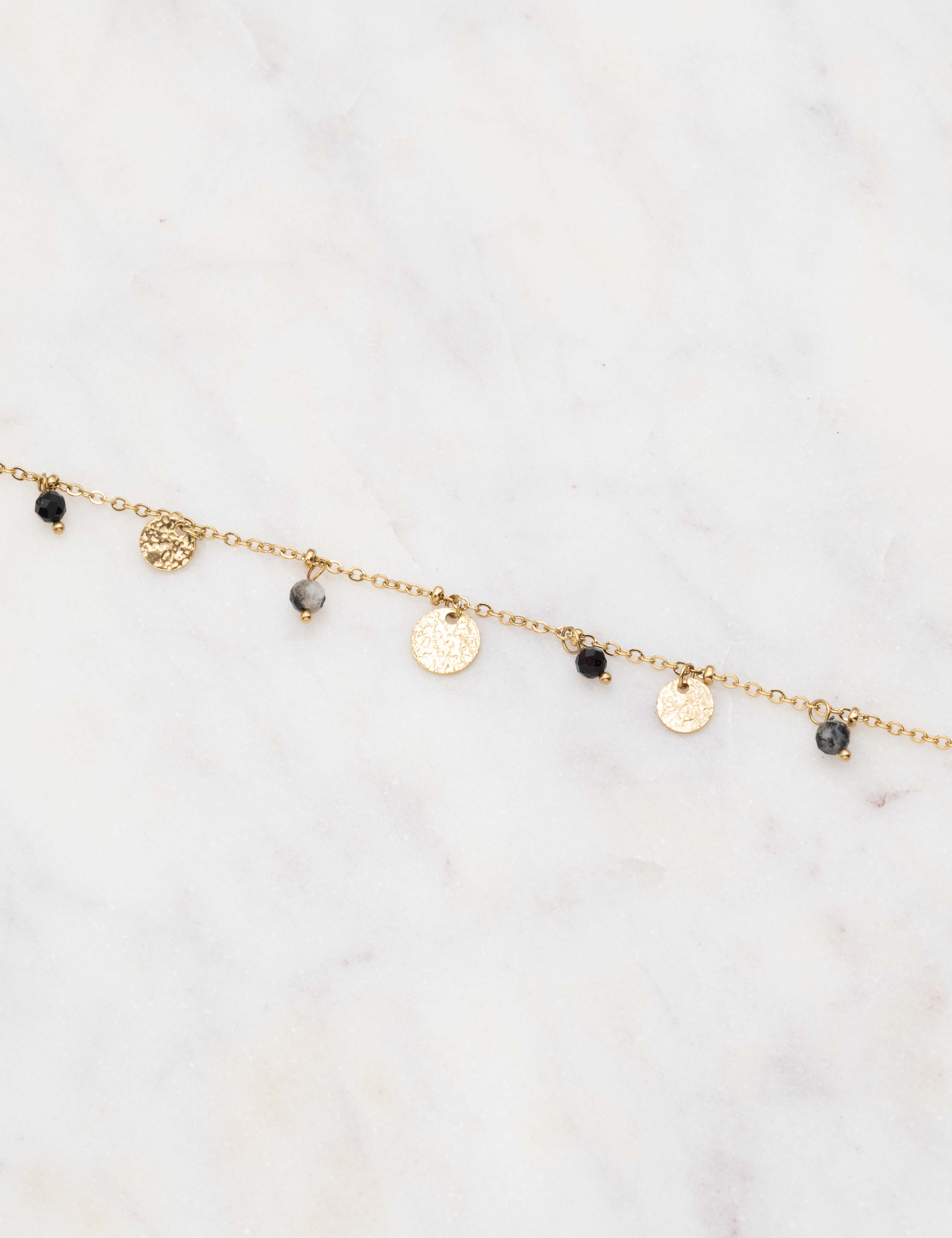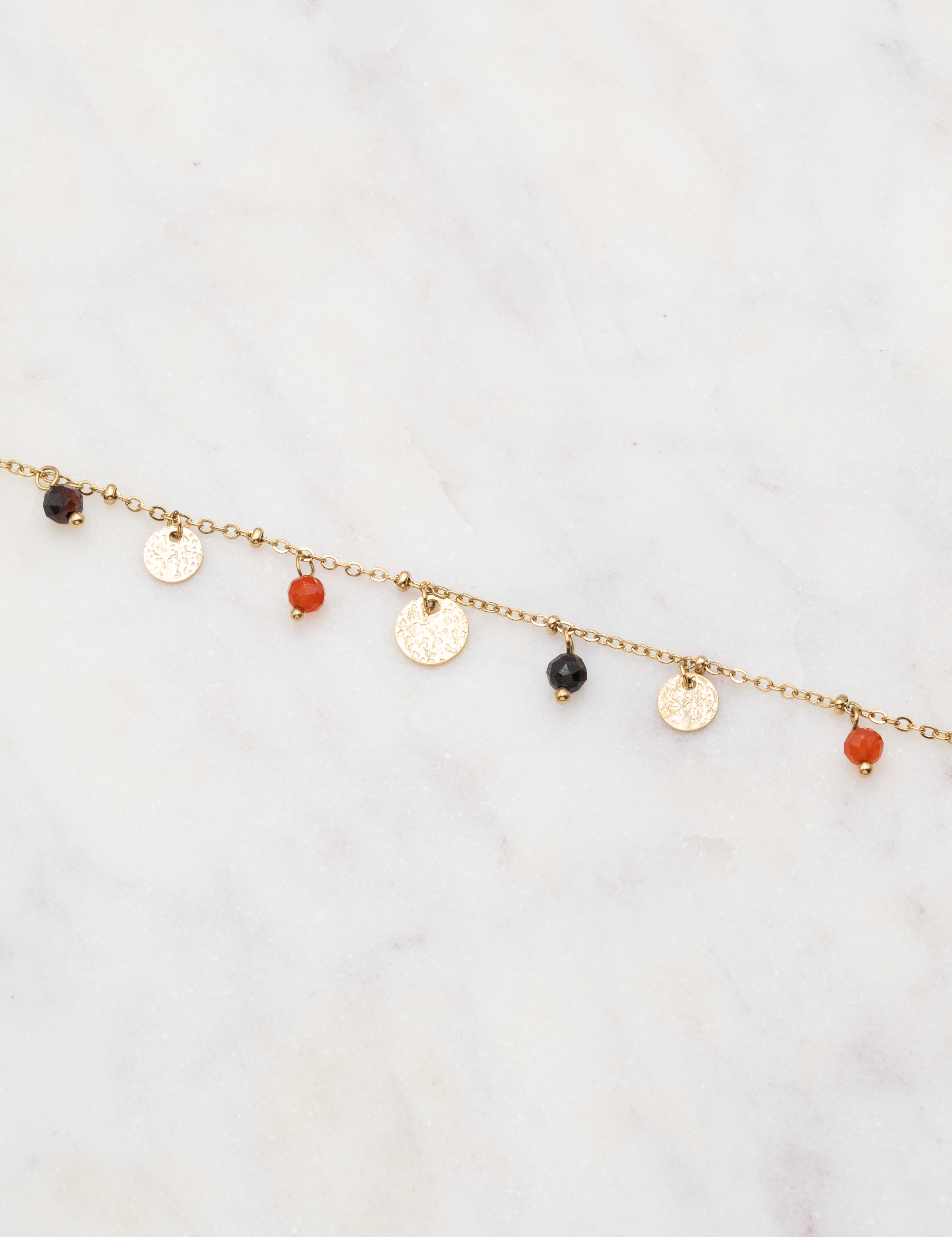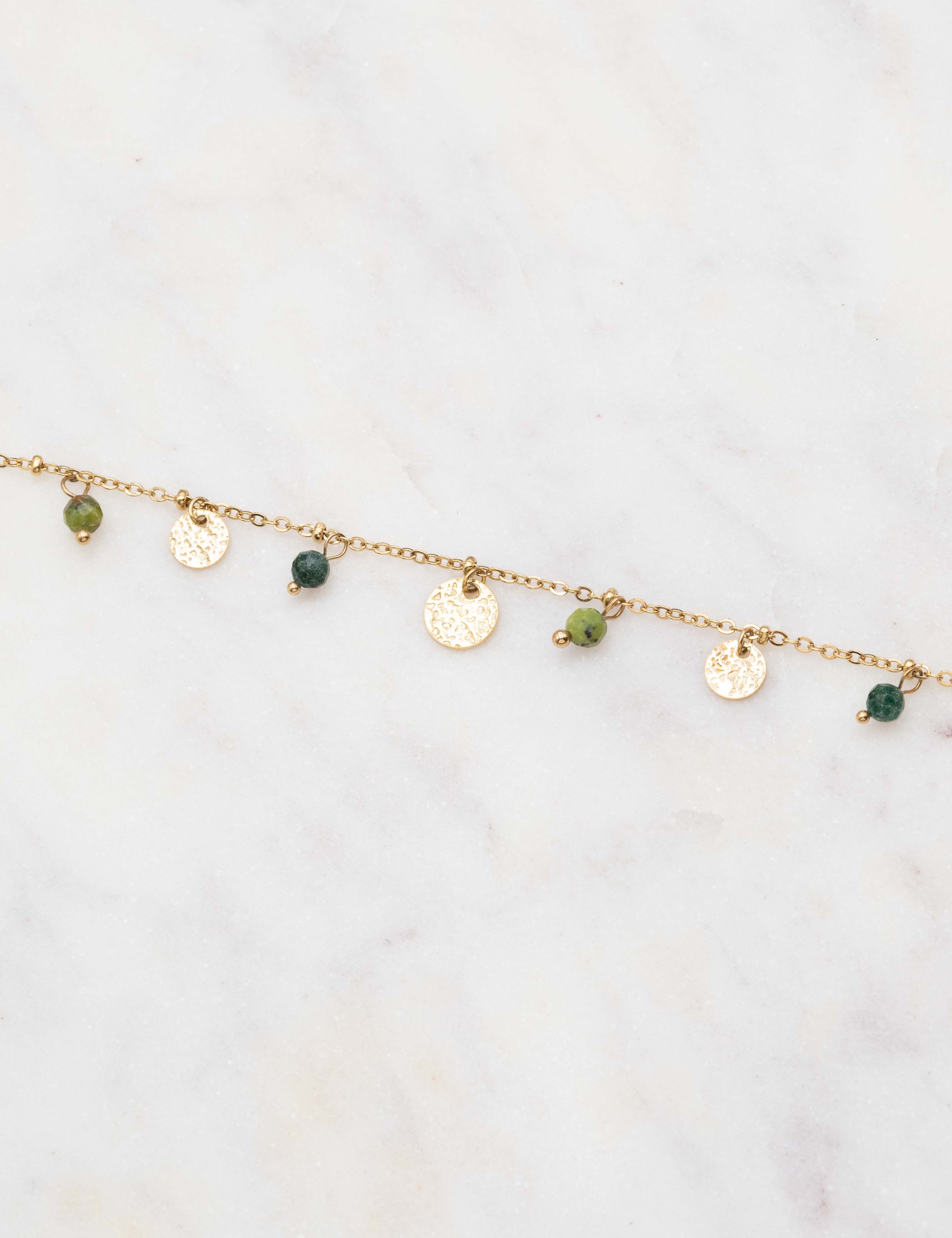 Bracelet réglable sur chaine composé de pierres naturelles et de pampilles rondes dorées martelées.