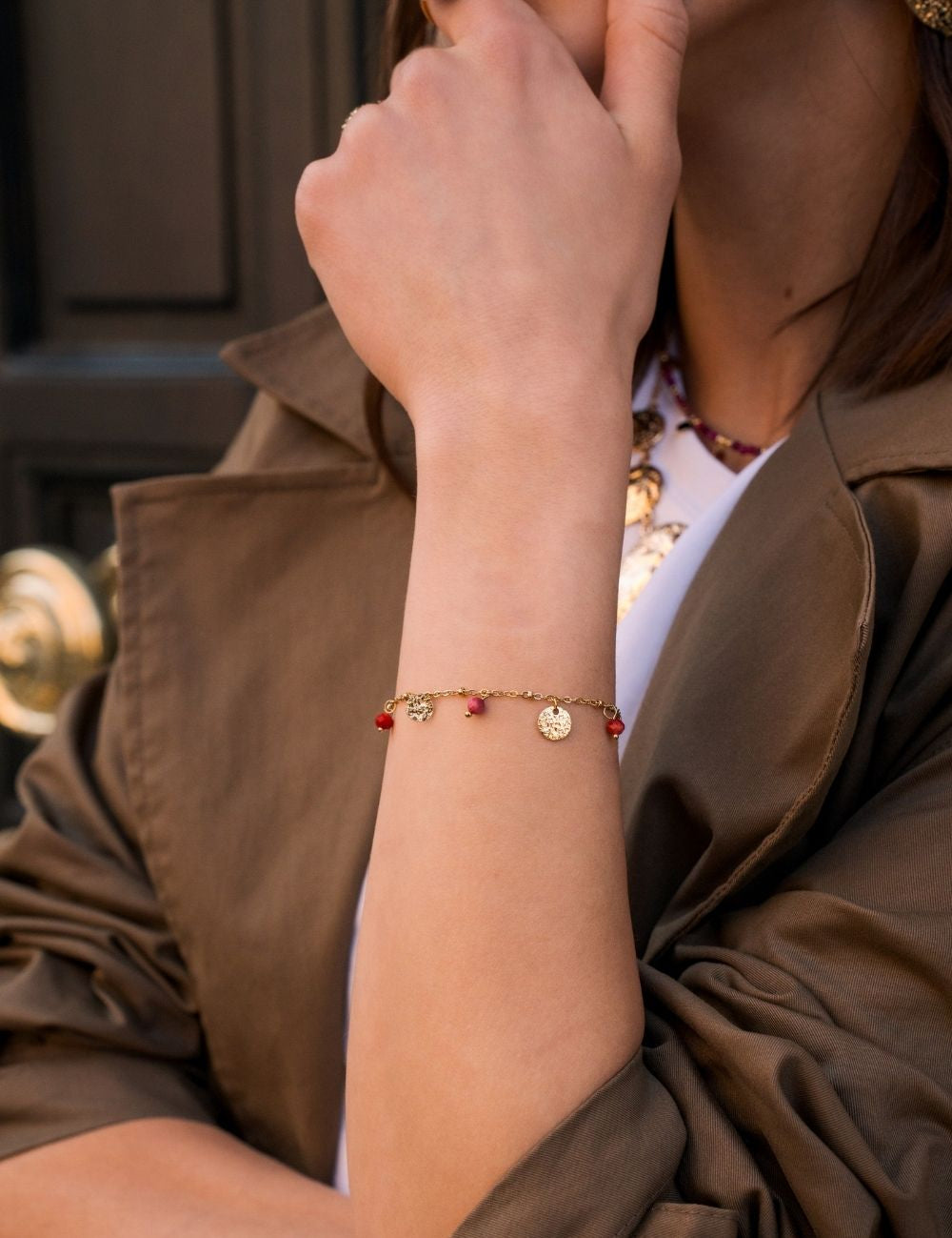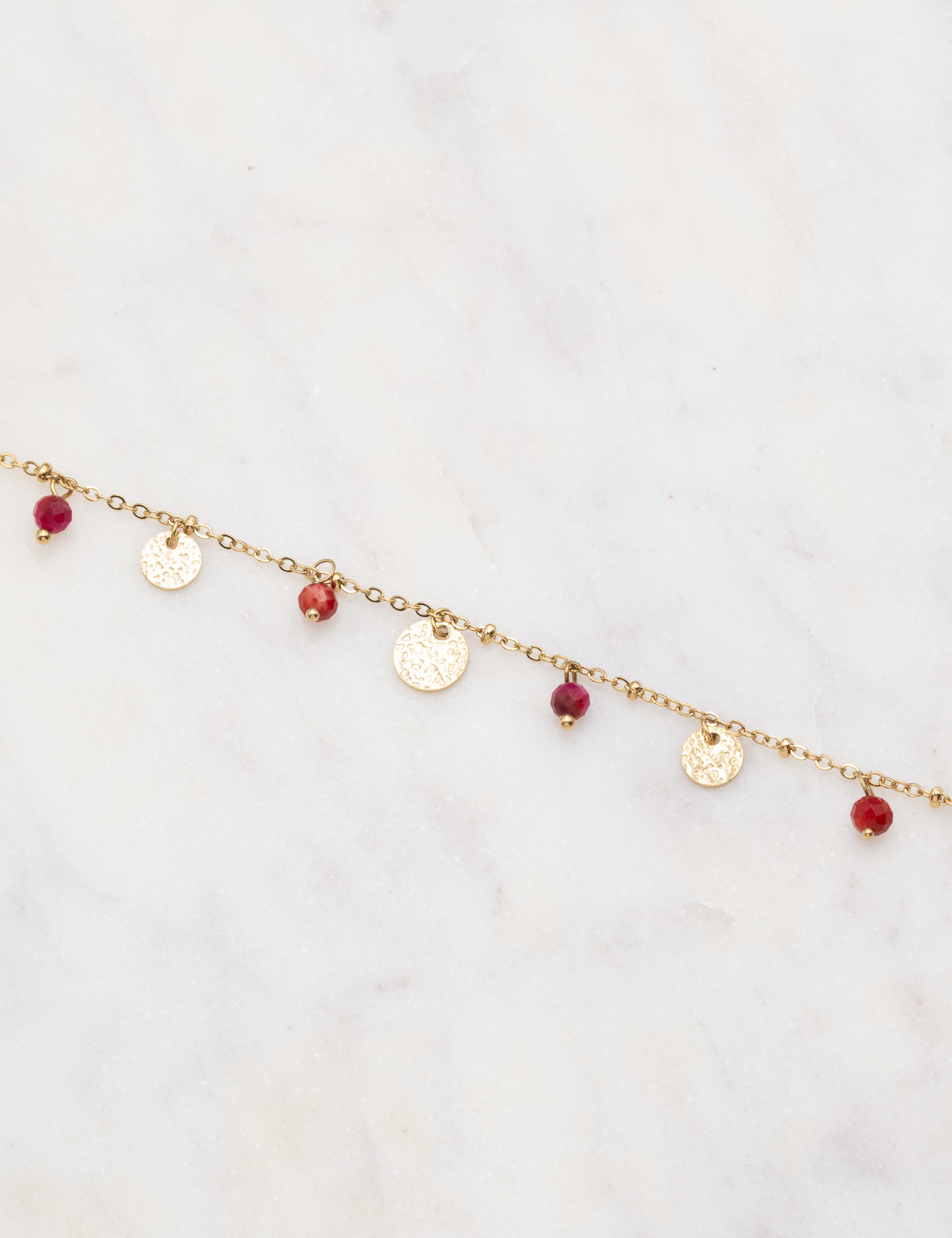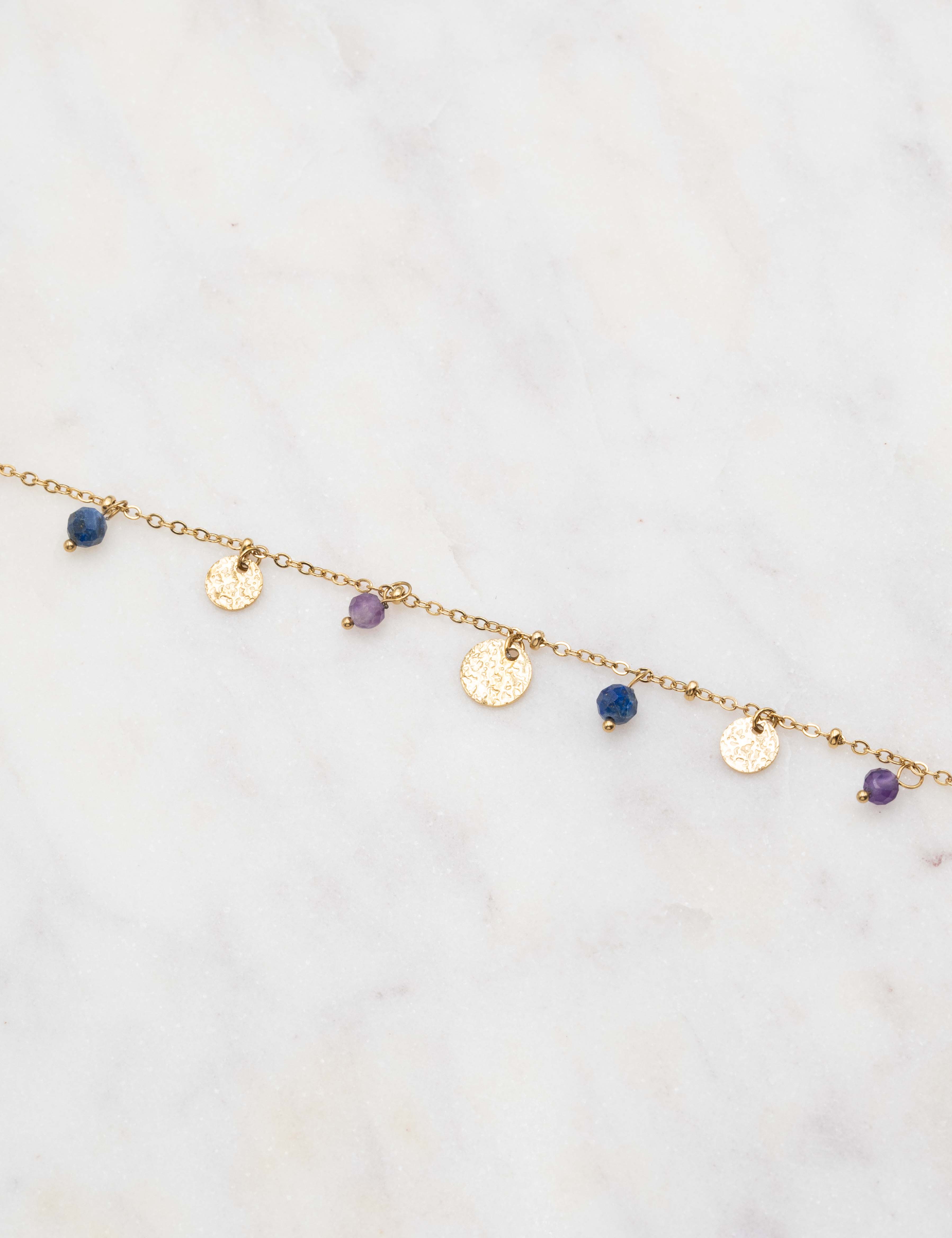 Bracelet réglable sur chaine composé de pierres naturelles et de pampilles rondes dorées martelées.