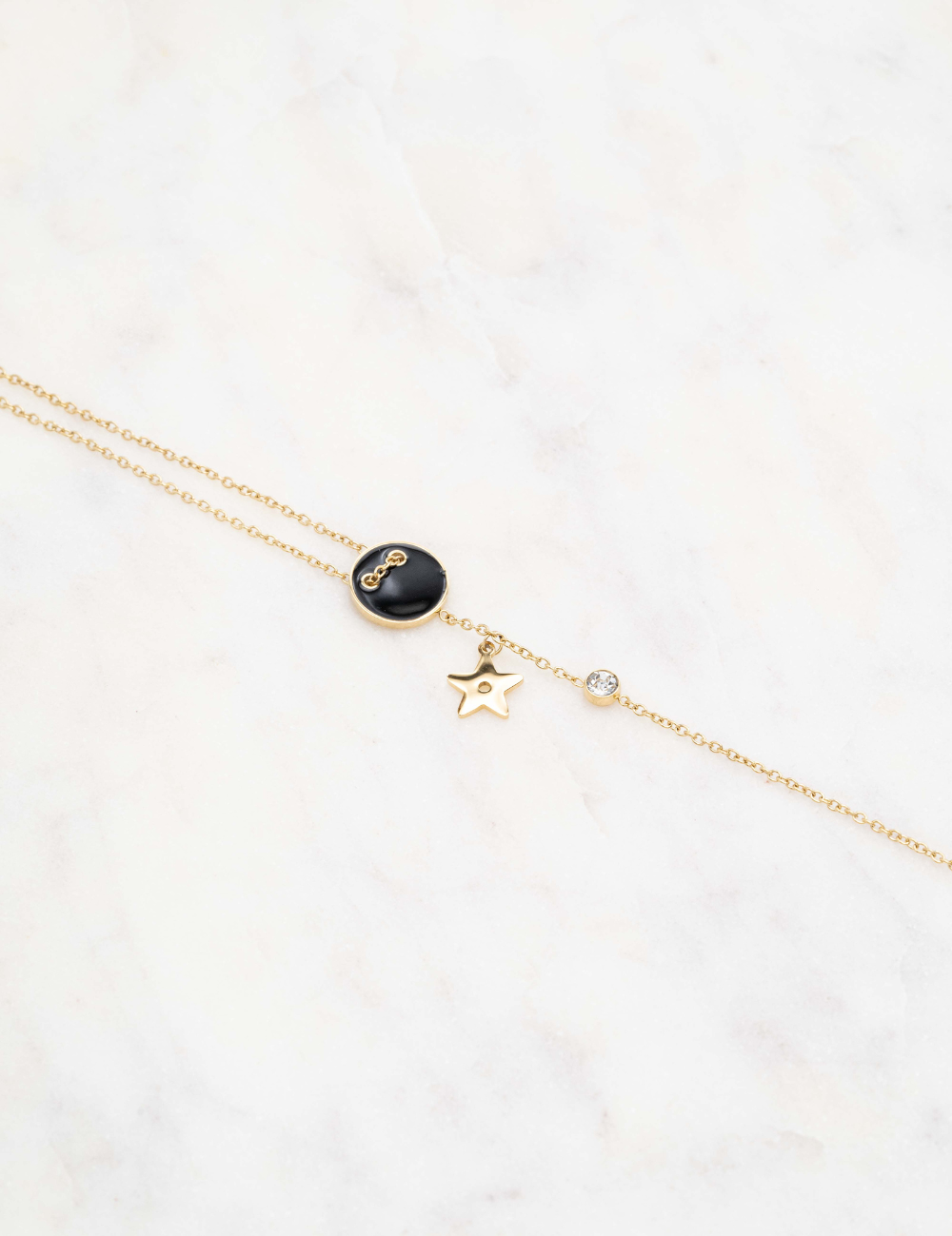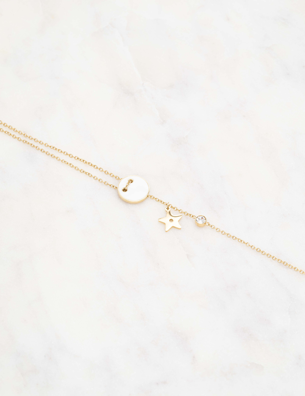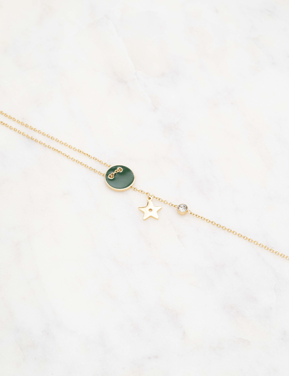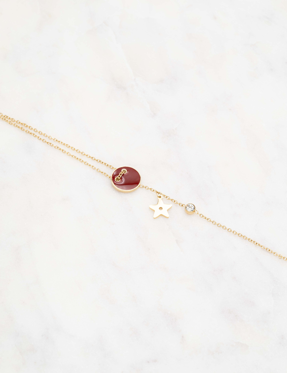 Bracelet réglable sur chaîne composé d'une pampille étoile, d'un strass blanc et d'une pièce émaillée colorée.