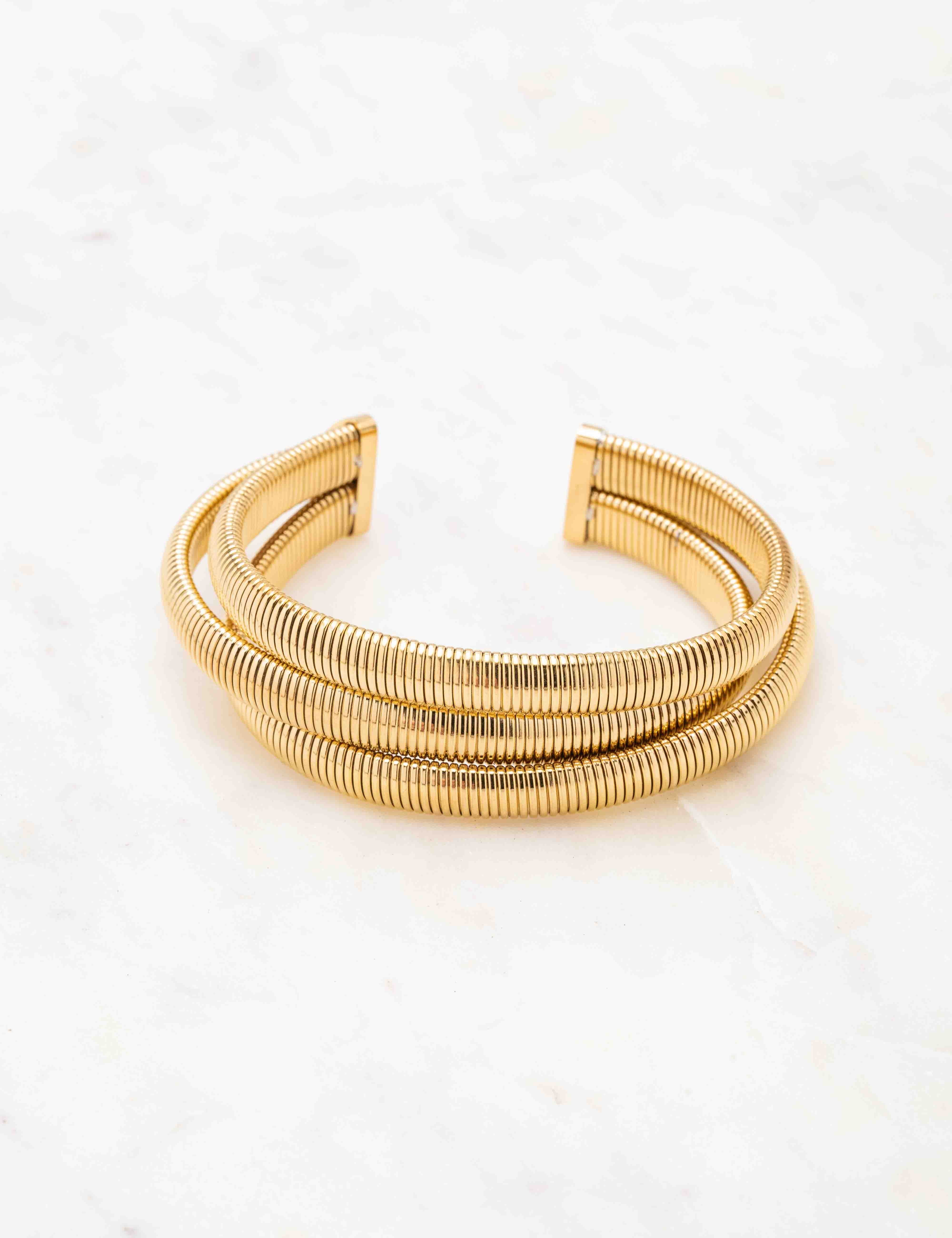 Bracelet type manchette composé de 3 rangs effet rainuré semi croisé.