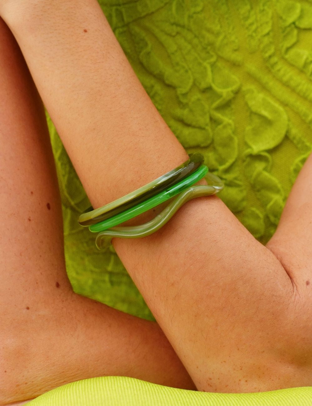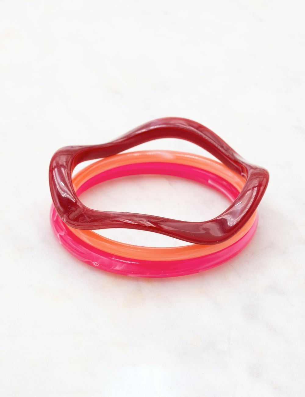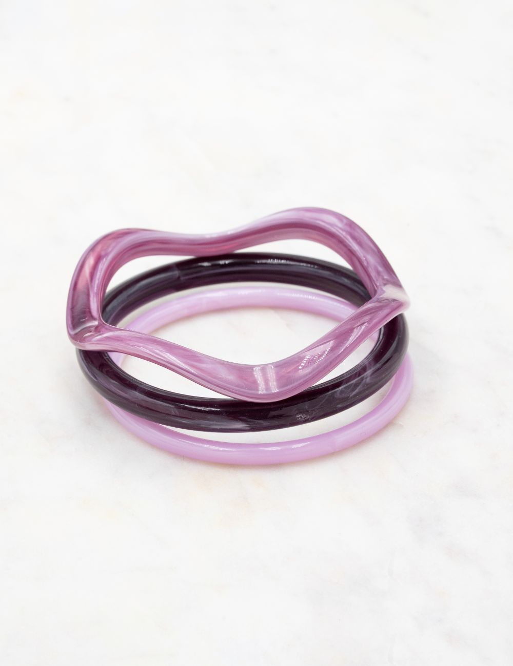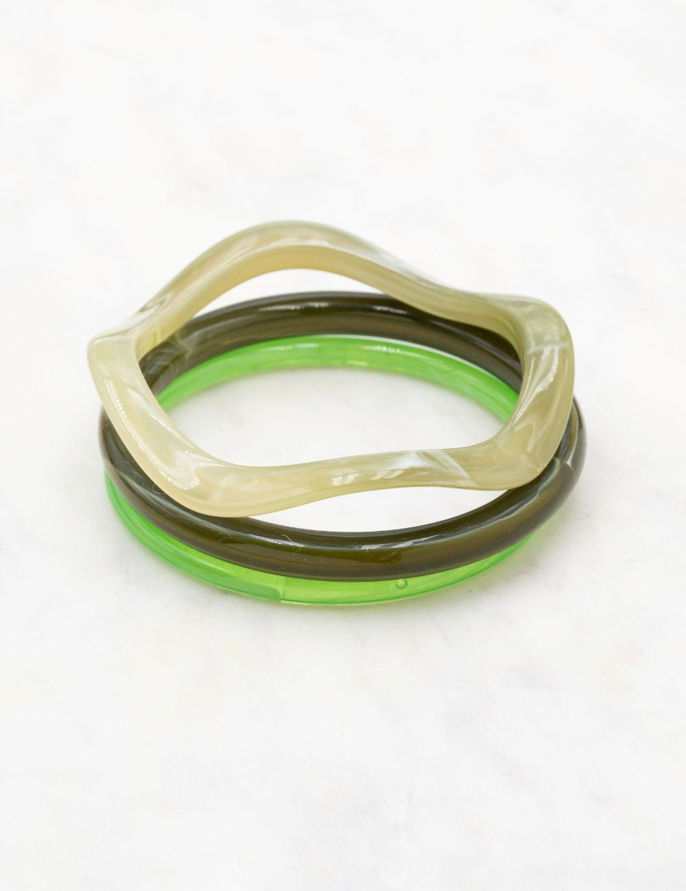 Notes : les bracelets ne sont pas malléables (Design rigide, Sans fermeture). Les couleurs en acétate diffèrent d'une pièce à l'autre.  Il existe donc des variations de couleur.   Les motifs sont aléatoires sur les joncs. Vendu par lot de 3.