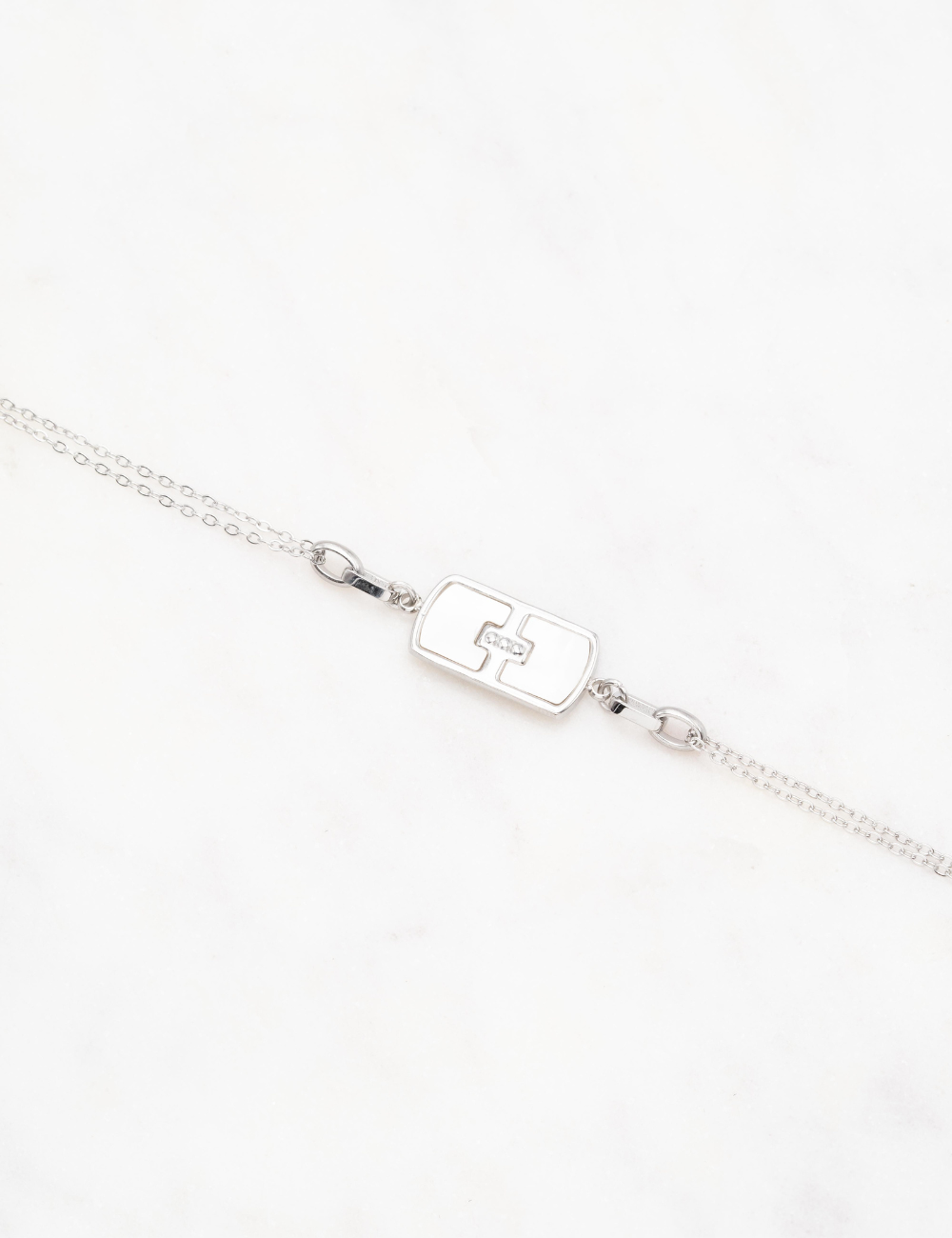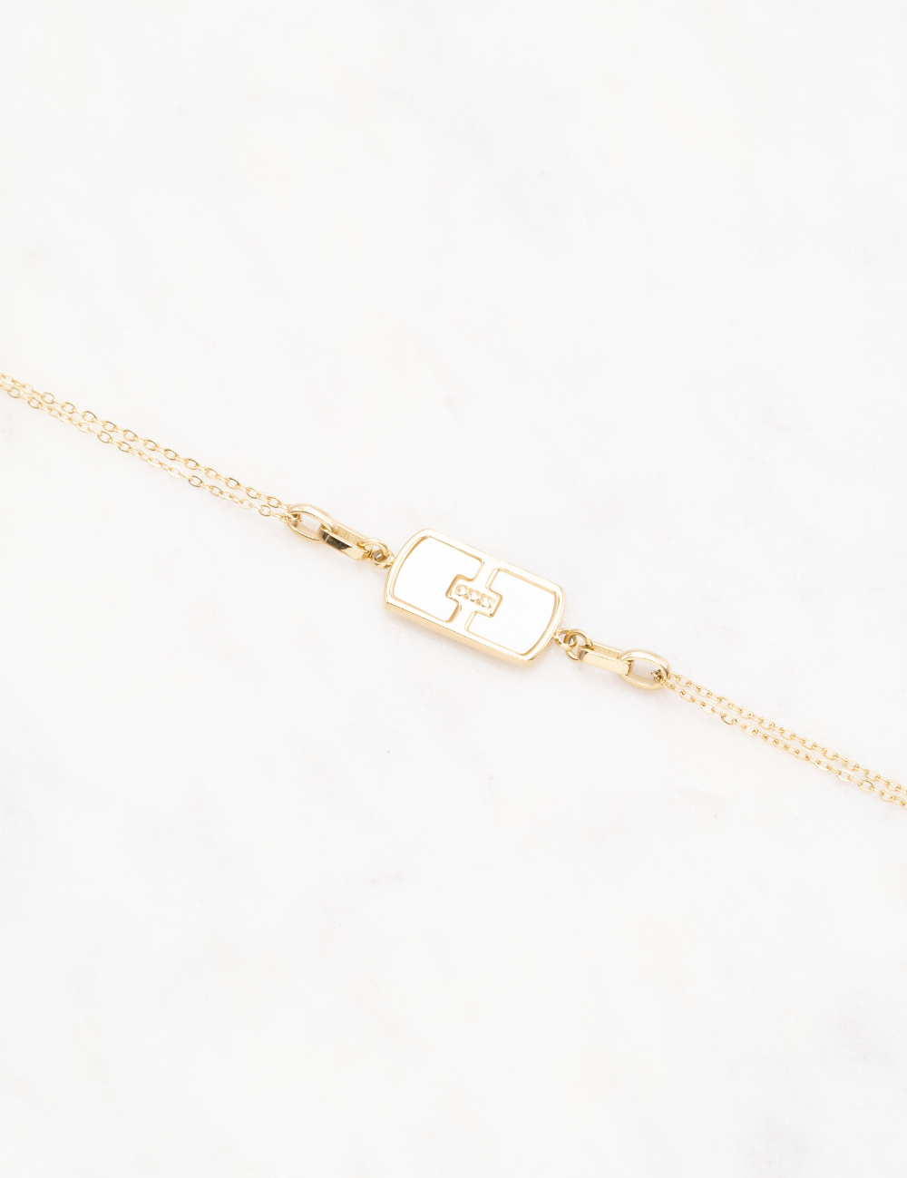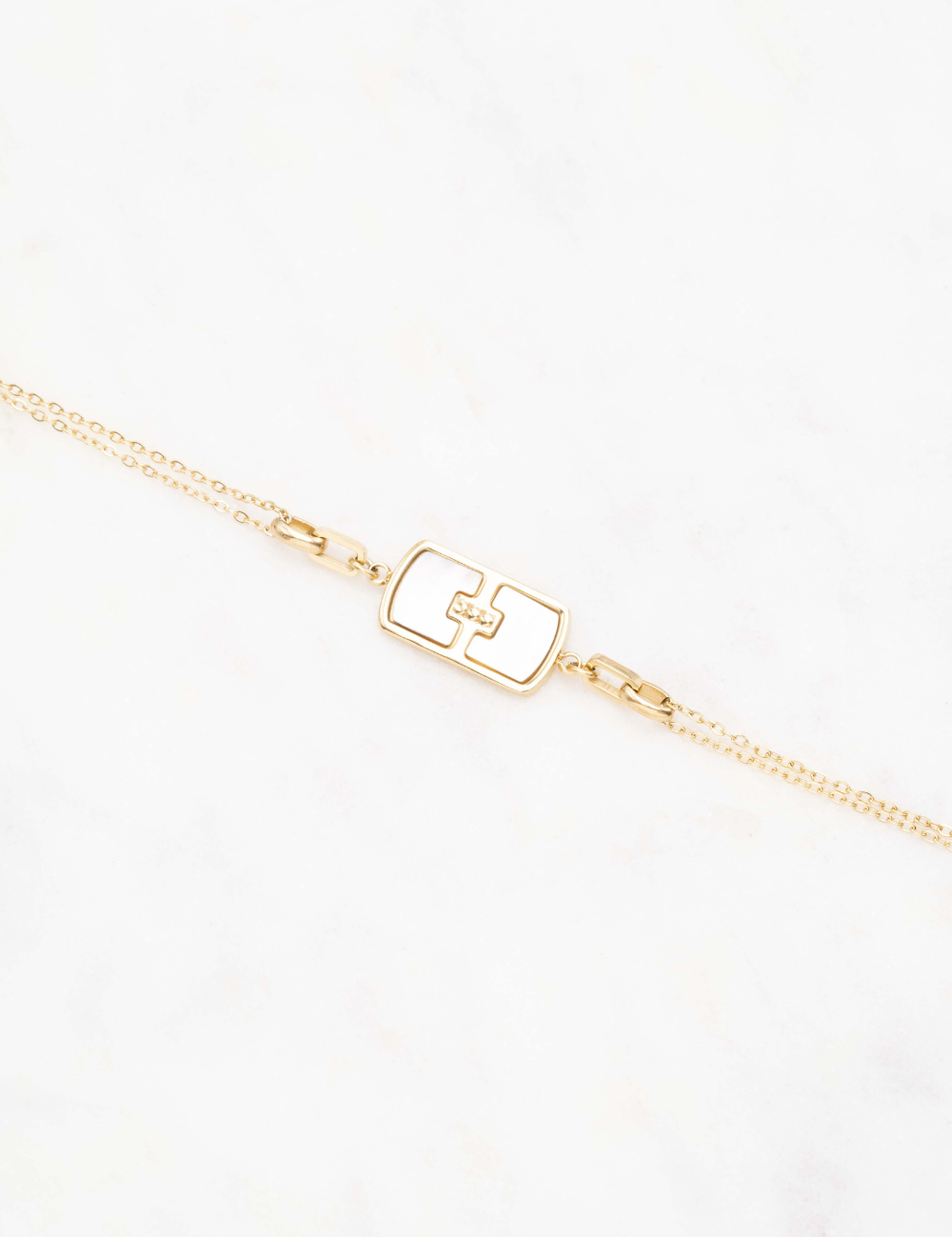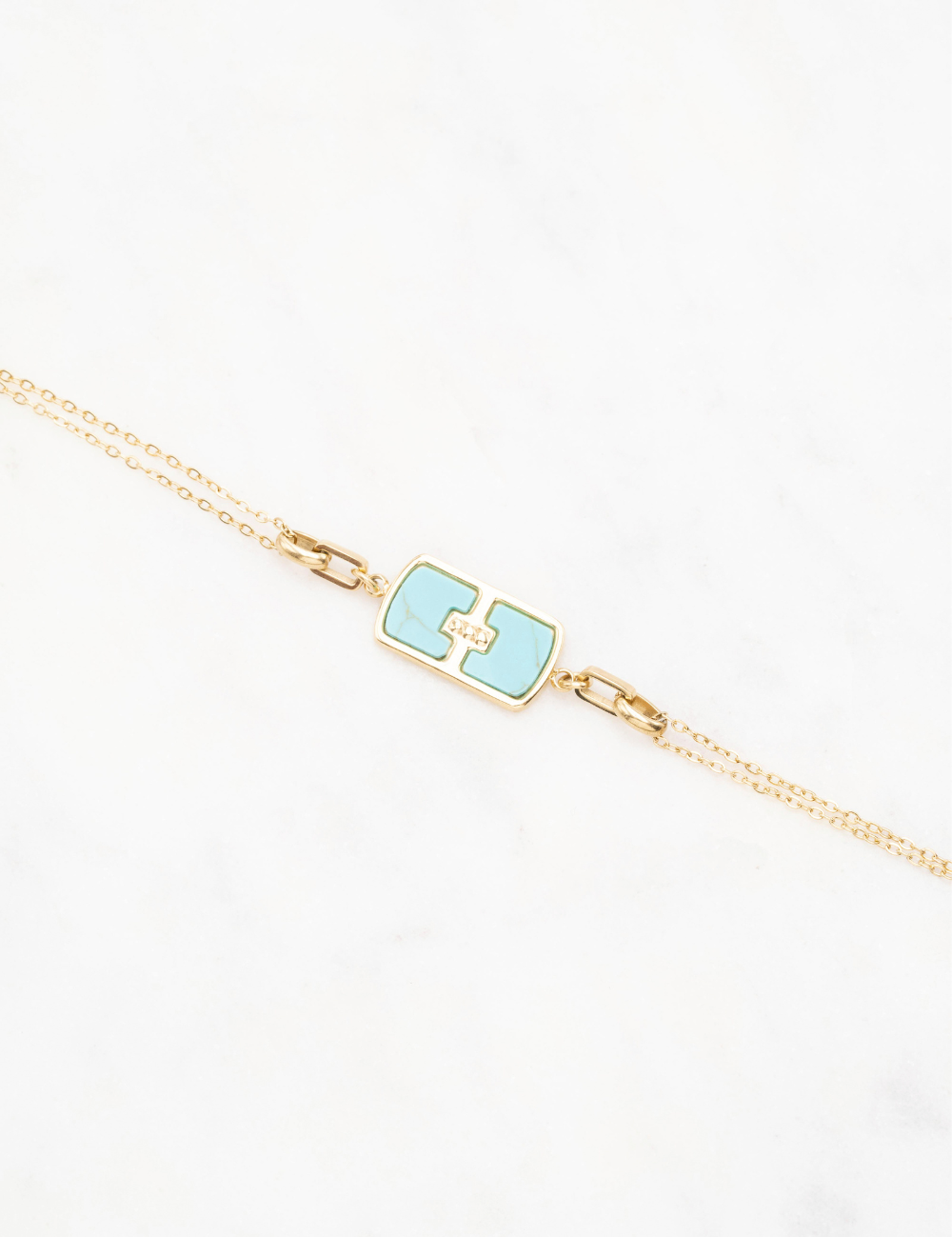 Bracelet réglable double rangs sur chaîne composé d' anneaux graphiques, d'une pièce rectangulaire sertie d'une pierre et d'un motif graphique au centre.