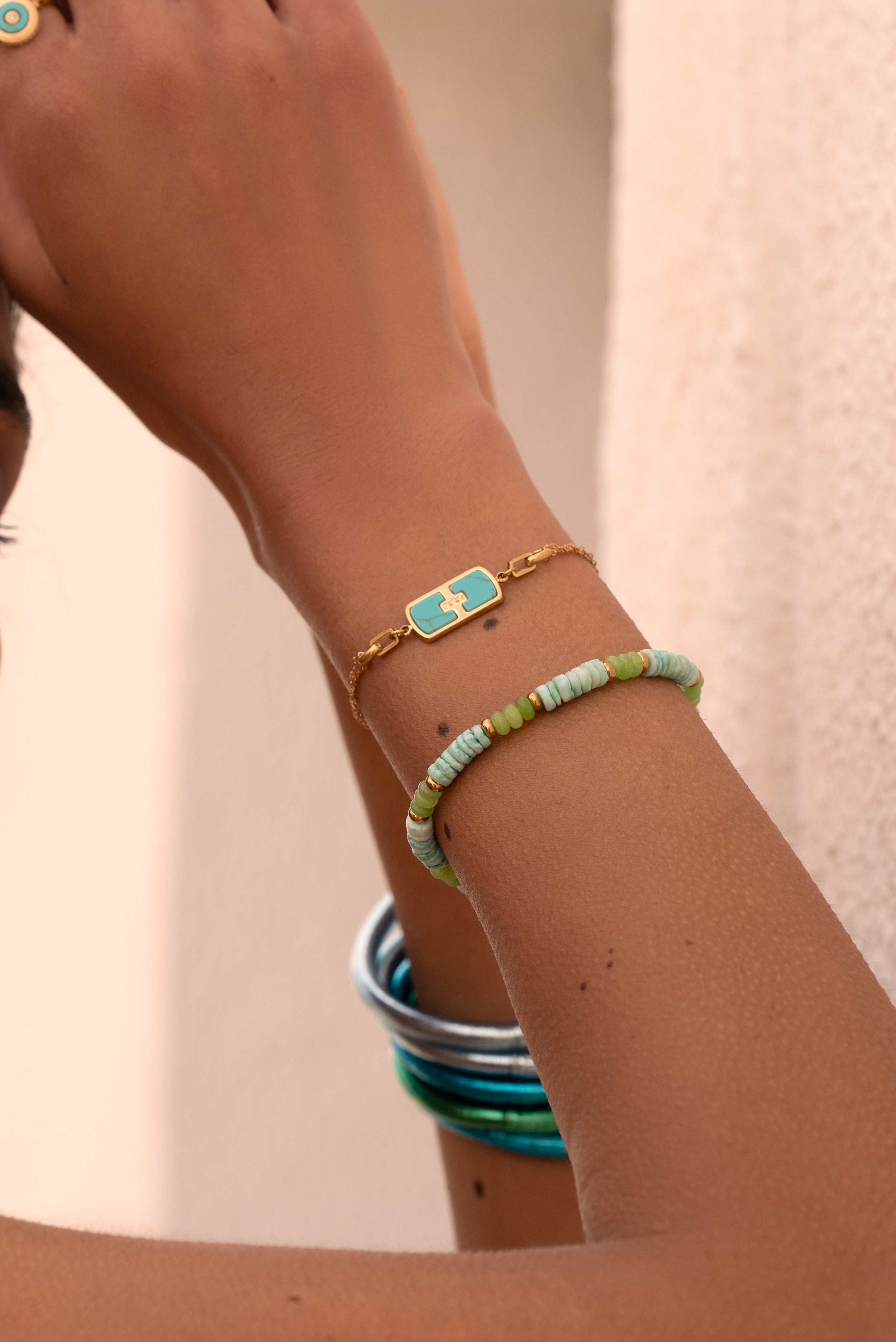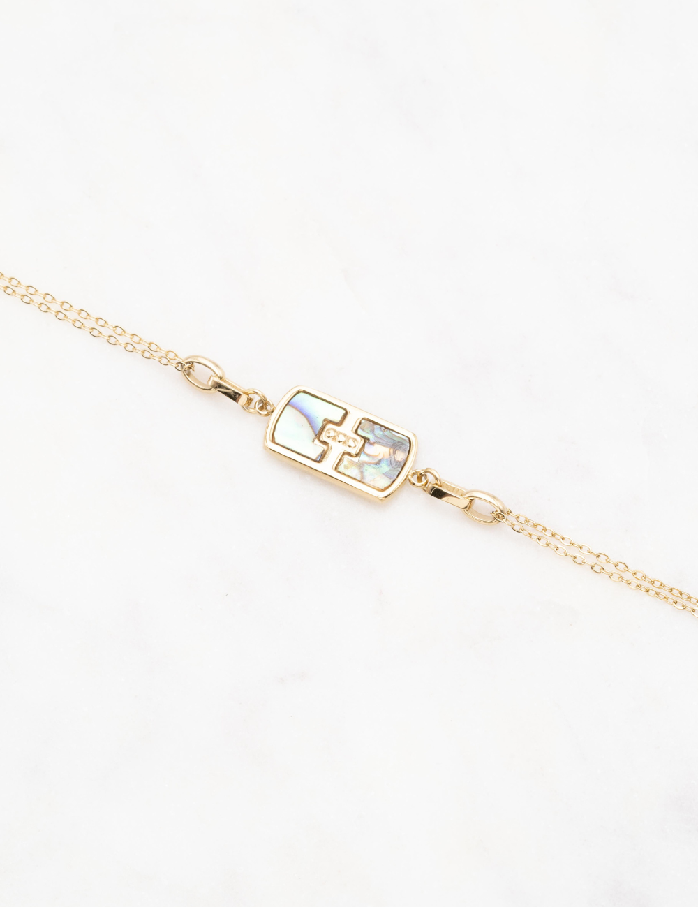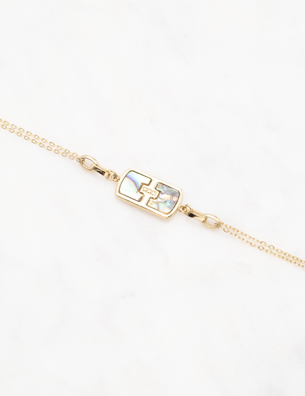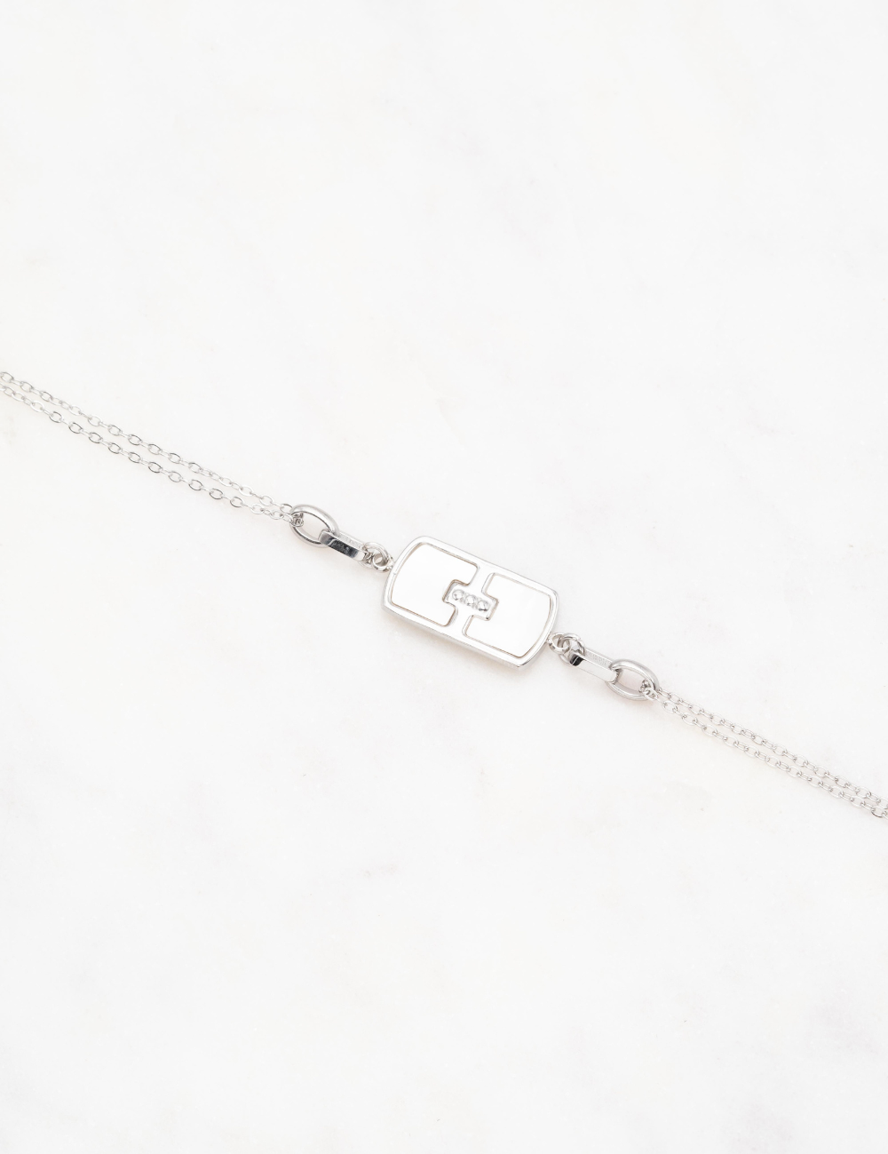 Bracelet réglable double rangs sur chaîne composé d' anneaux graphiques, d'une pièce rectangulaire sertie d'une pierre et d'un motif graphique au centre.