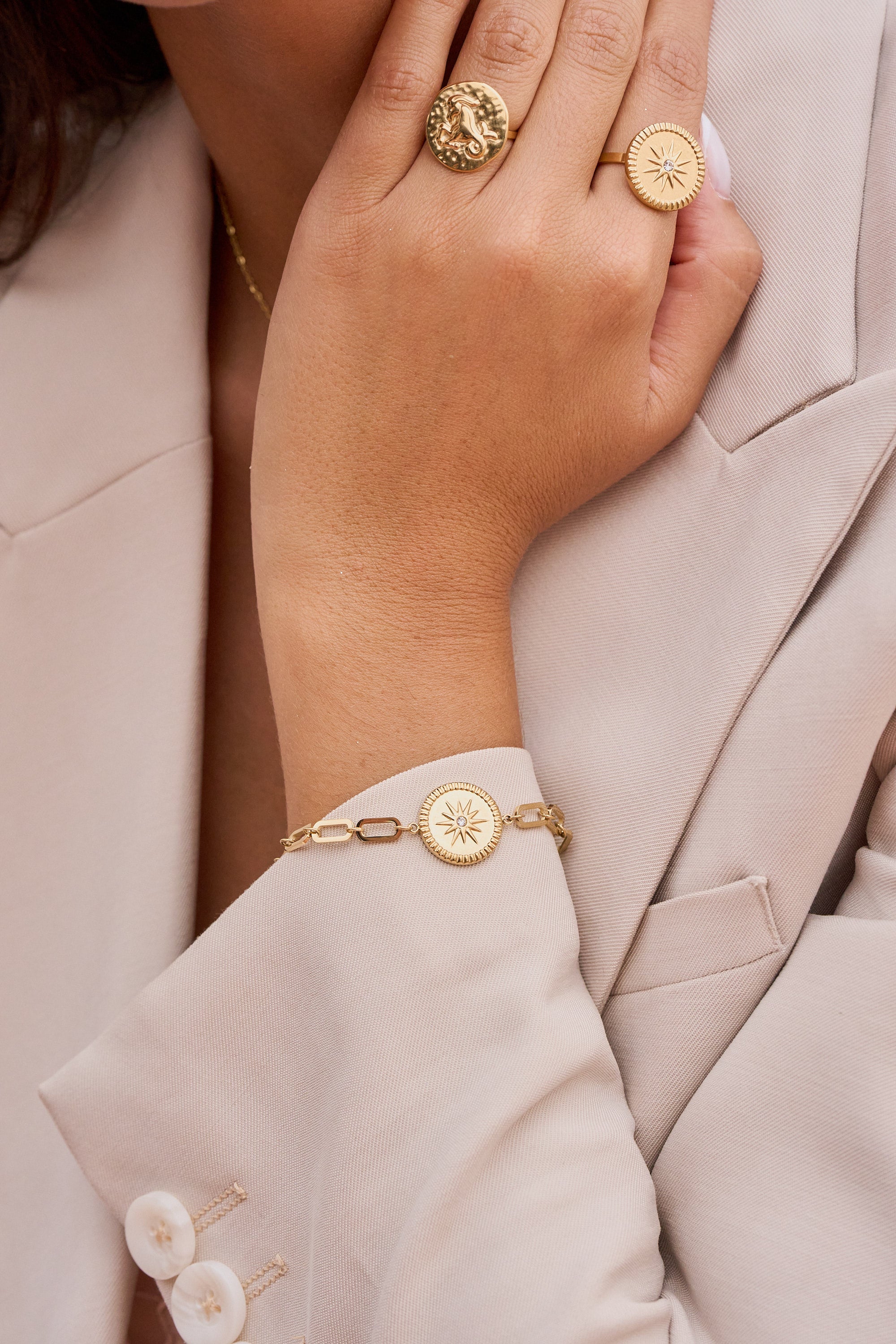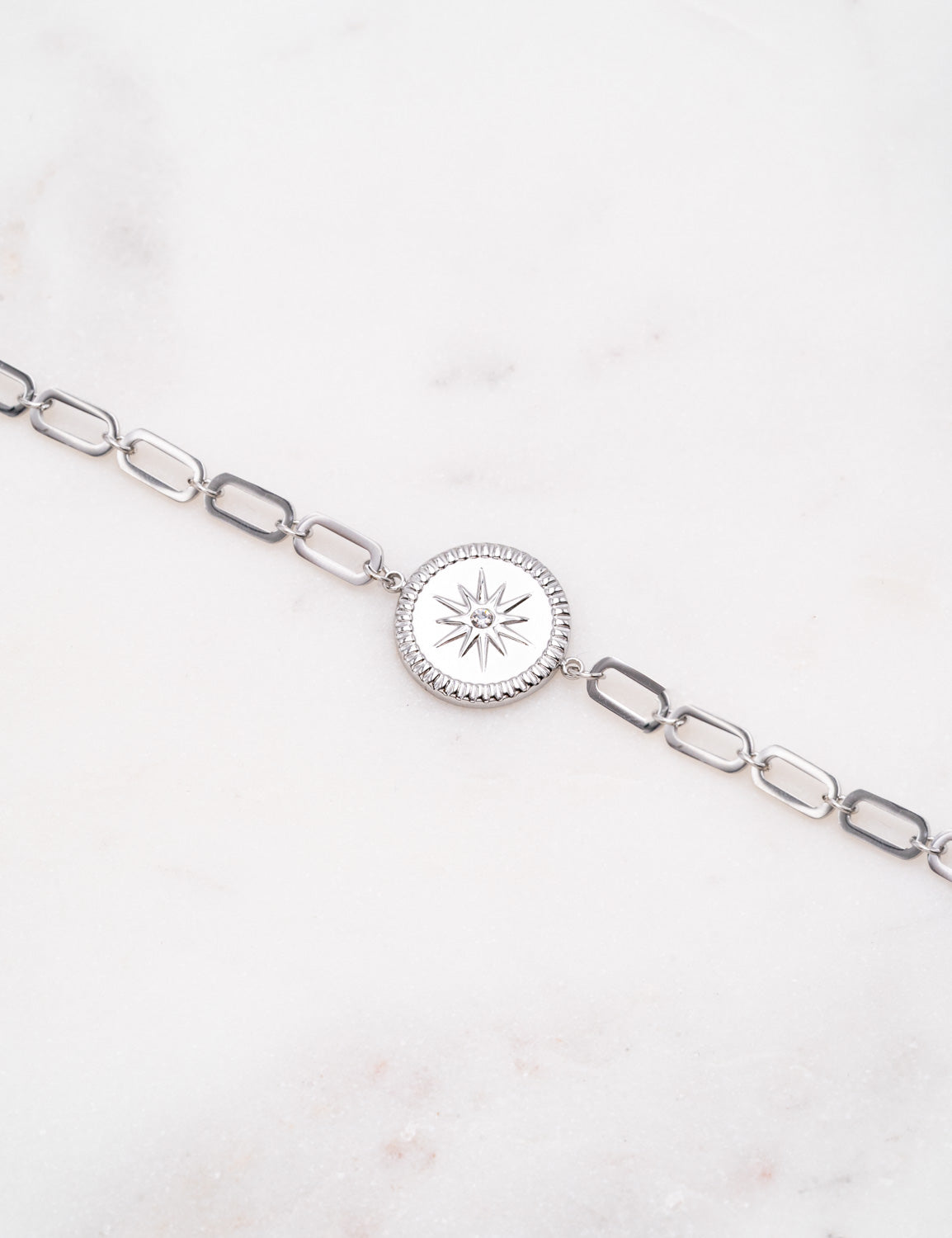 Bracelet réglable sur chaine avec des maillons composé d'une pièce graphique avec un motif étoilé serti d'un strass. Fermoir mousqueton et chainette de réglage.