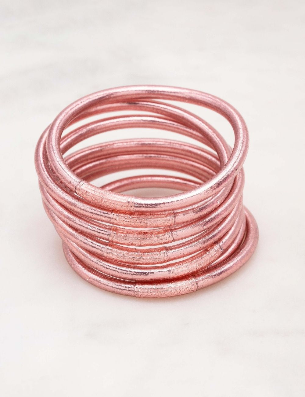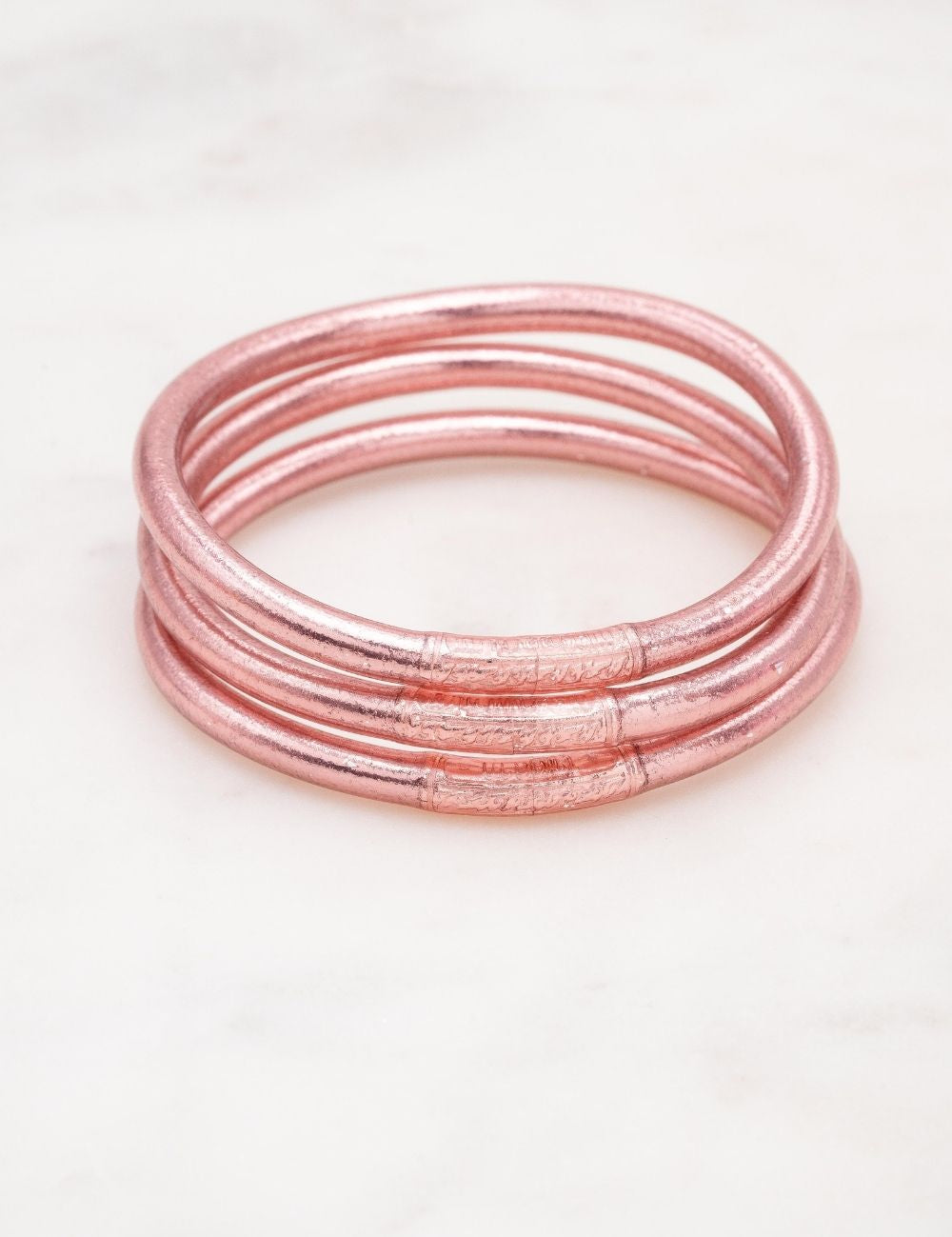 Jonc souple transparent rempli de feuilles argentées décoratives, scellé avec un mantra gravé "Bonheur, Chance, Fortune et Amour" en thaïlandais