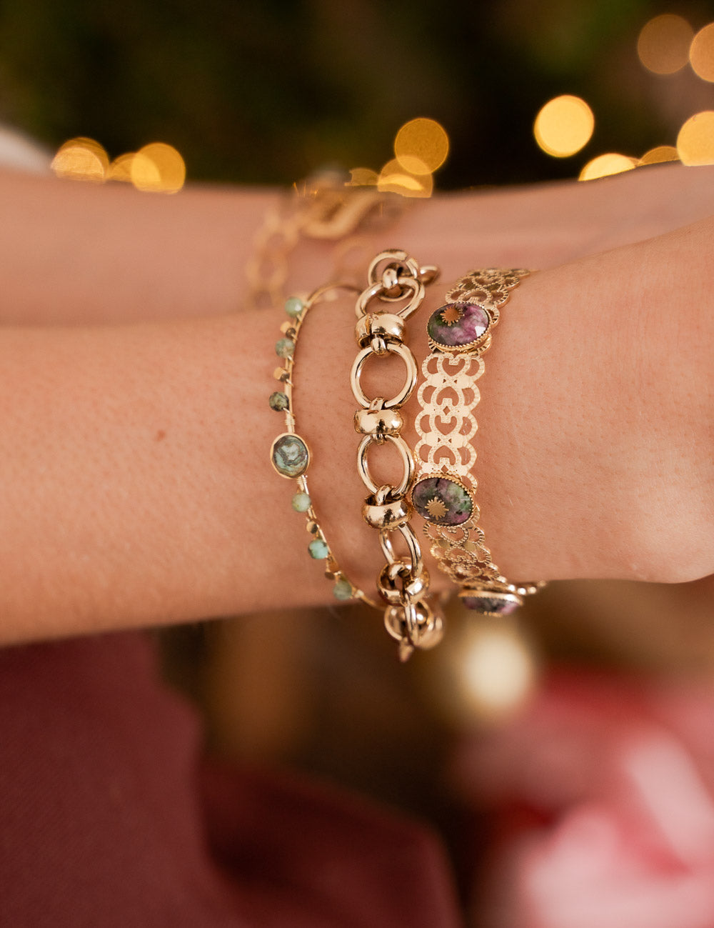 - Pierres naturelles: Nacre blanche, onyx, rhodonite; turquoise africaine, rubis zoisite, labradorite, cornaline, amazonite.