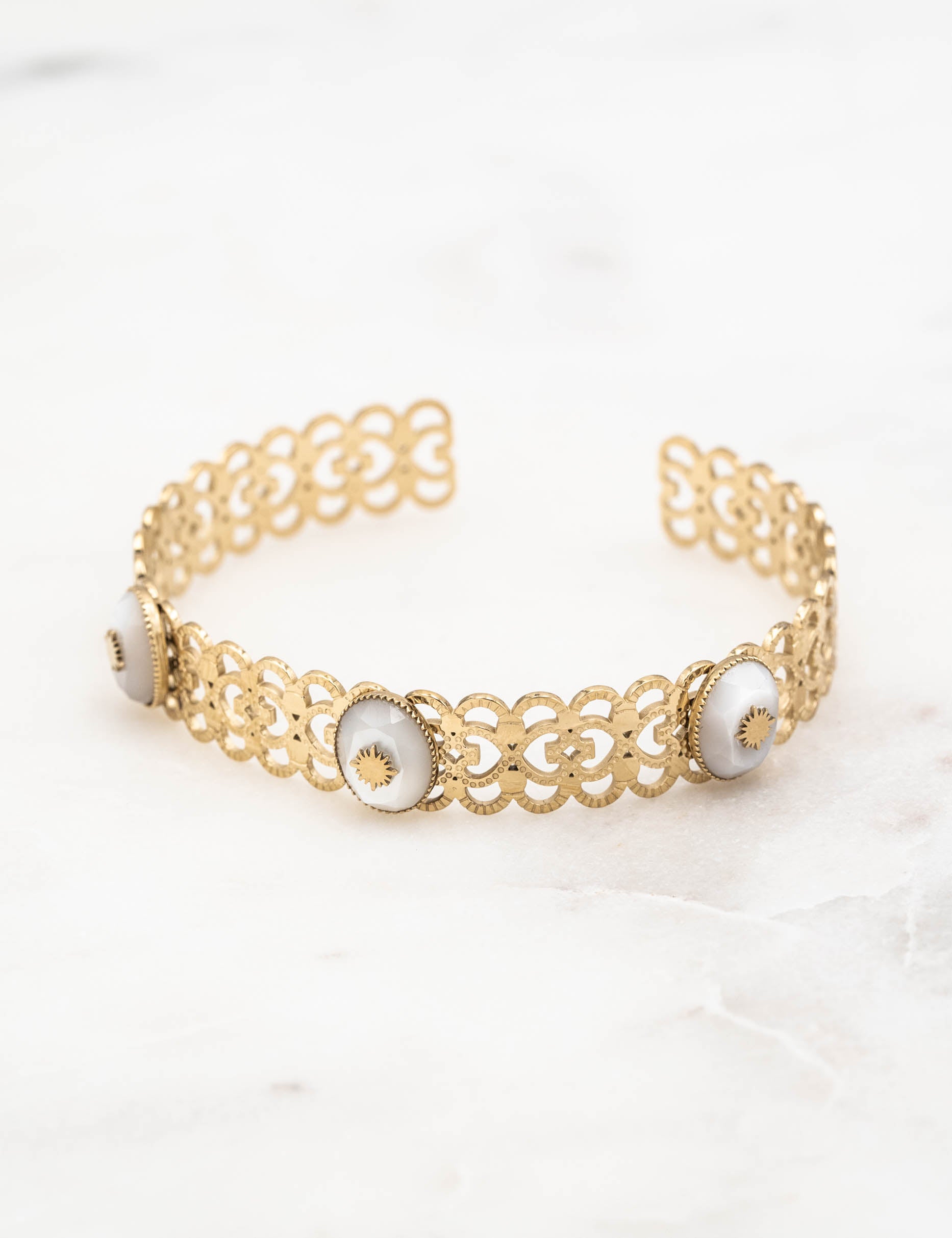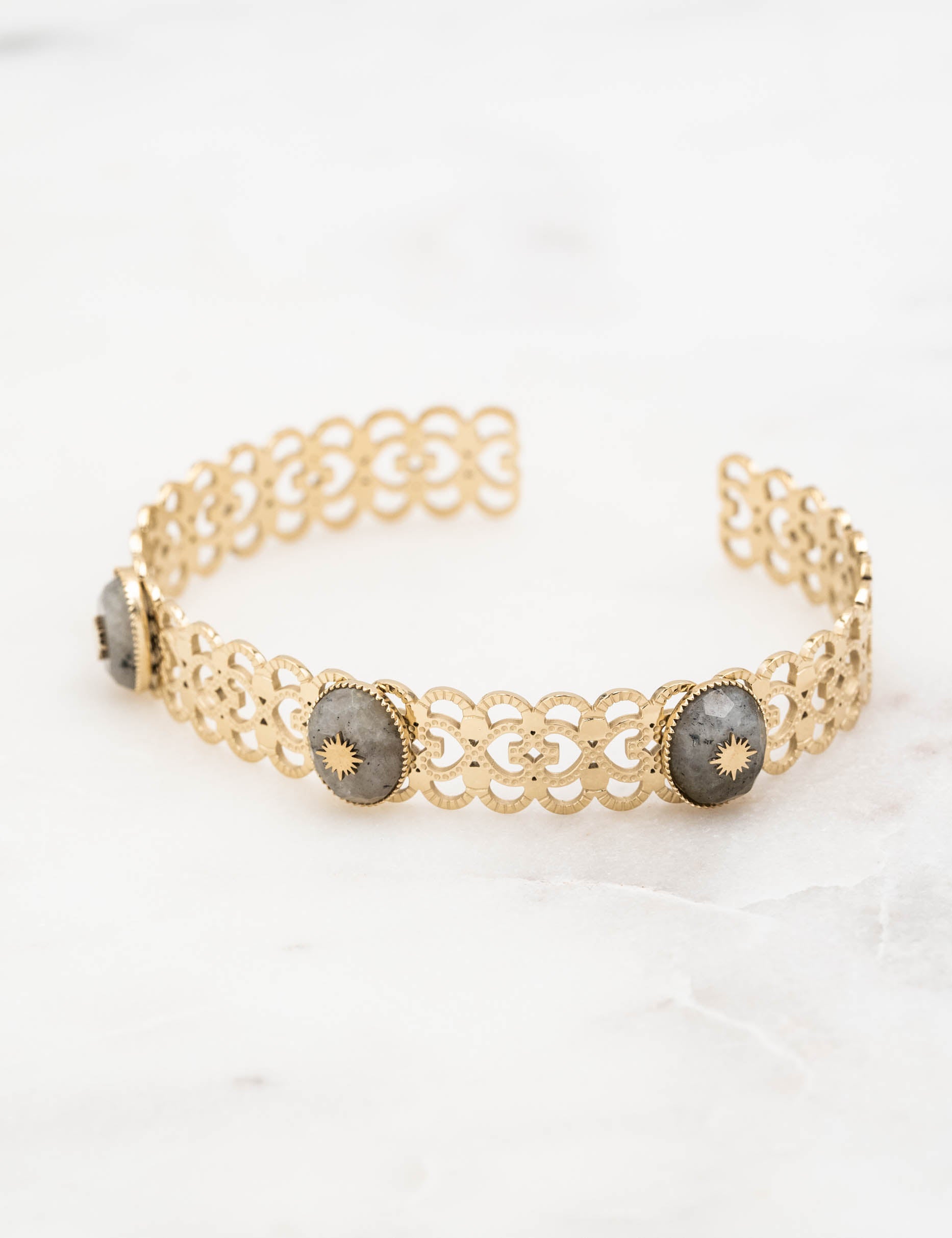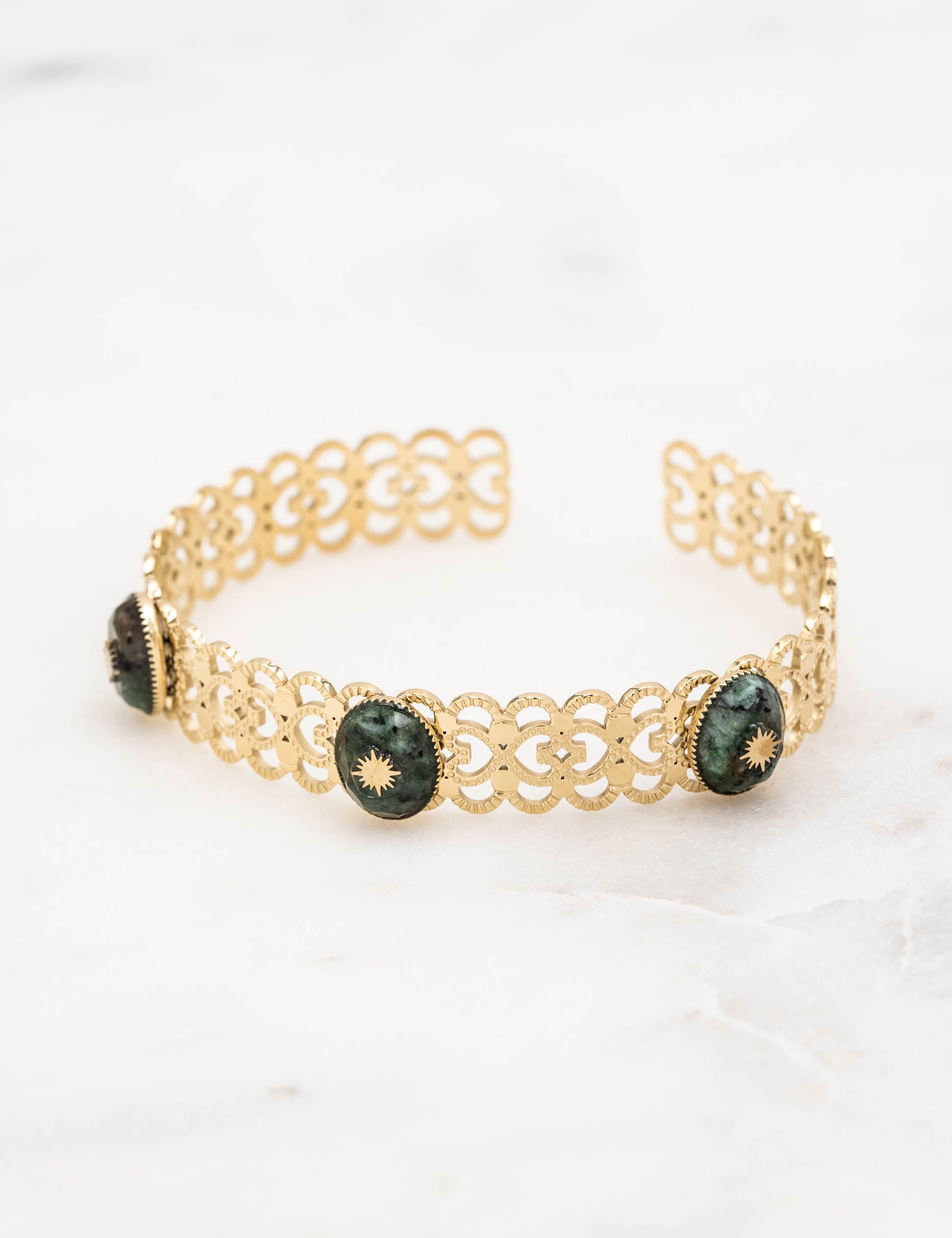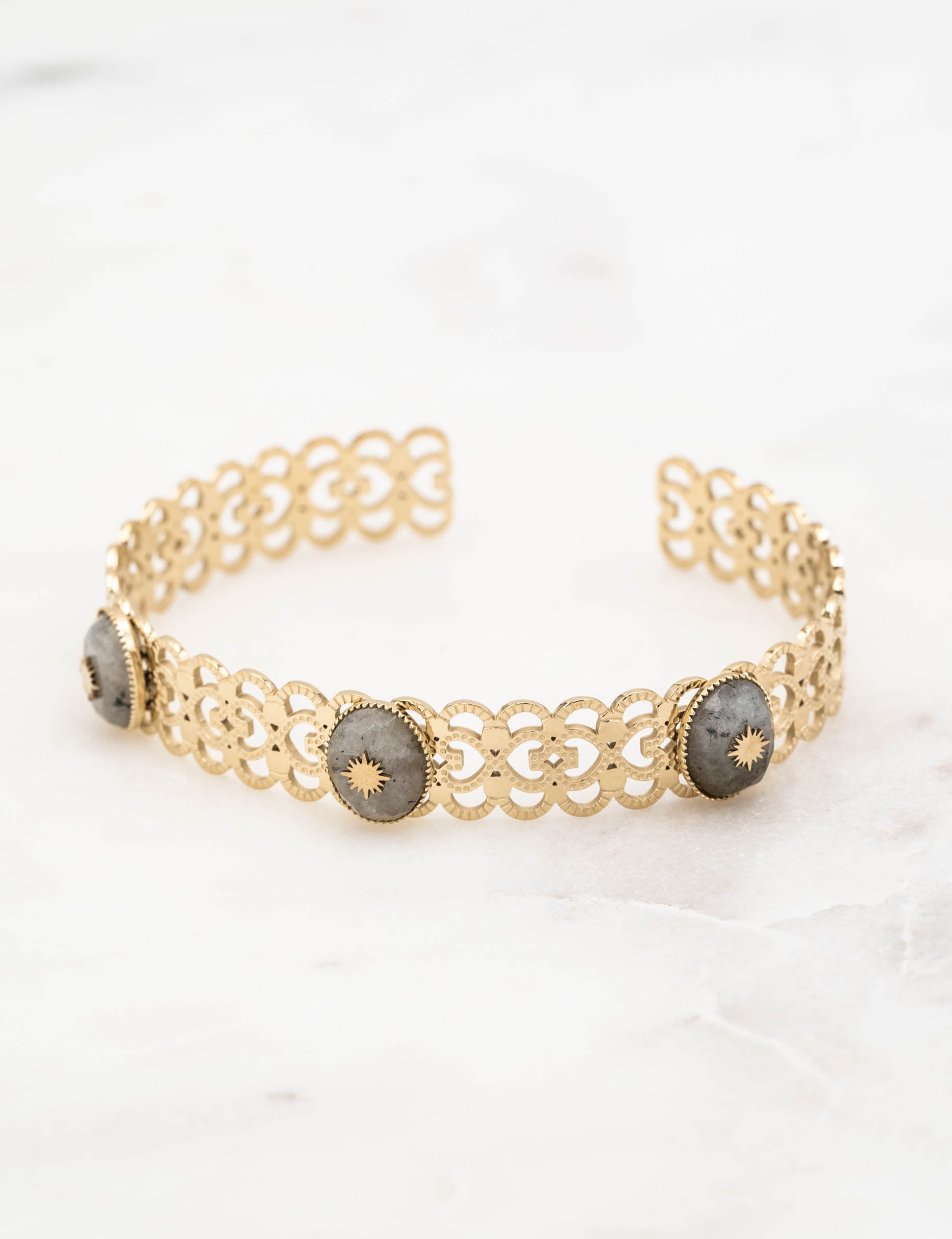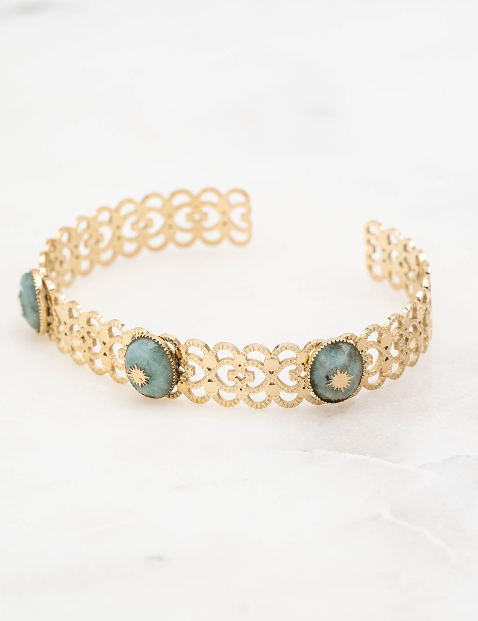 Jonc ajustable entrelacé en forme de coeur composé de trois pierres naturelles ovales avec un soleil engravé.