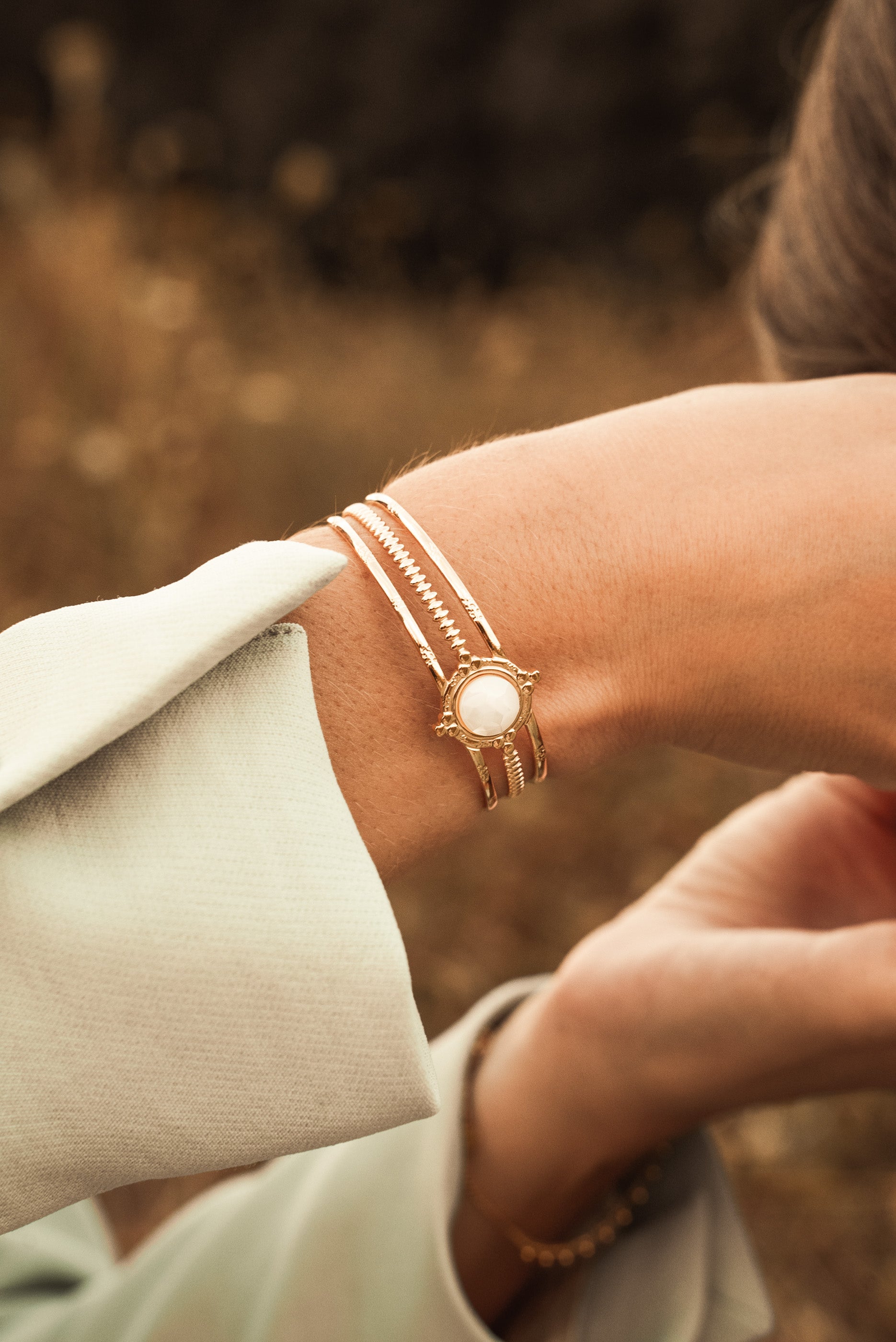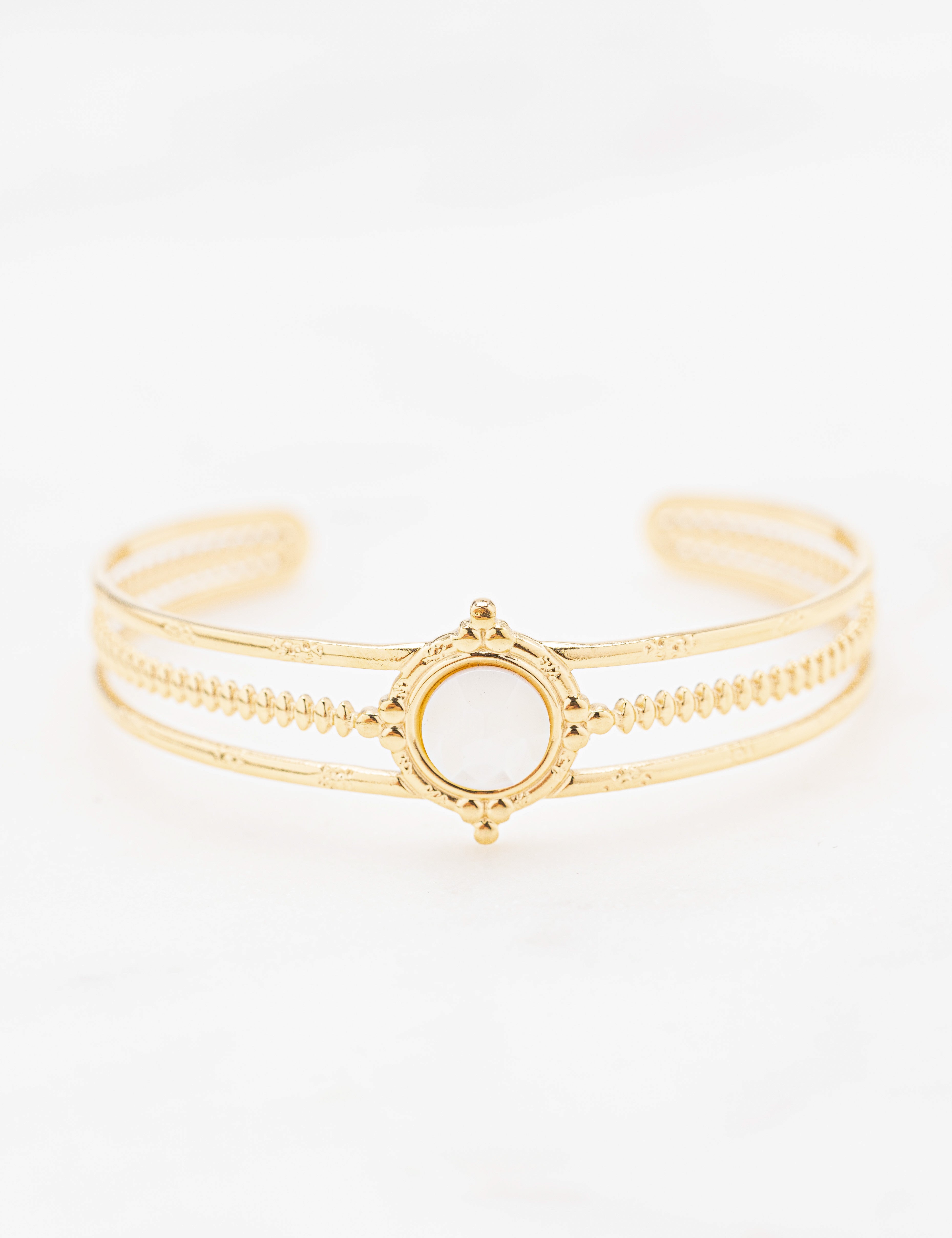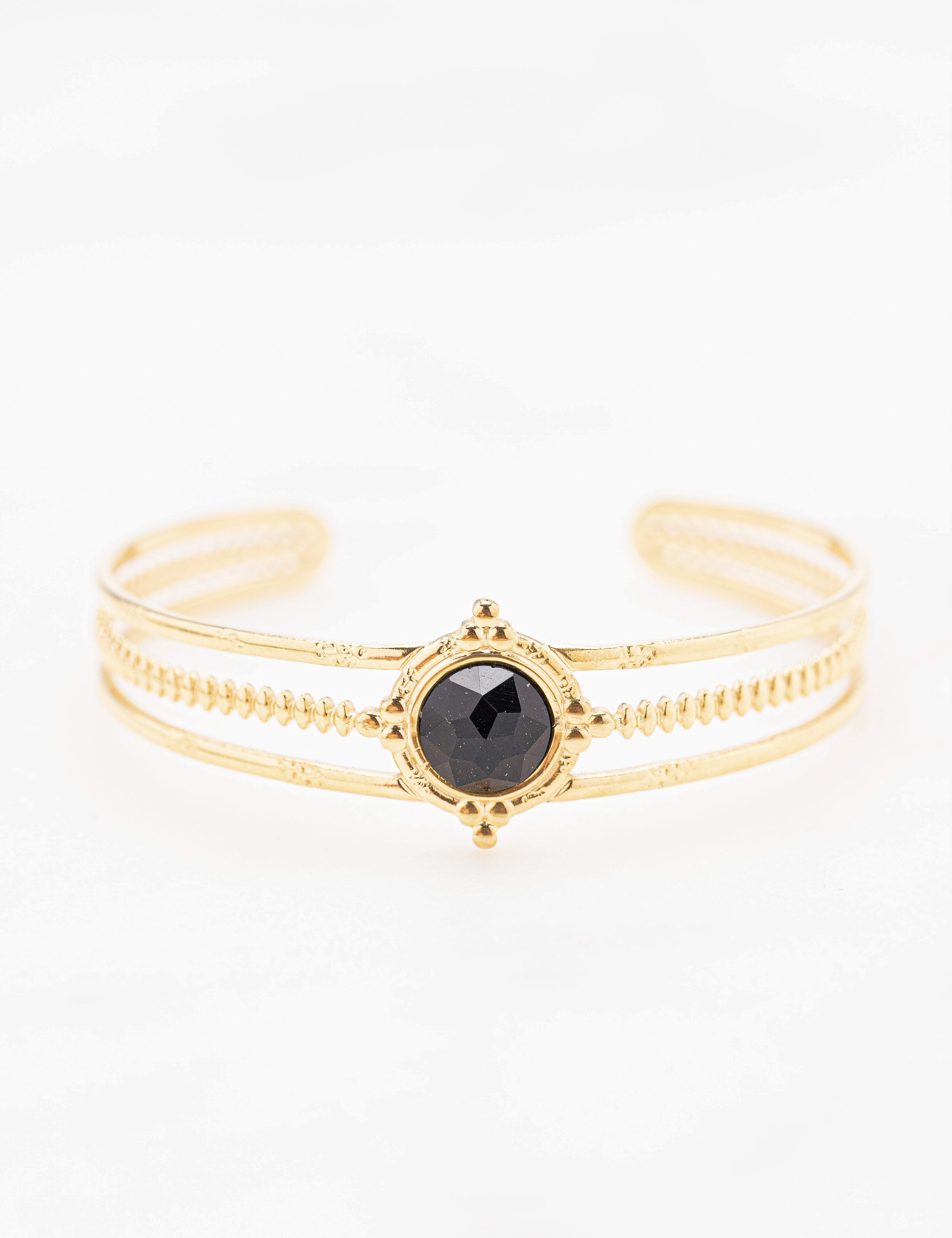 Bracelet malléable type jonc graphique multirangs texturés serti d'une pierre naturelle. Les pierres naturelles: Onyx et Nacre.