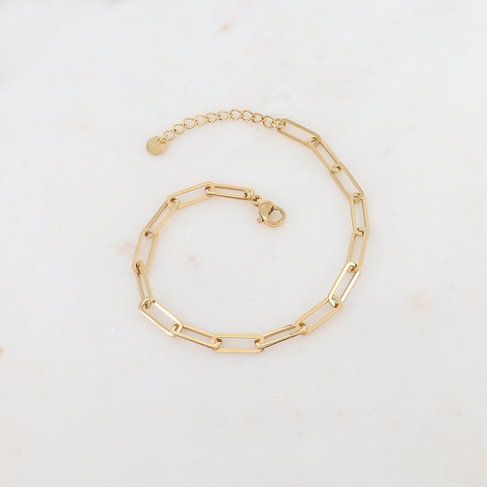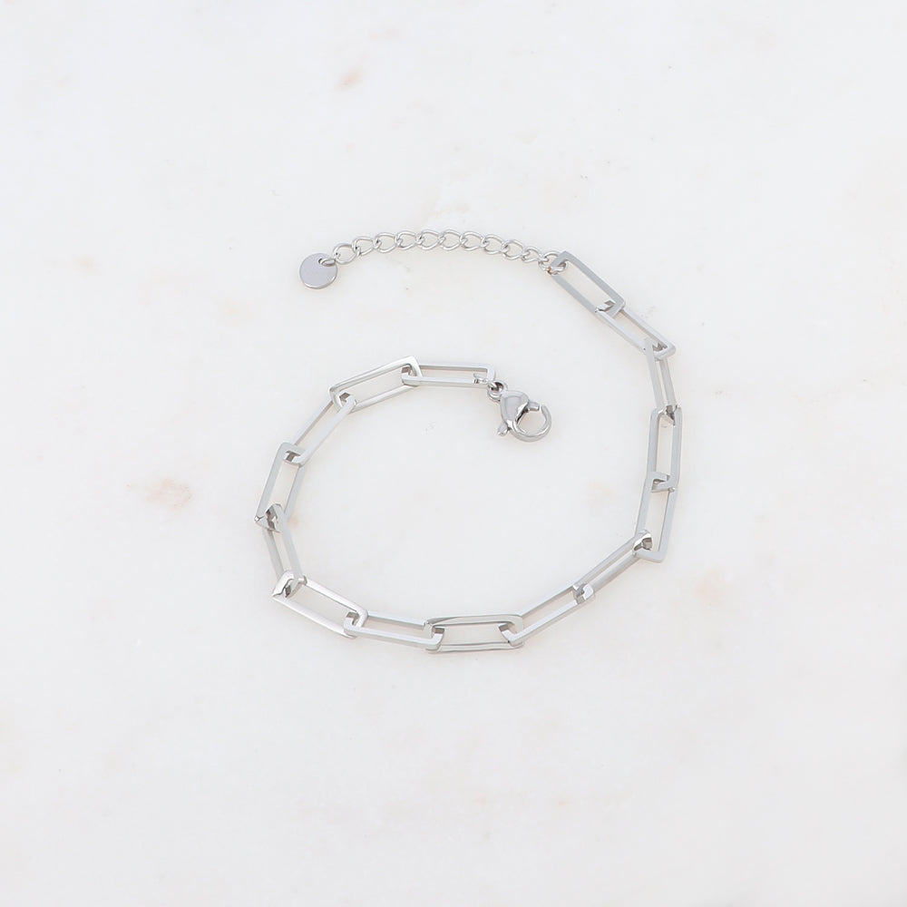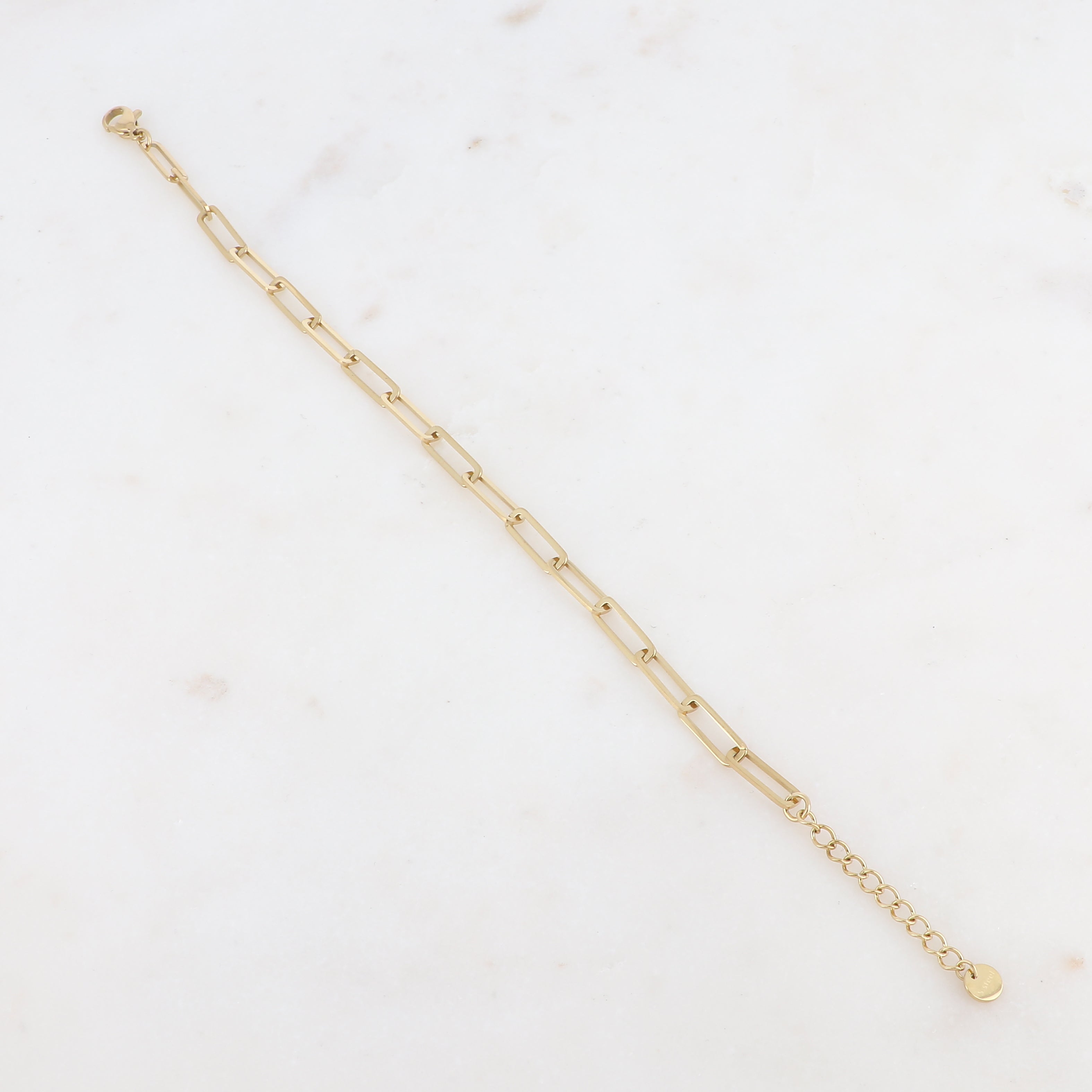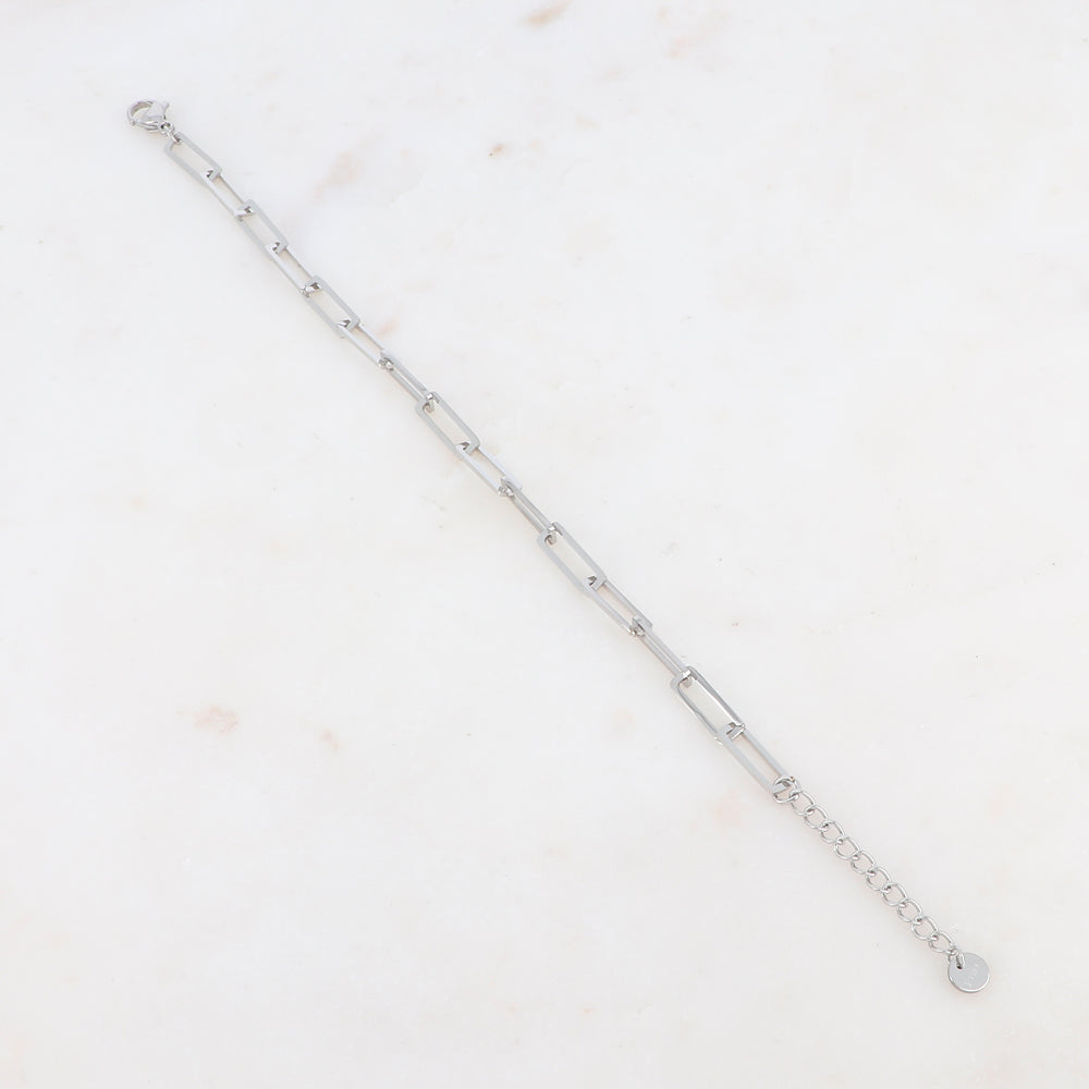 Bracelet réglable sur chaîne en maille rectangulaire. Fermoir mousqueton et chainette de réglage.