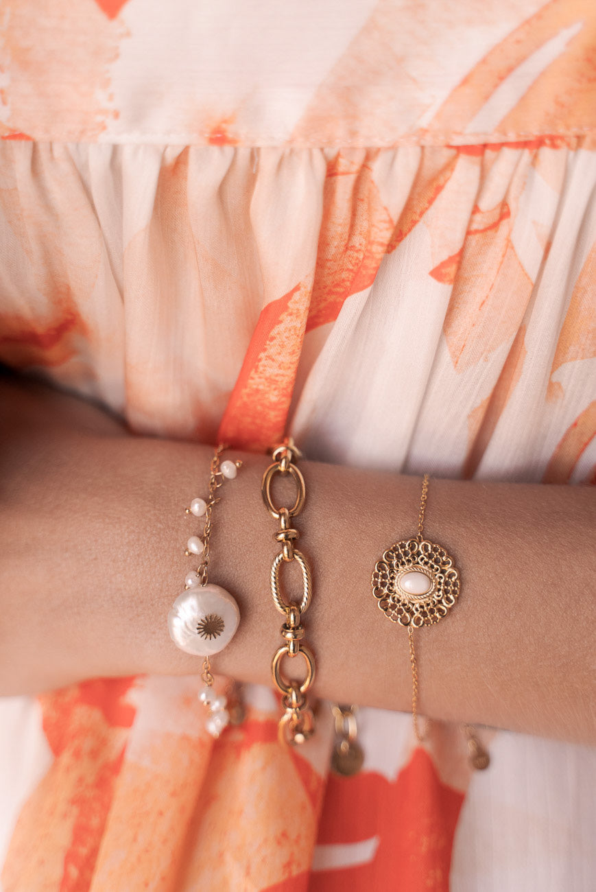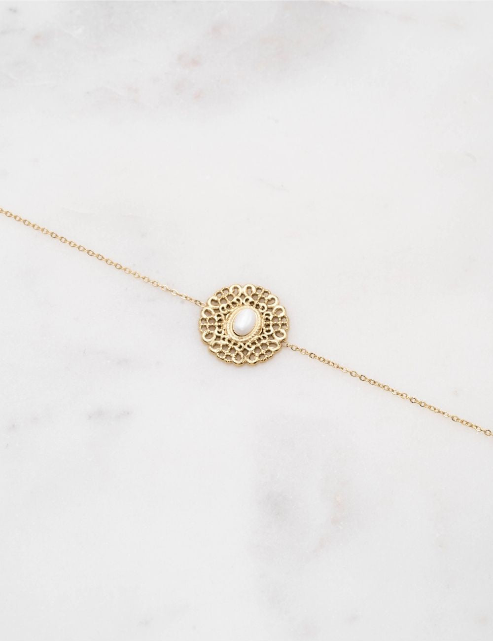 Bracelet réglable sur chaine composé d'un pendant ajouré , stylisé et serti d'une nacre. Fermoir mousqueton et chainette de réglage.