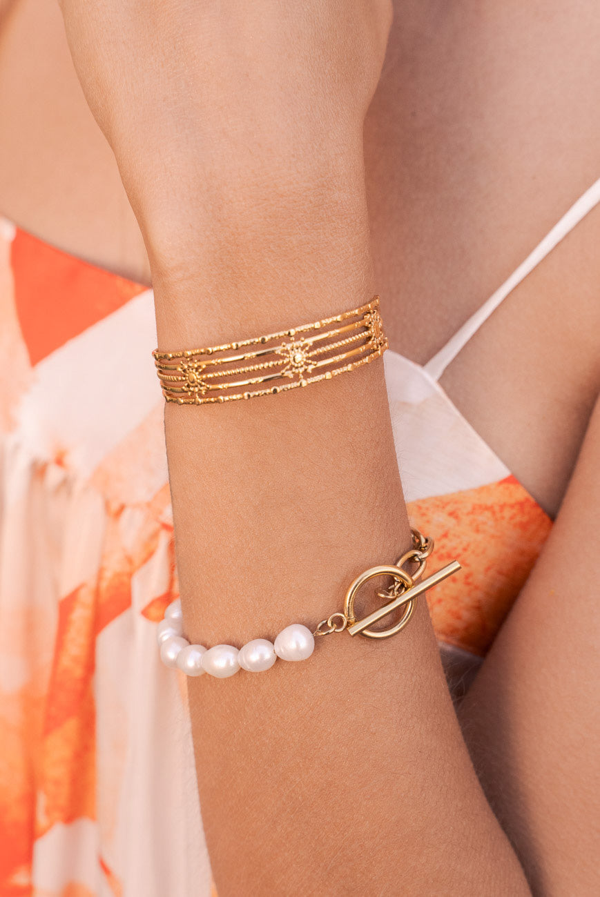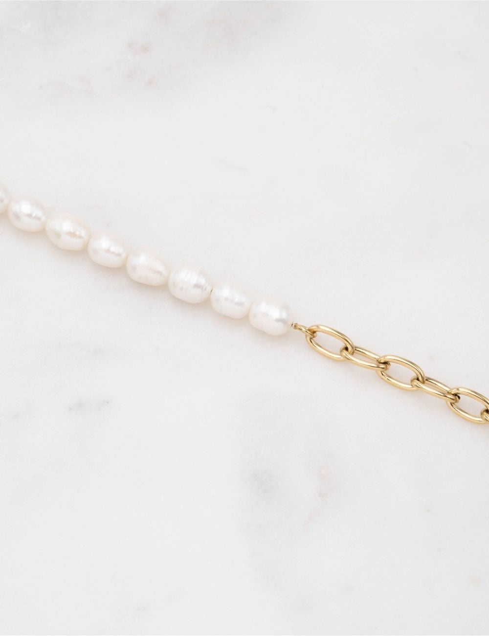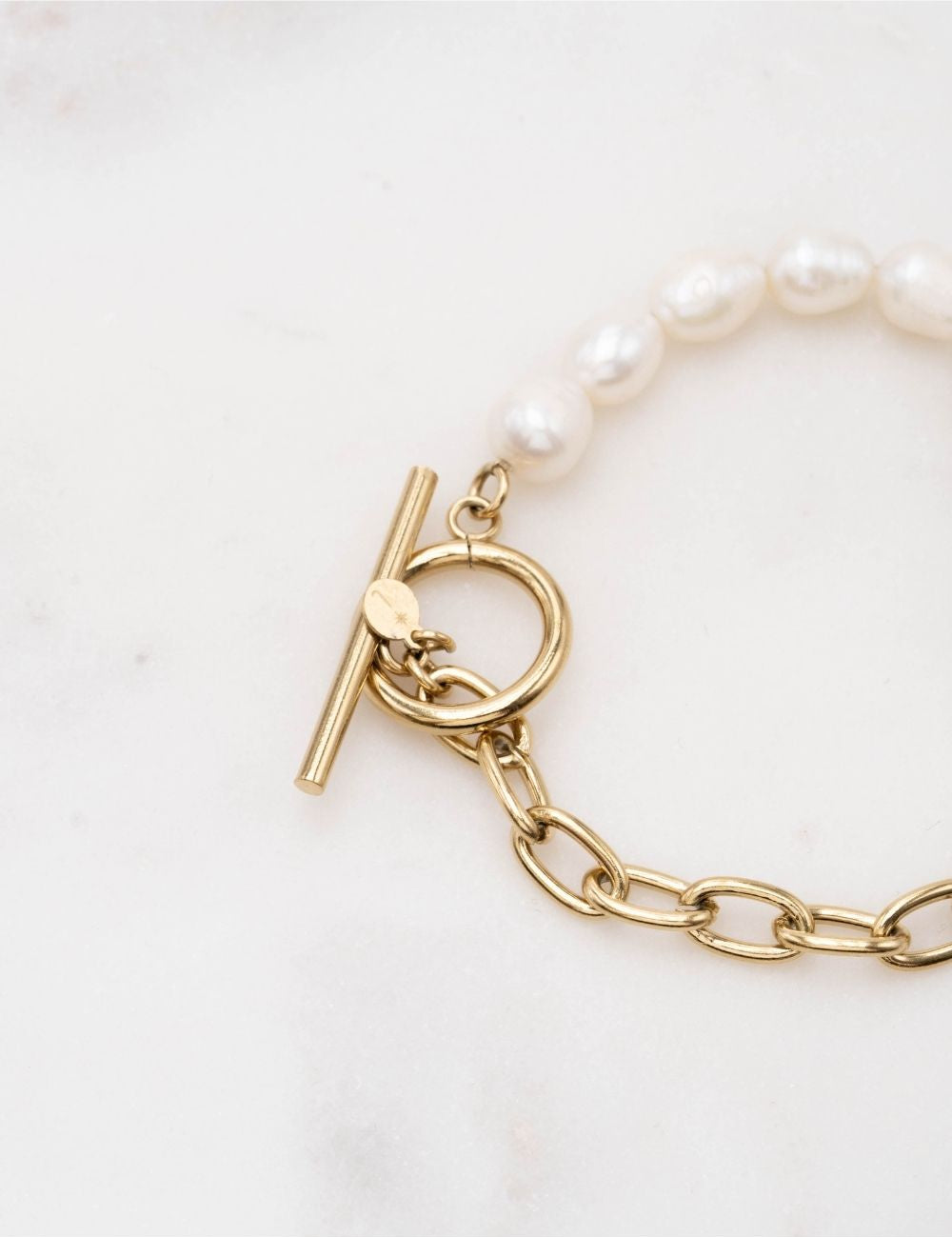 Bracelet sur chaine bi matière: des maillons d'un côté et des perles d'eau douce d'un côté. Fermoir T (Toggle).