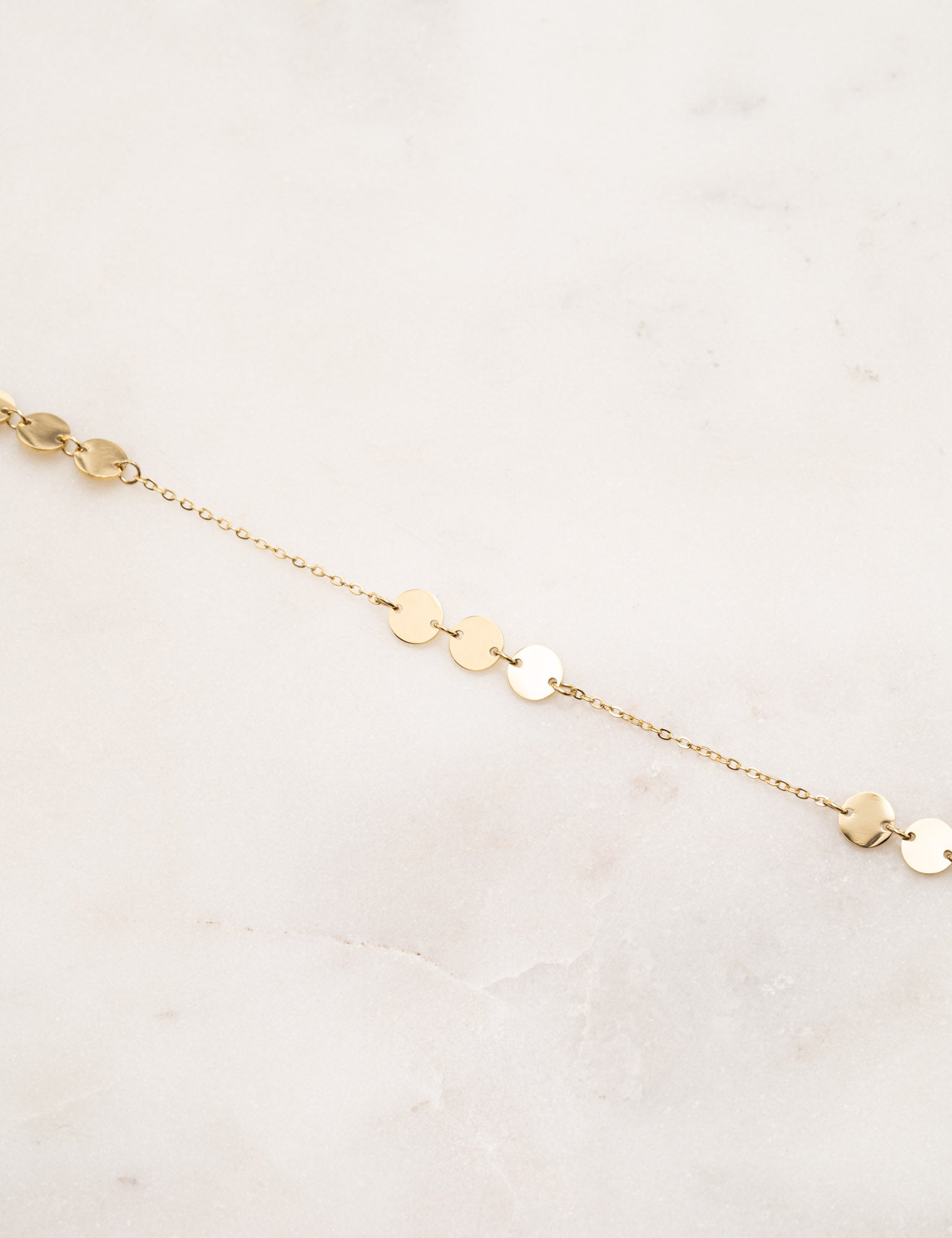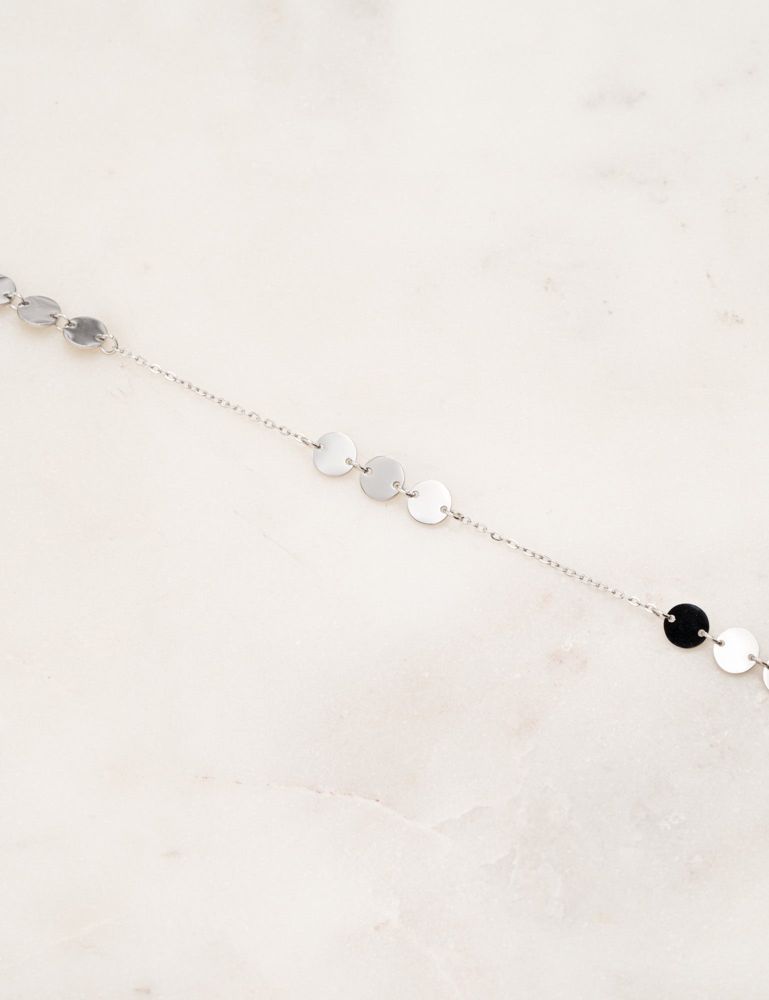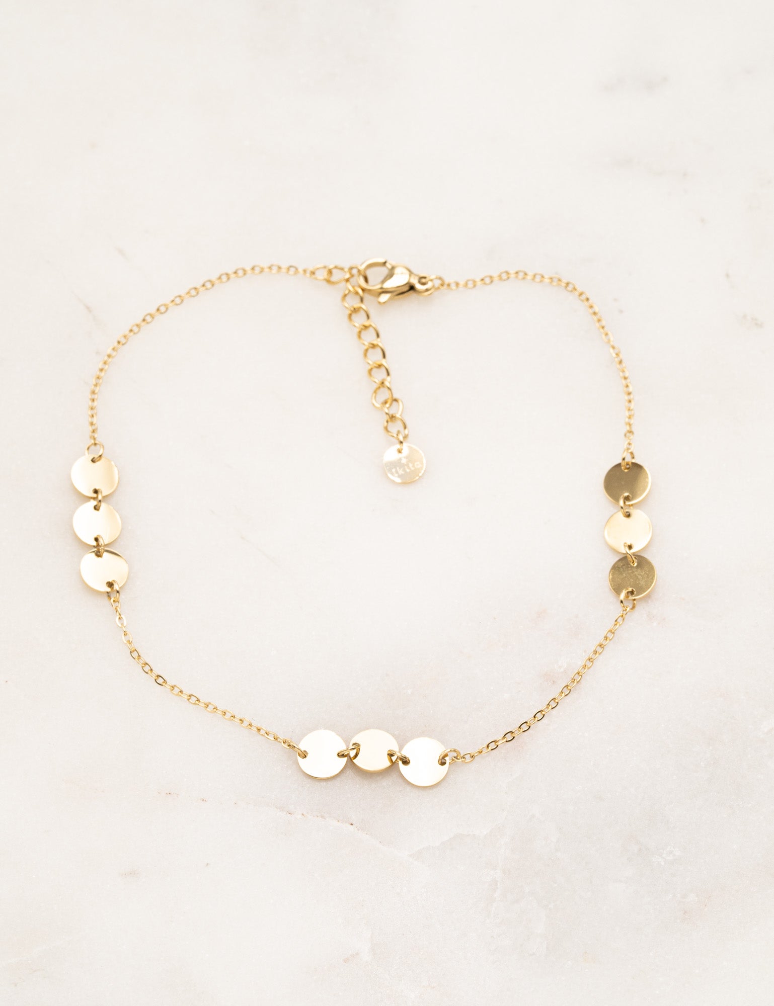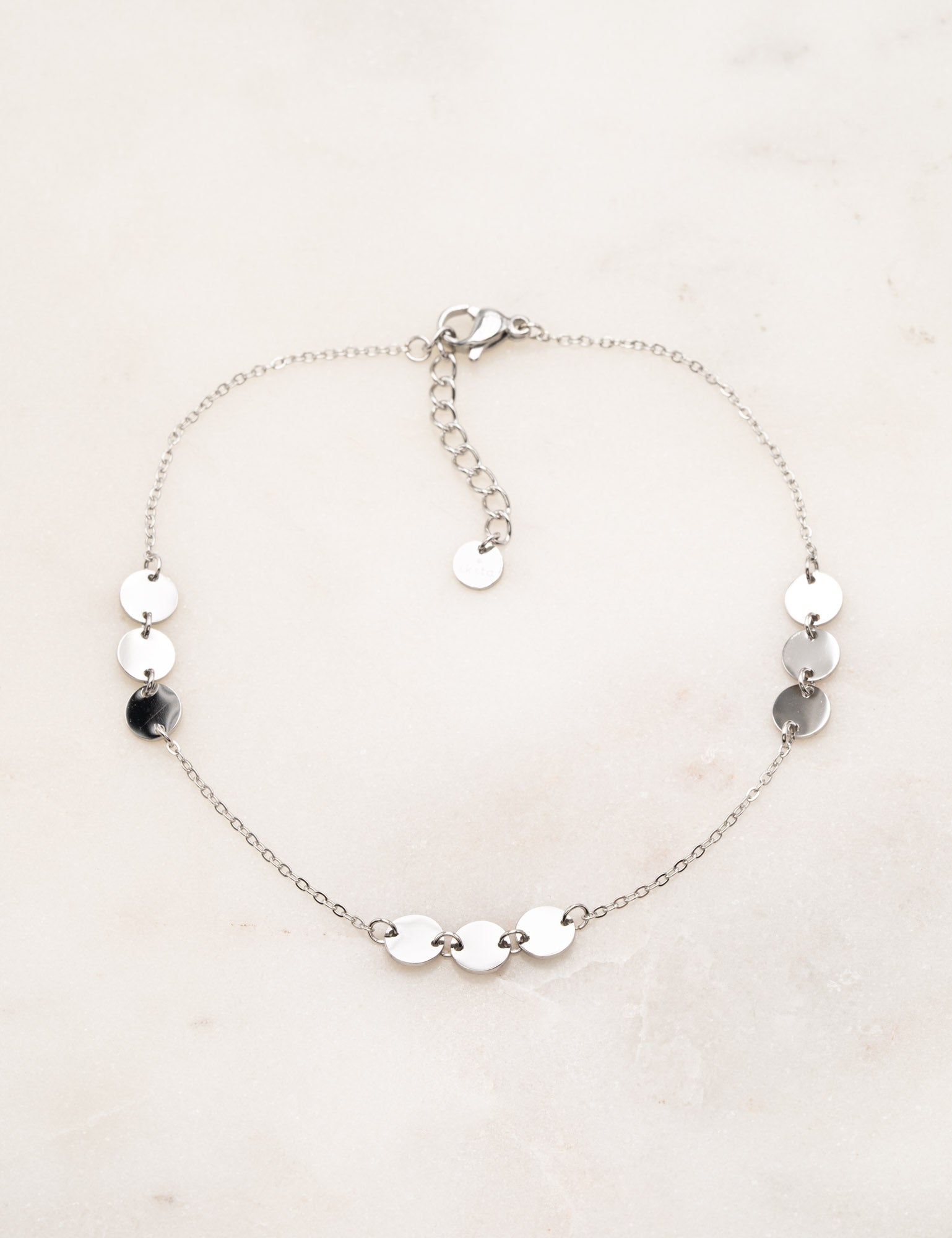 Bracelet type chevillère réglable sur chaine composé de pièces graphiques rondes avec fermoir mousqueton et chaînette de réglage.