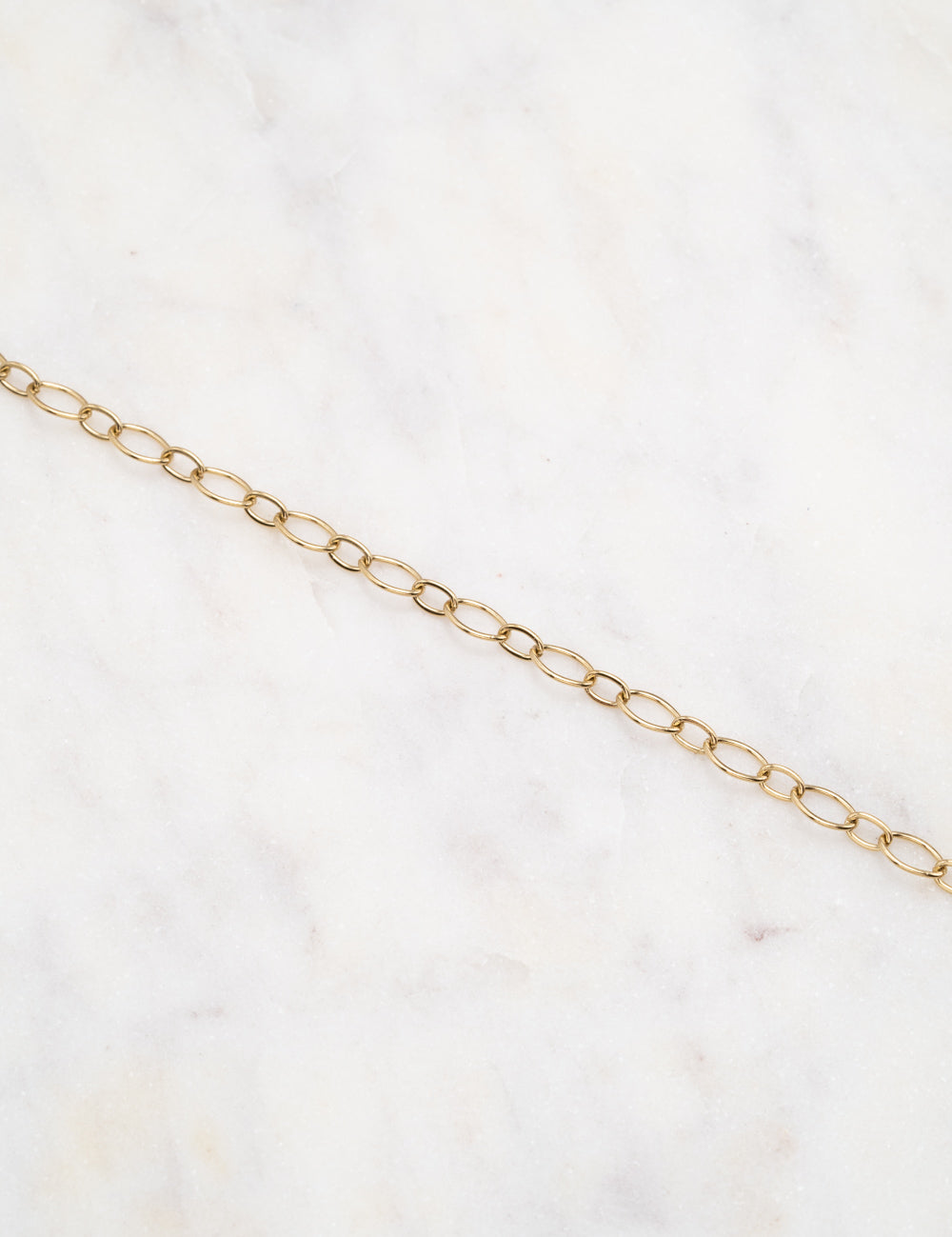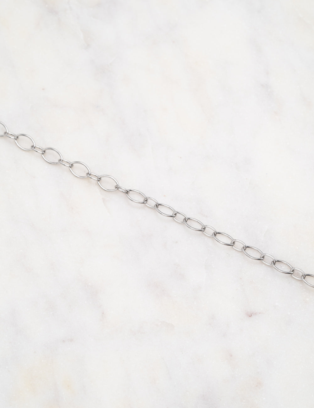 Bracelet type chevillère réglable sur chaine maillons texturés. Fermoir mousqueton et chaînette de réglage.