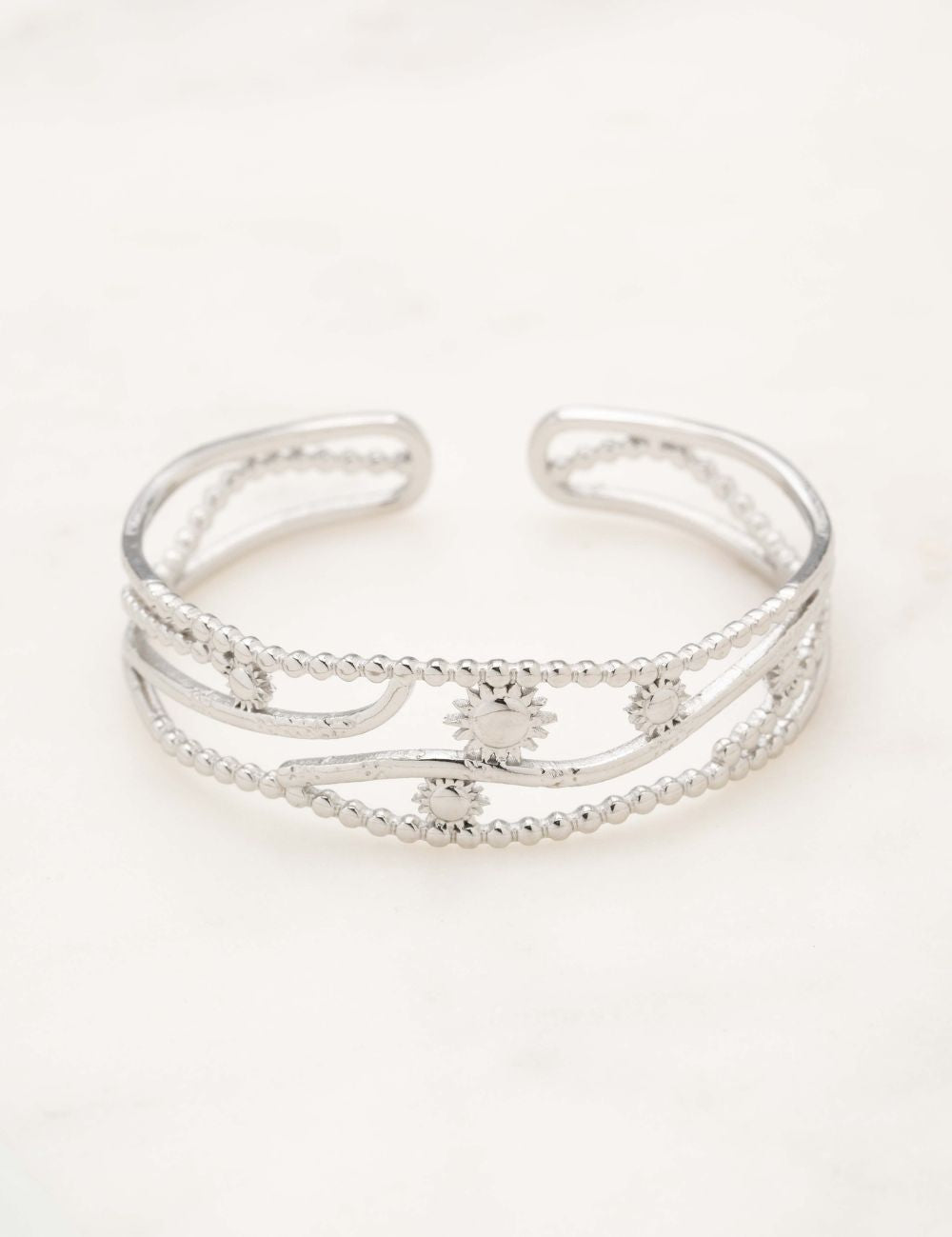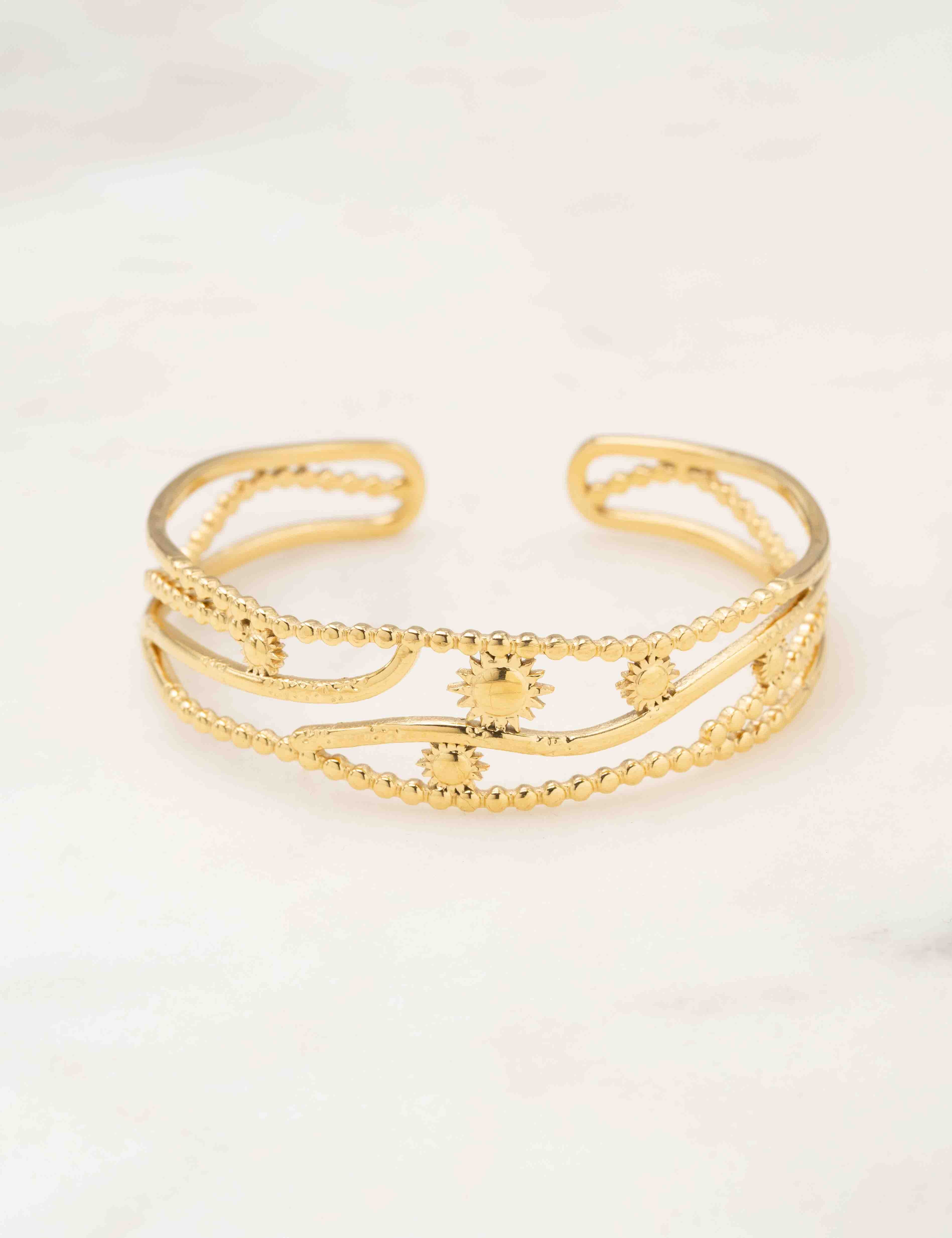 Bracelet malléable type jonc graphique multirangs texturés avec des motifs solaires.