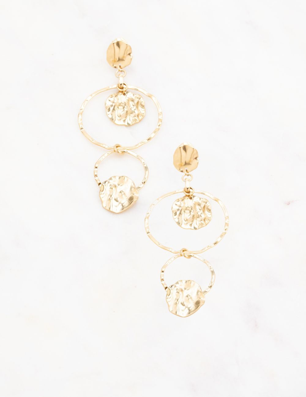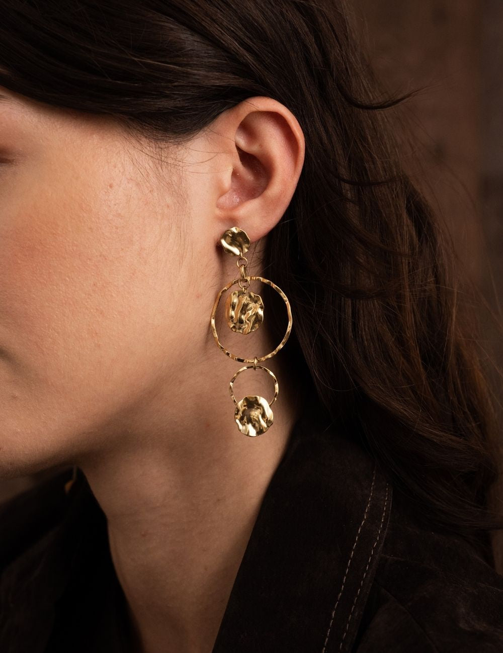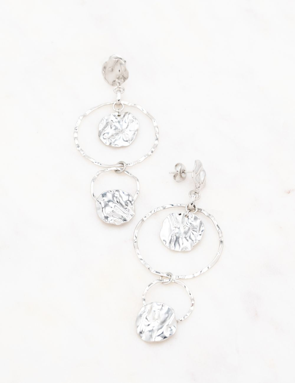 Boucles d'oreilles graphiques pendantes à puce composées de trois pièces rondes ondulées, martelées et deux anneaux texturés.