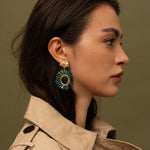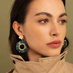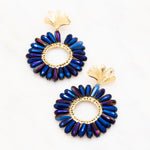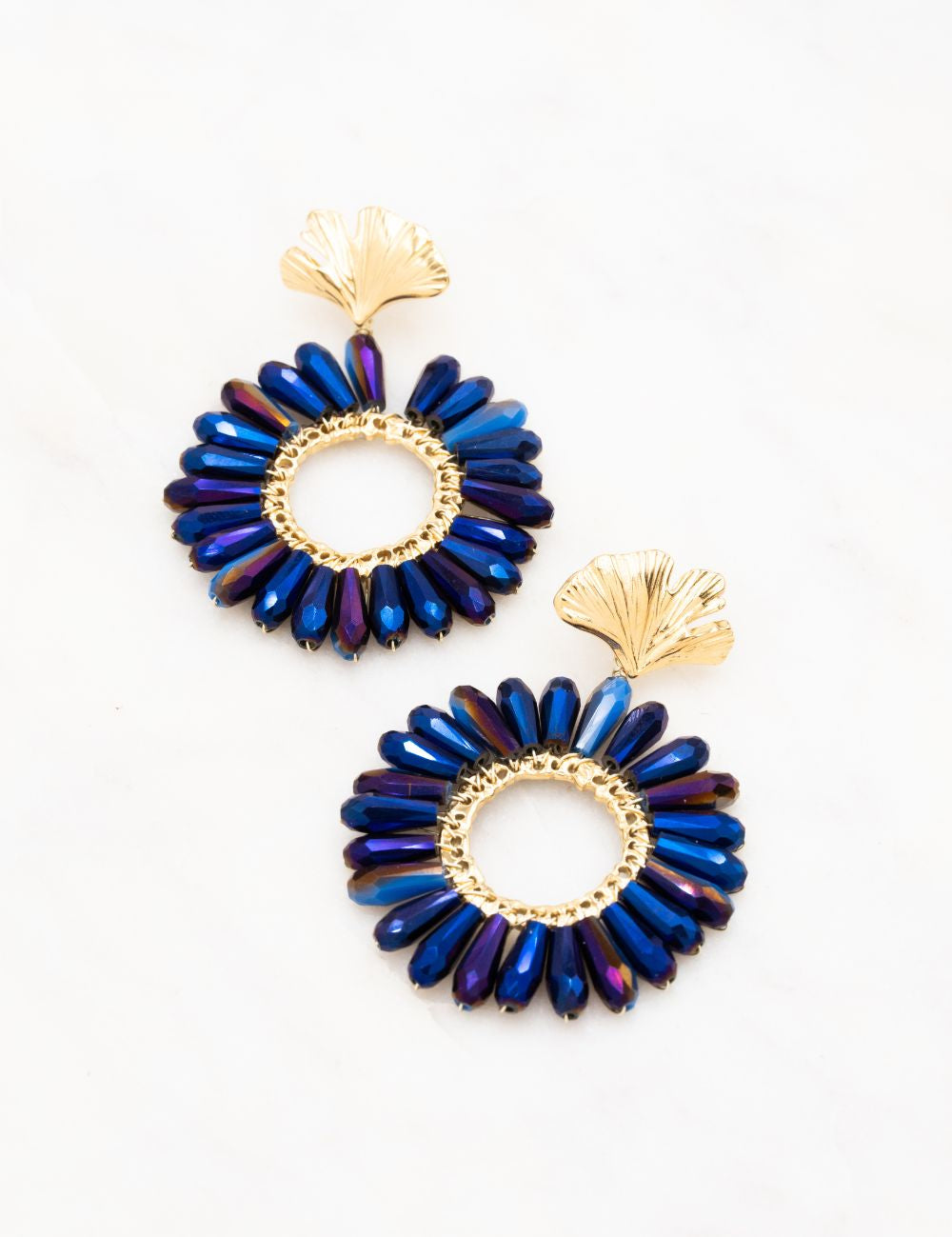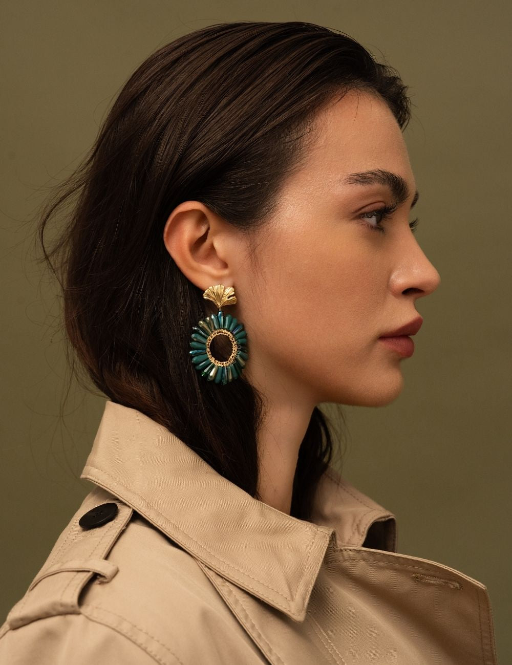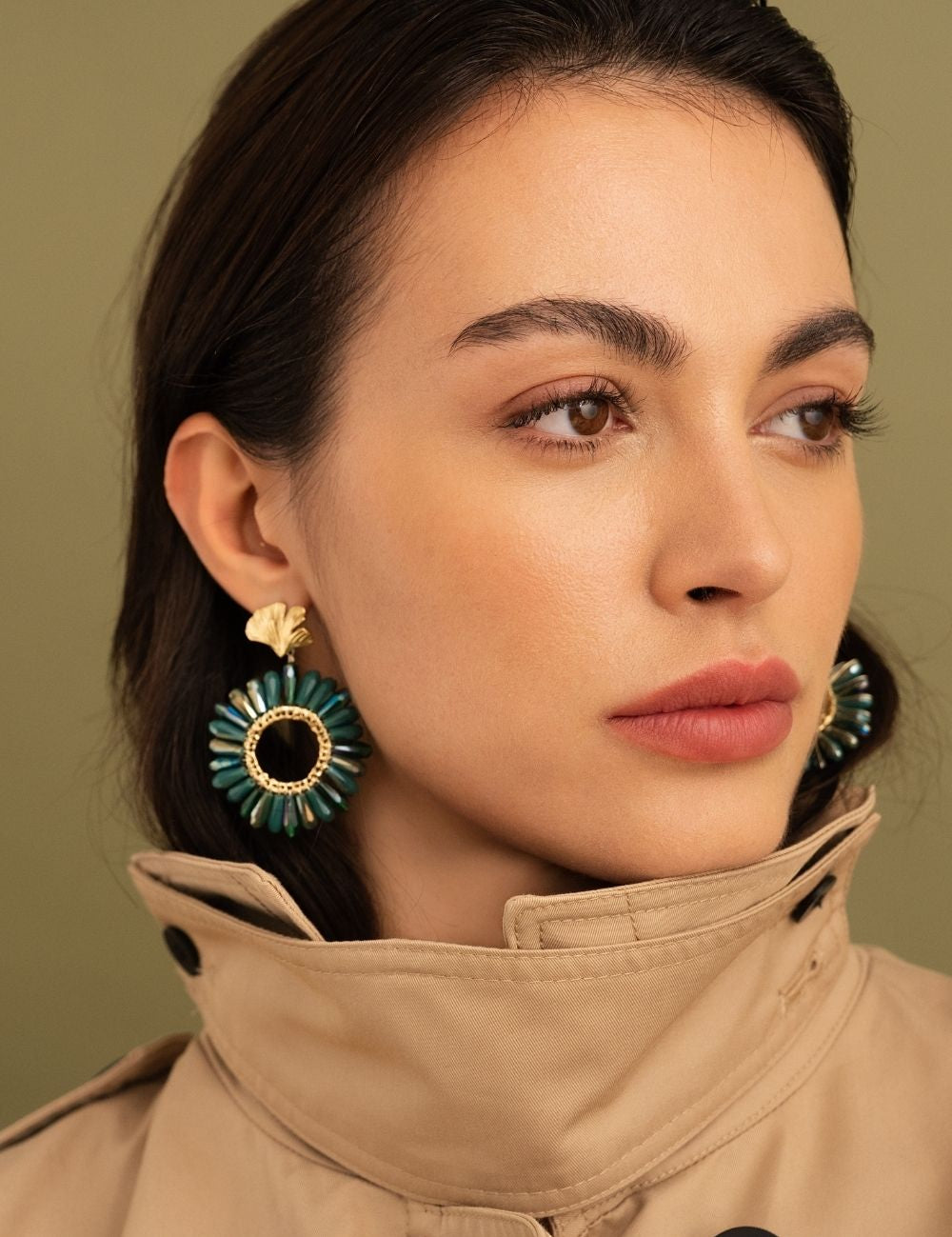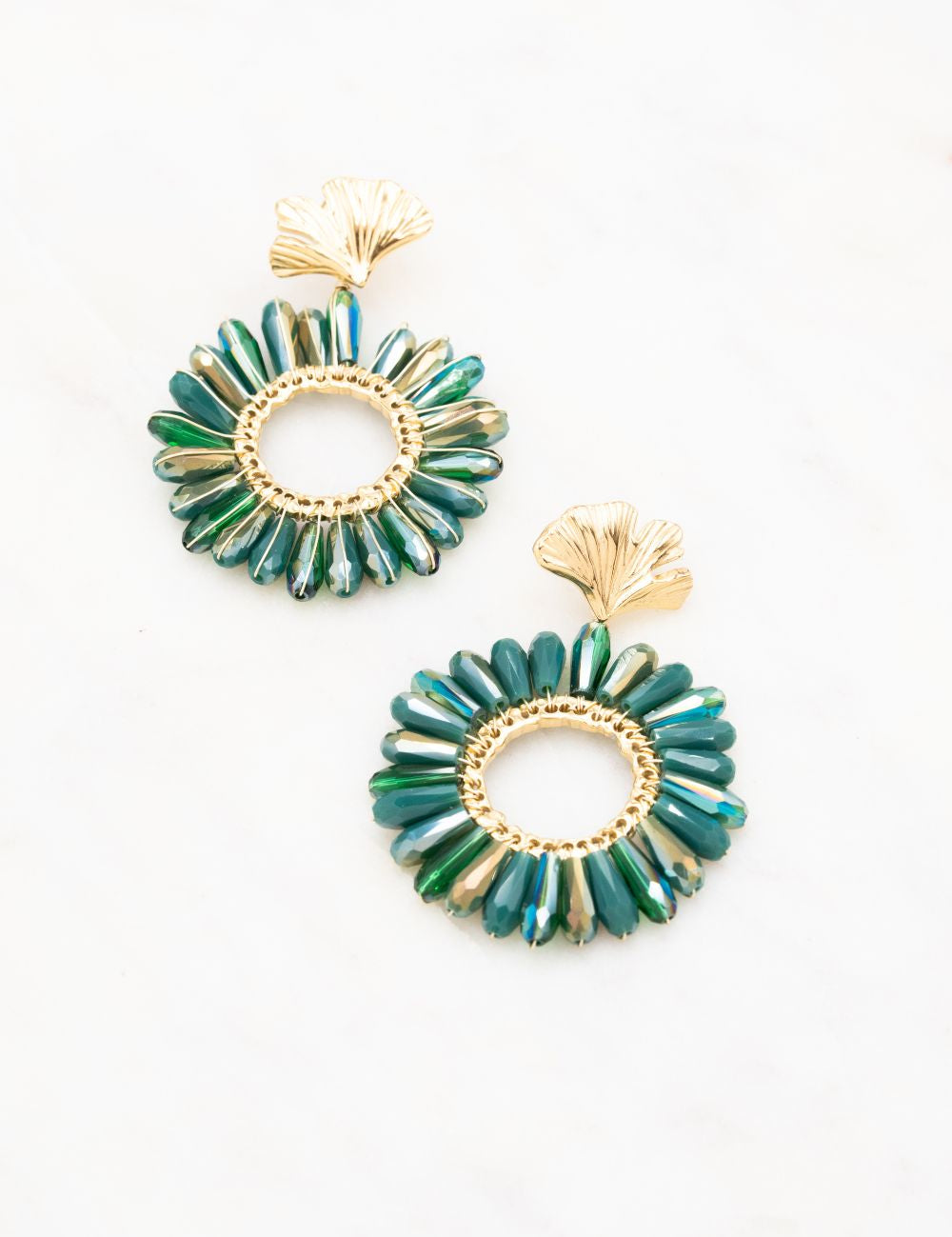 Boucles d'oreilles graphiques à puce composées d'une pièce formant une feuille de ginkgo et d'un anneau rond texturé orné de perles en pâtes de verre colorées.
