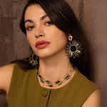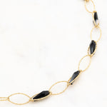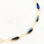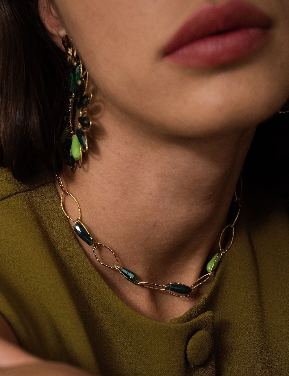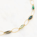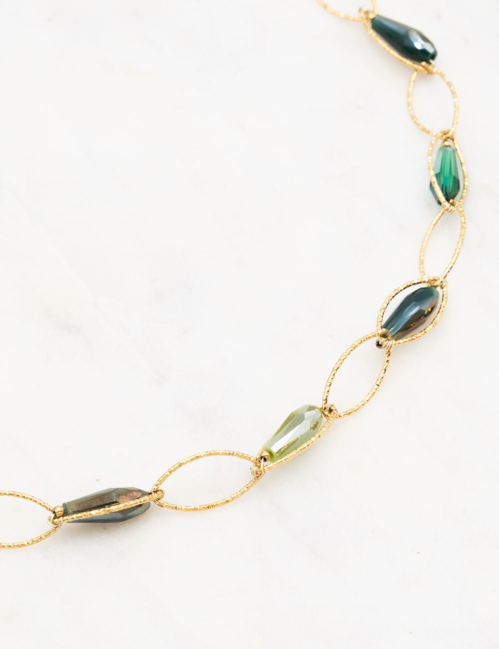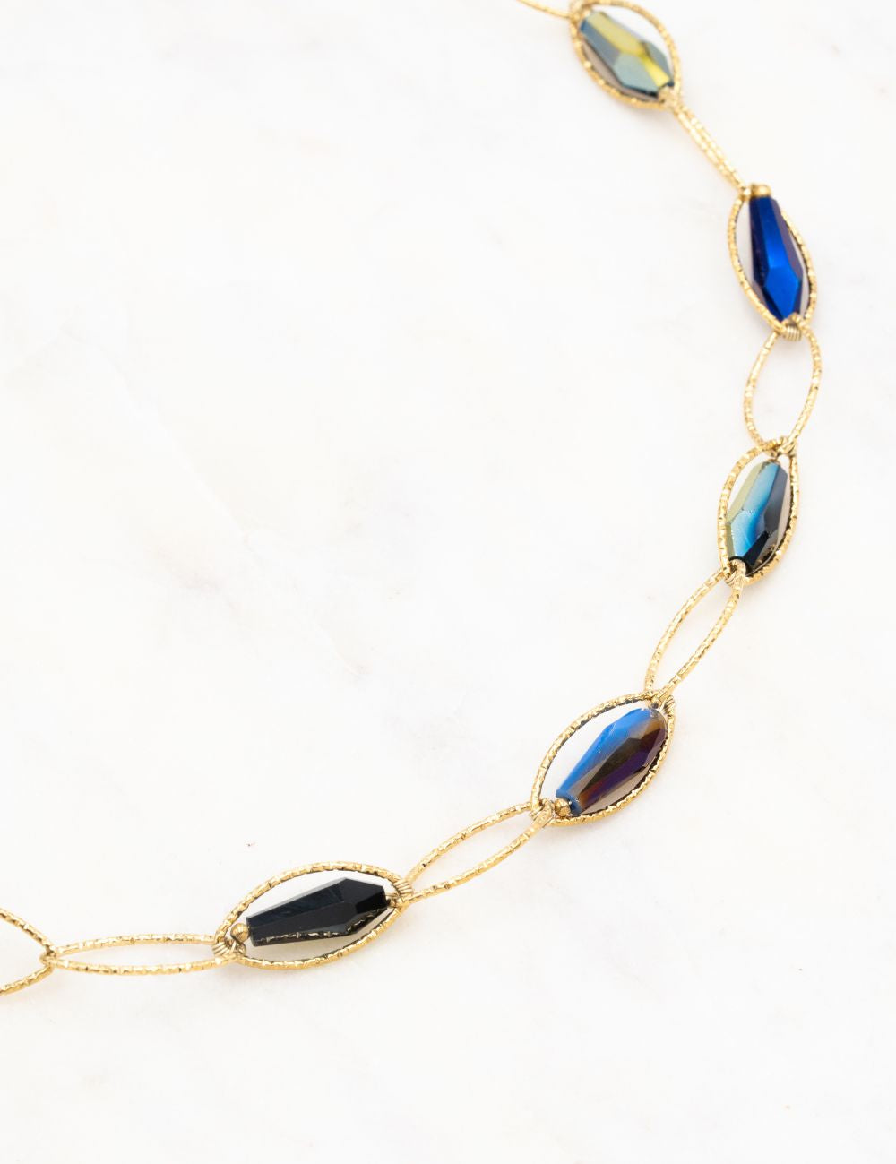 Collier réglable sur chaîne maille, de formes ovales texturés orné de perles en pâtes de verre colorées.