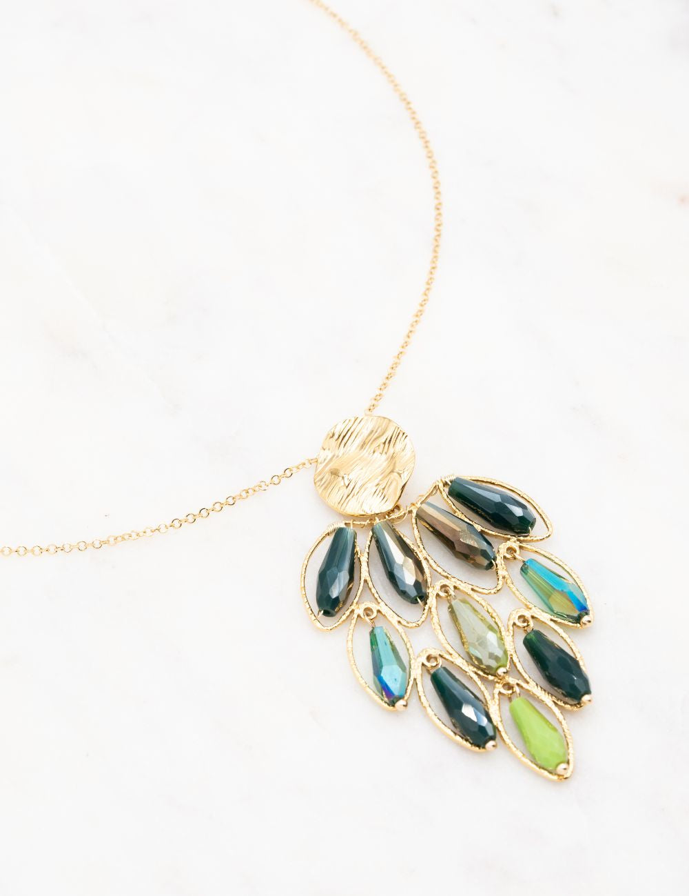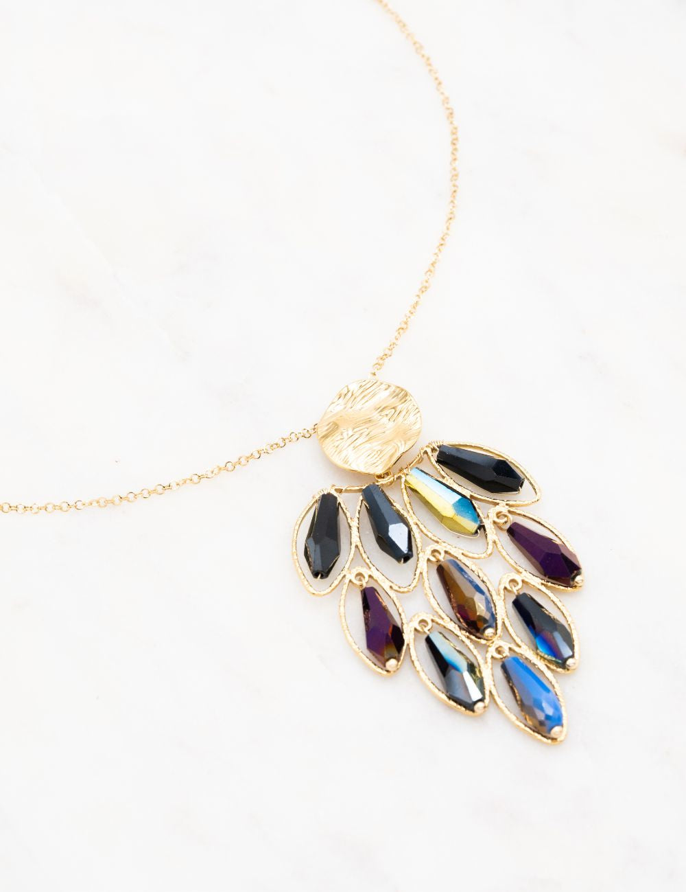 Collier réglable type sautoir sur chaîne composé d'une pièce martelée, d'anneaux ovales texturés et de perles en pâtes de verre colorées.