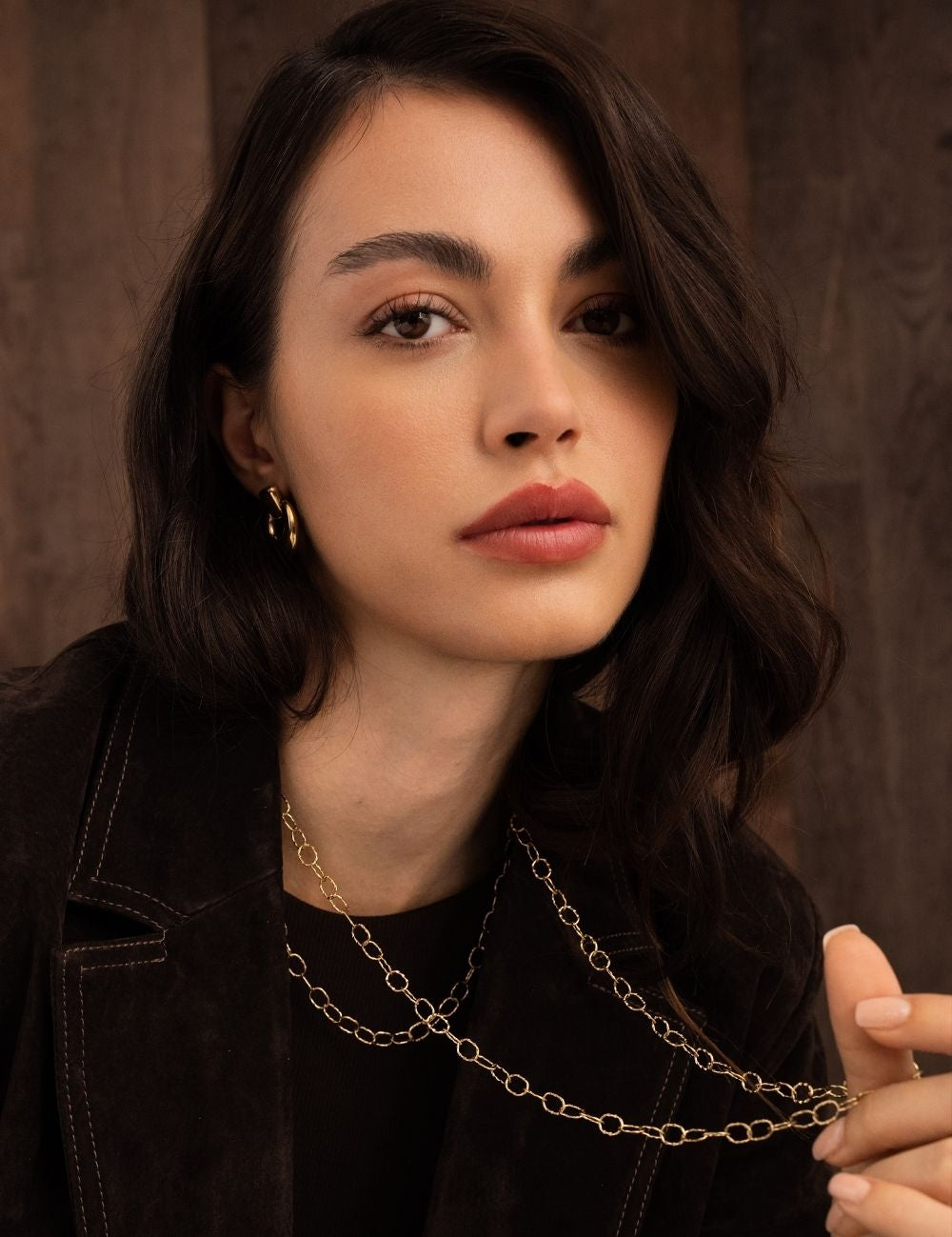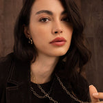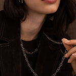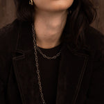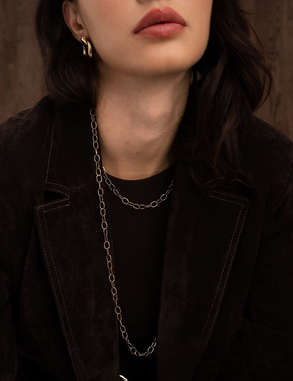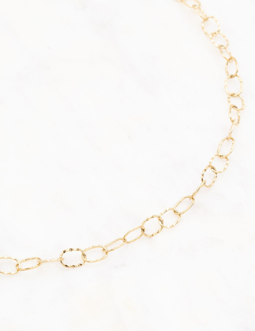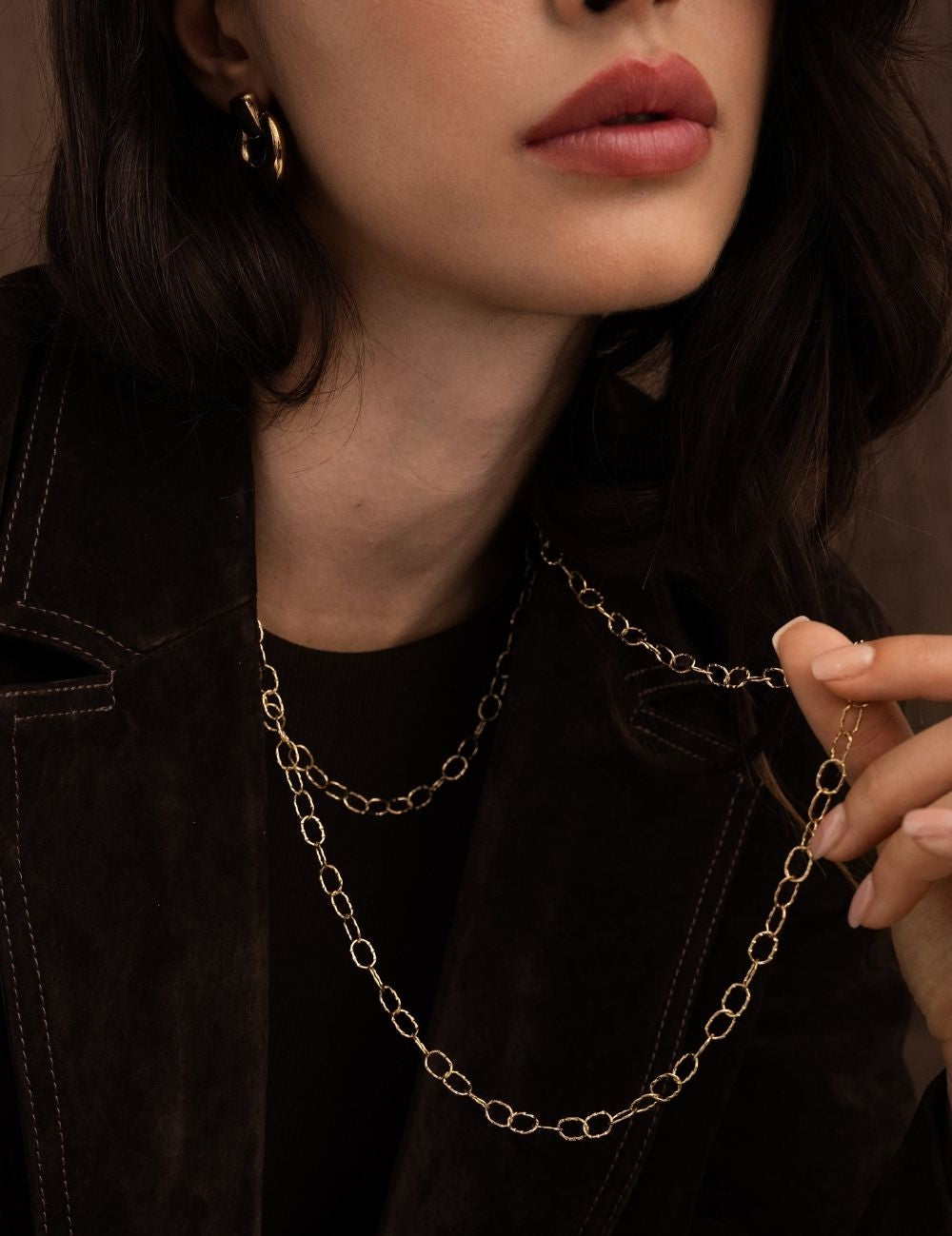 Collier réglable sur chaîne type sautoir composé de maillons ovales texturés.