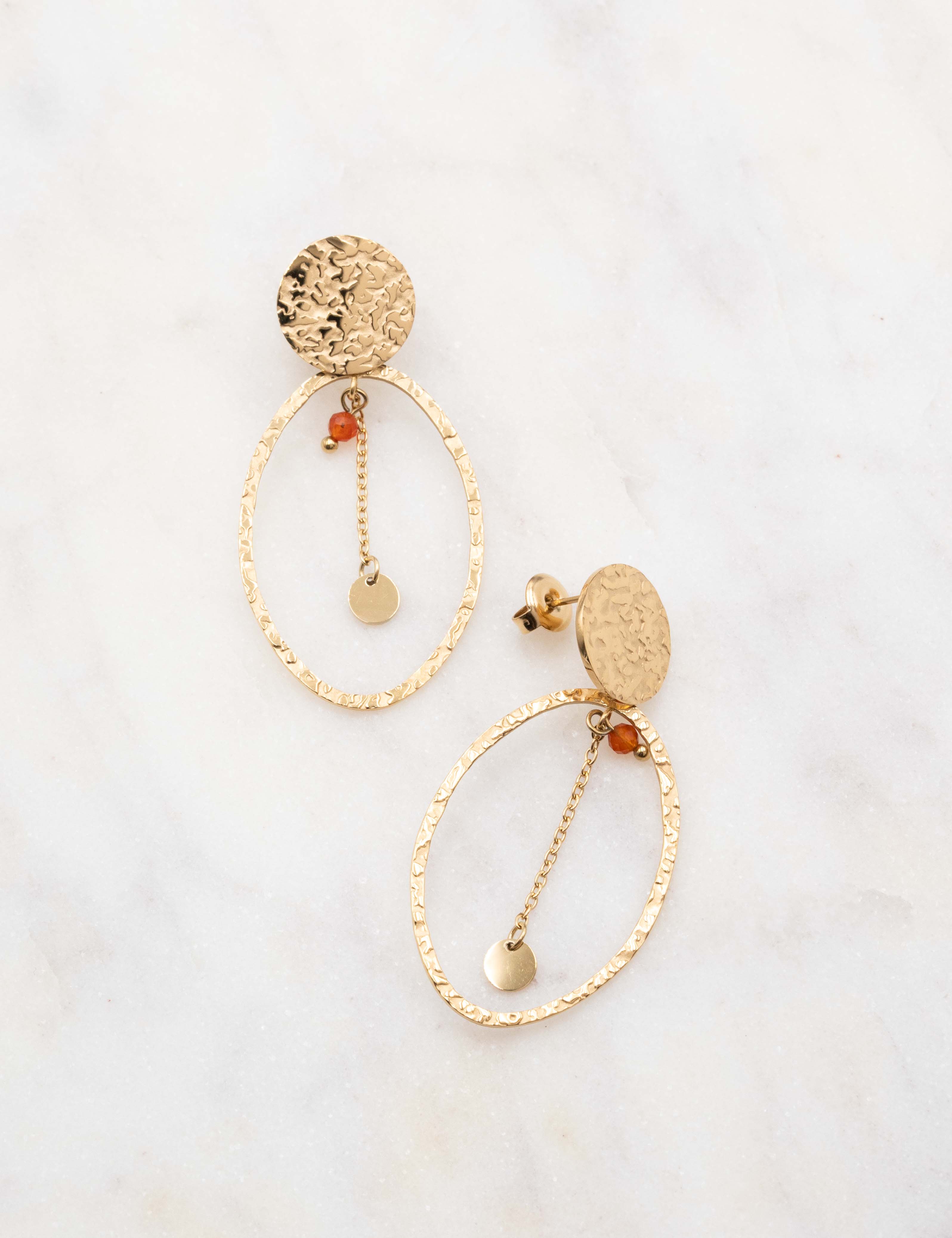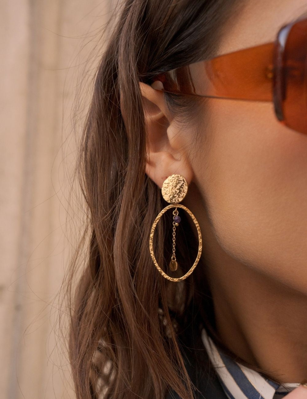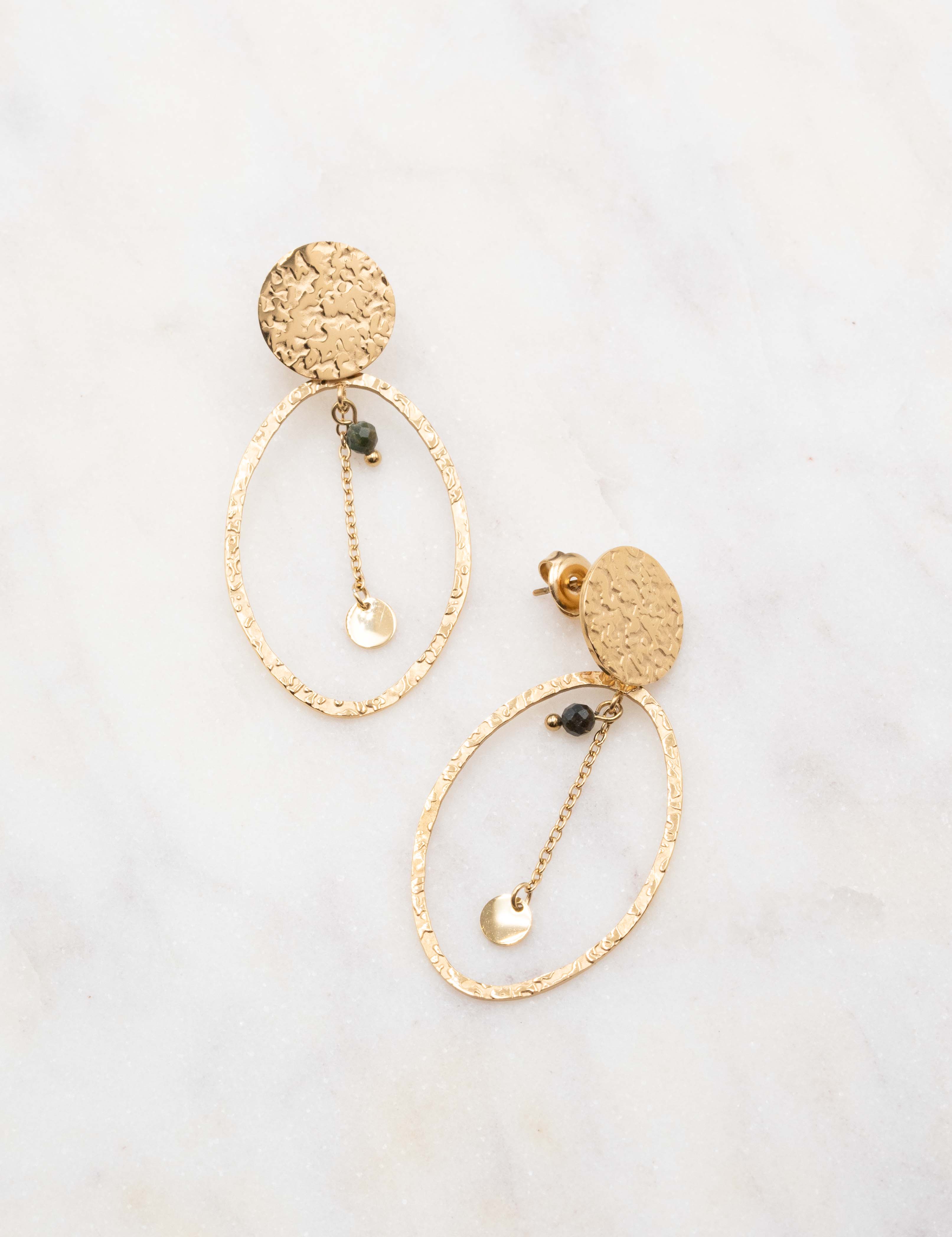 Boucles d'oreilles graphiques à puce composées d'une pièce ronde martelée, d'un anneau ovale texturé, d'une chaîne, d'une pampille ronde lisse et d'une pierre naturelle.