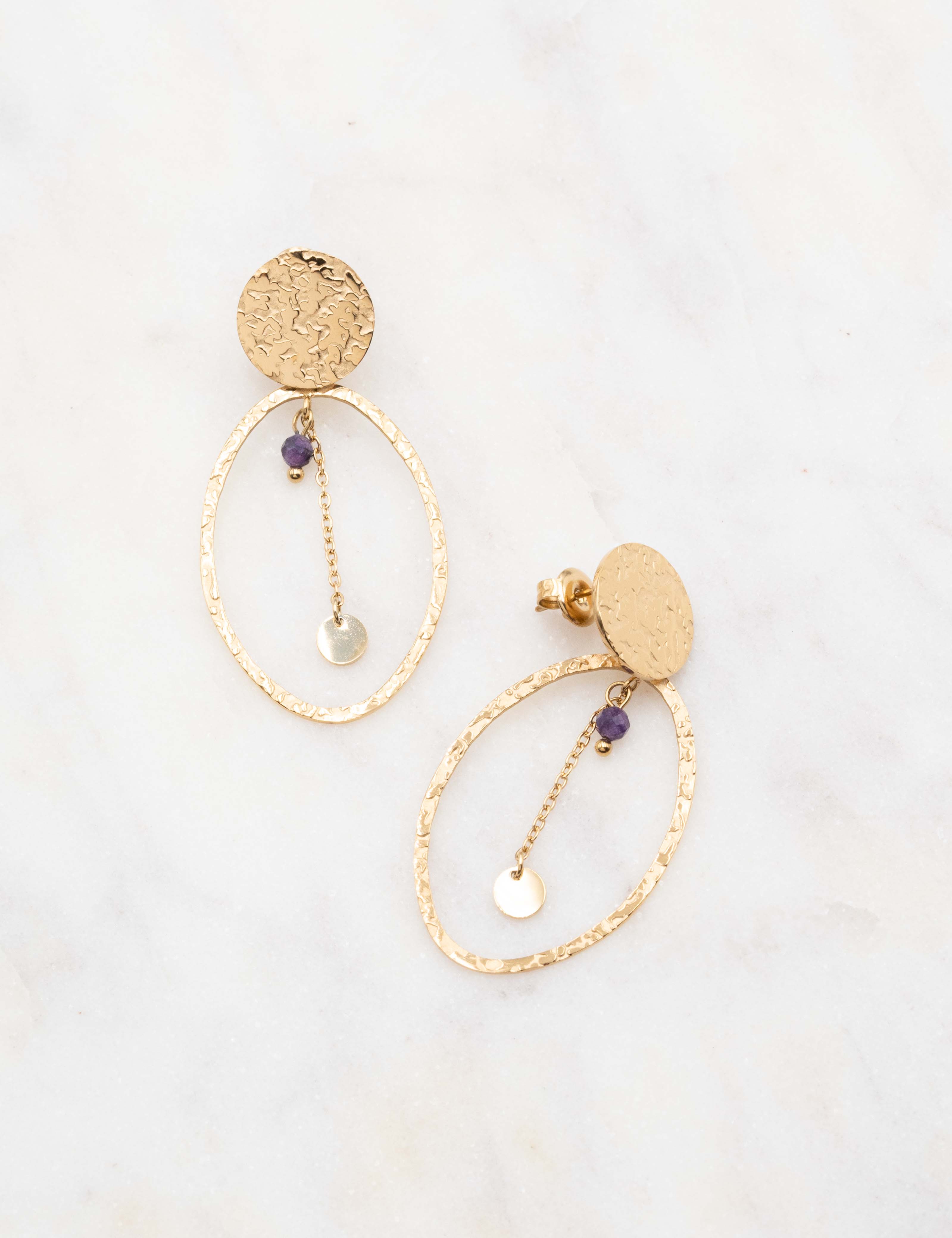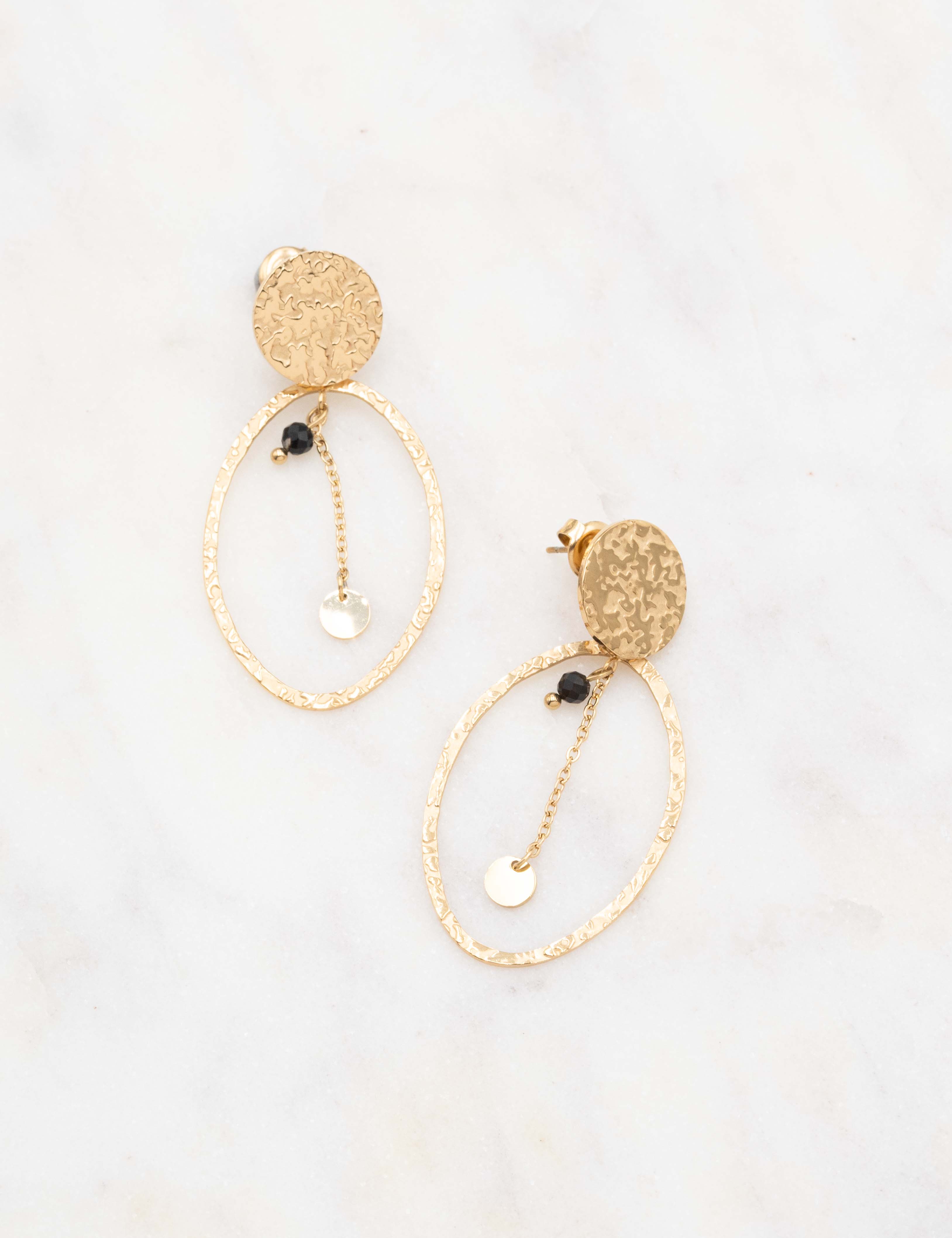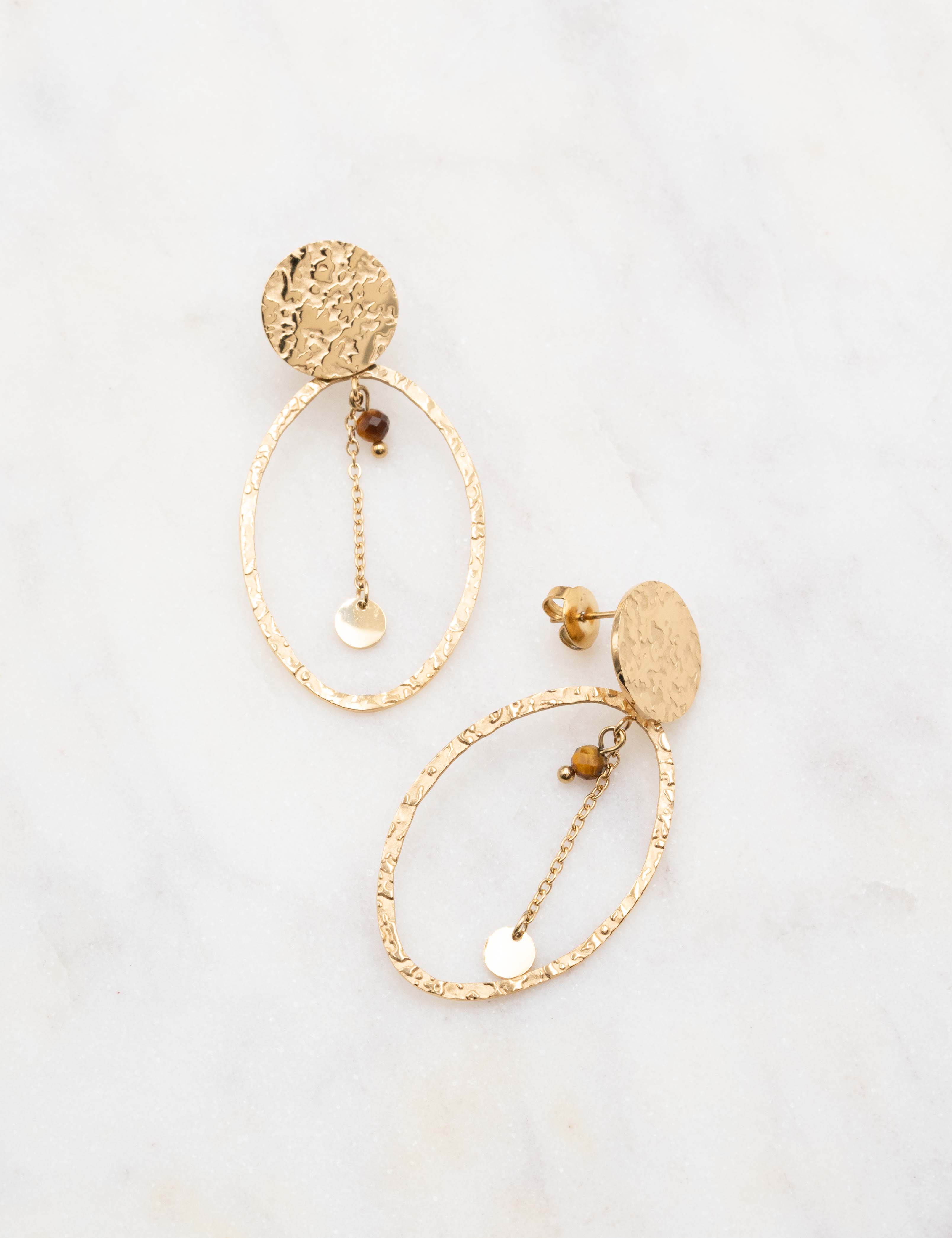 Boucles d'oreilles graphiques à puce composées d'une pièce ronde martelée, d'un anneau ovale texturé, d'une chaîne, d'une pampille ronde lisse et d'une pierre naturelle.