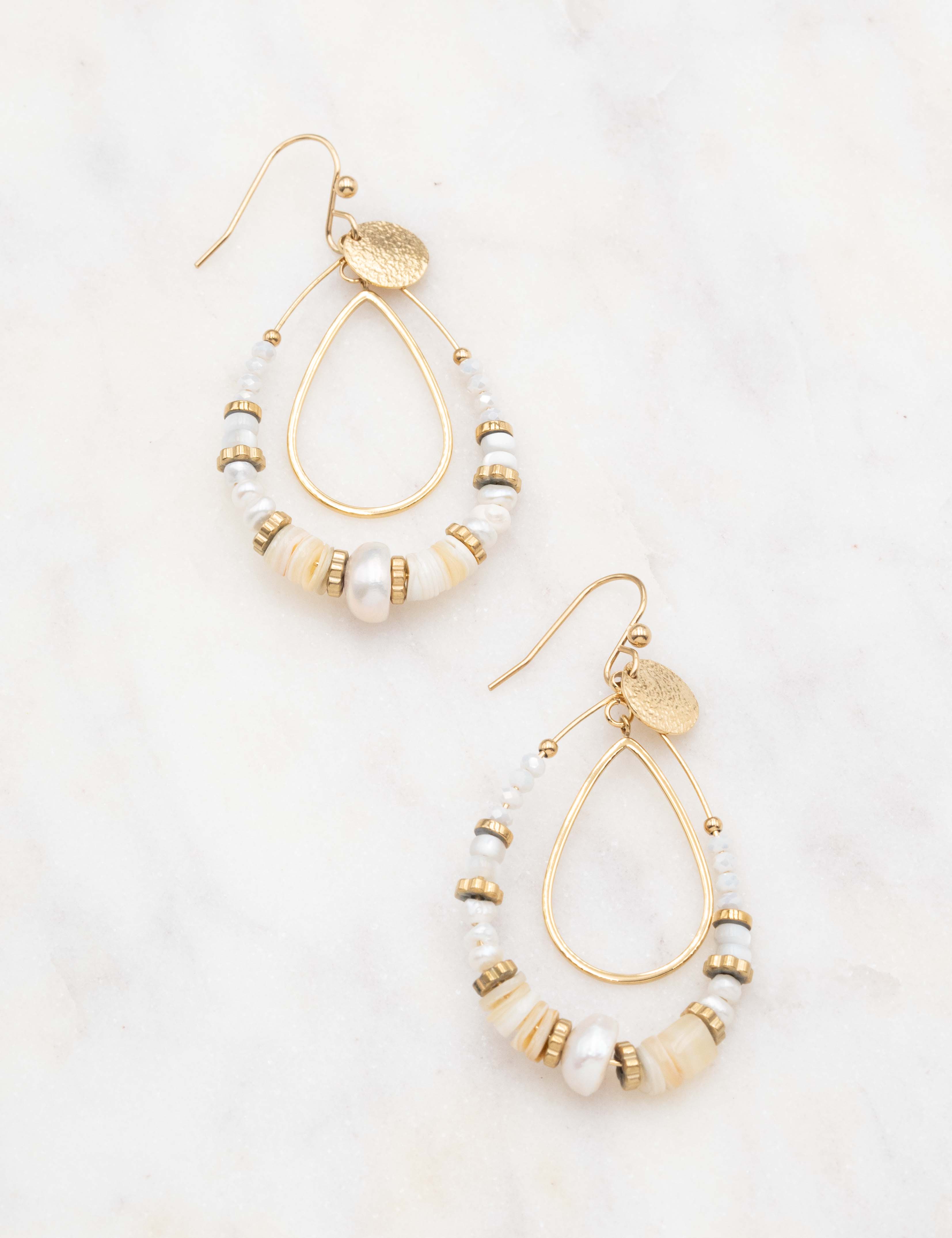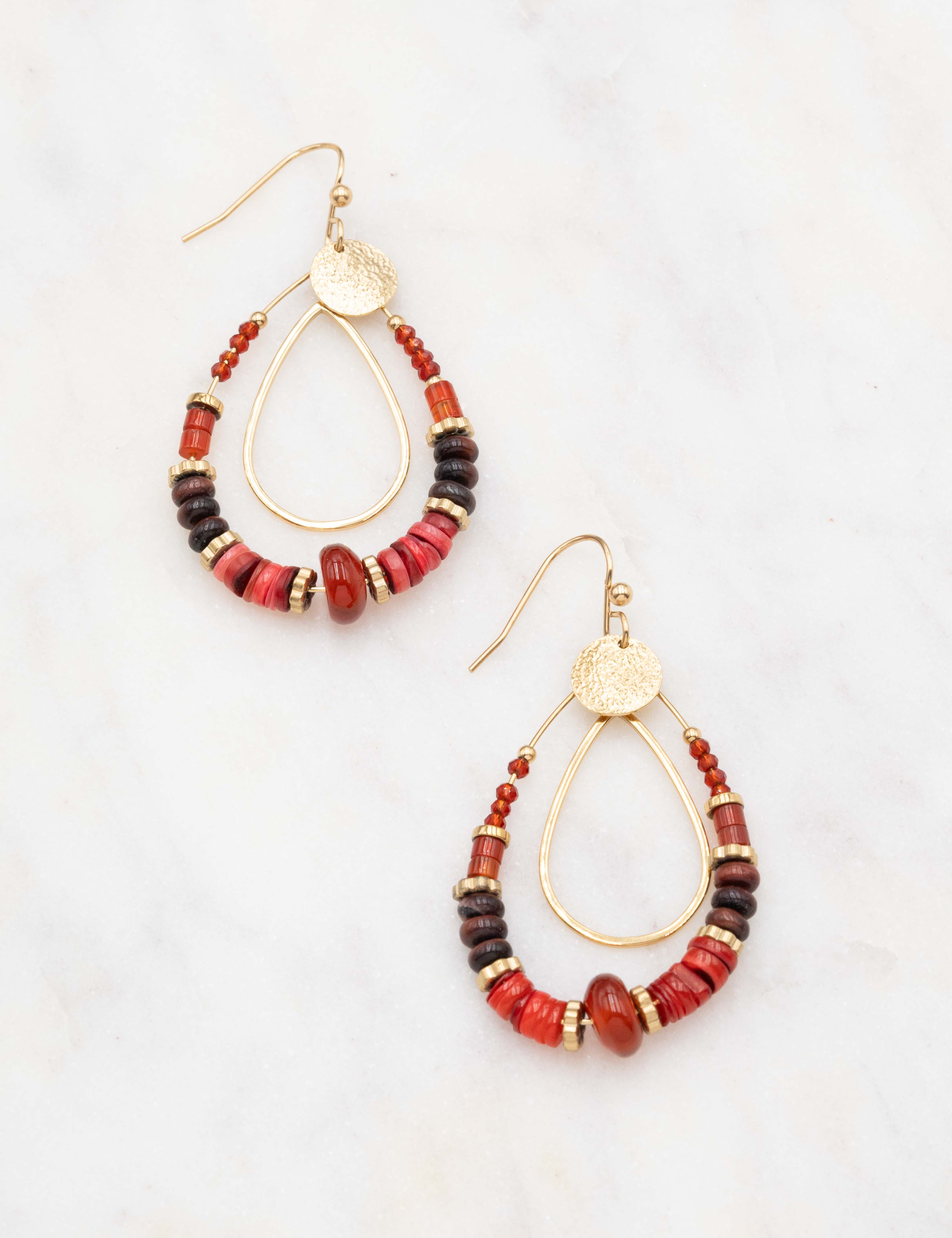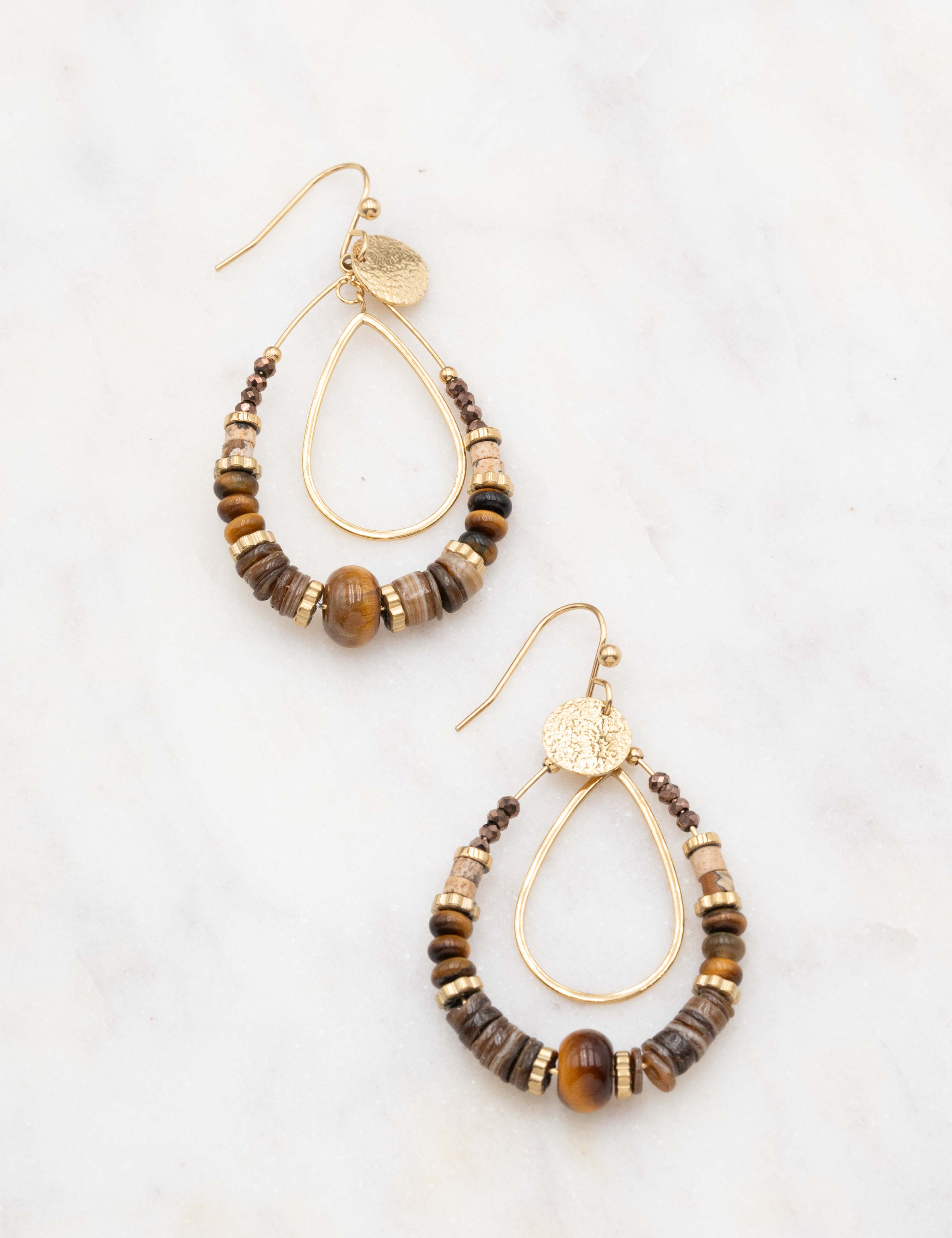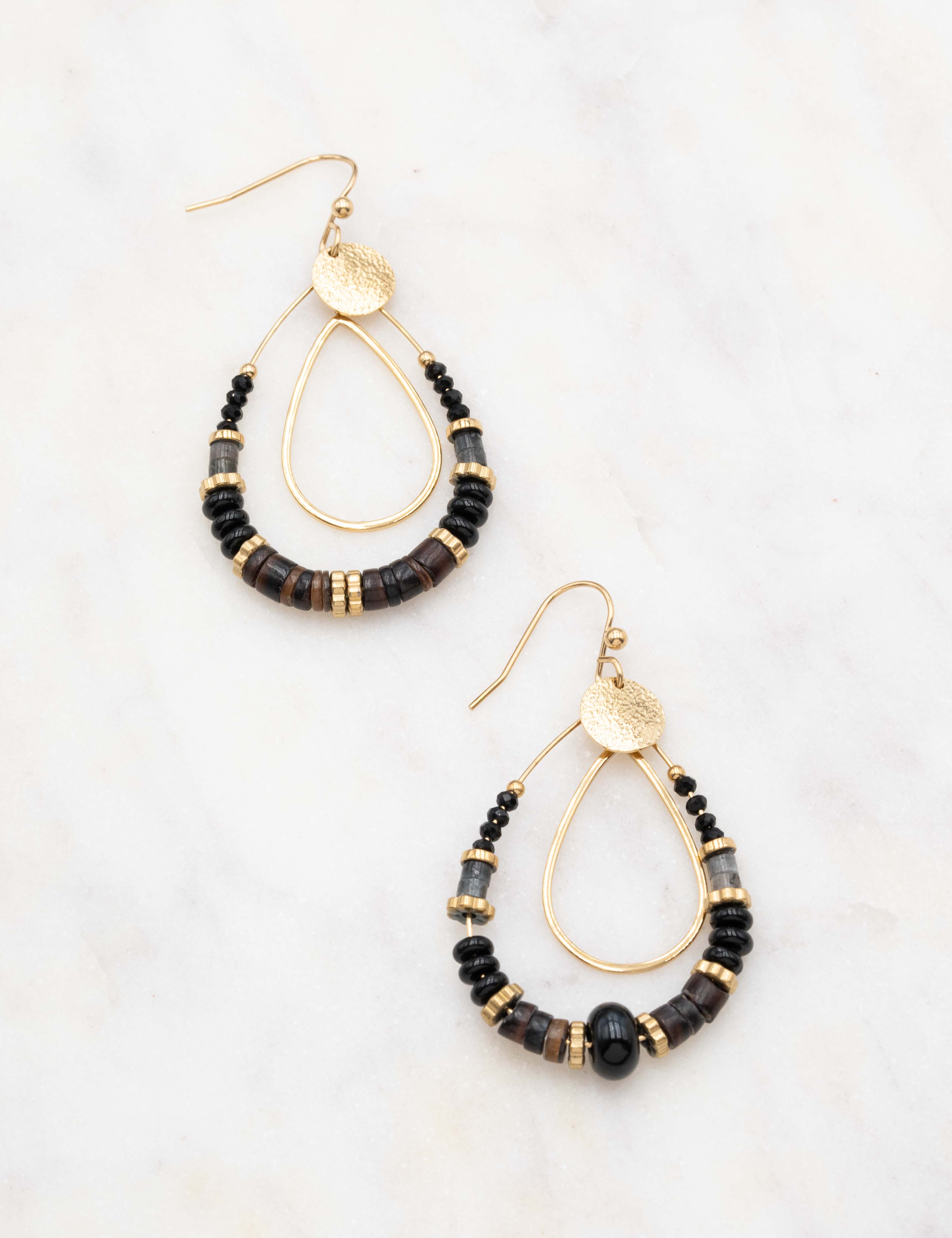 Boucles d'oreilles graphiques à crochet composées d'une pièce ronde martelée, de deux anneaux ovales et de pierres naturelles.