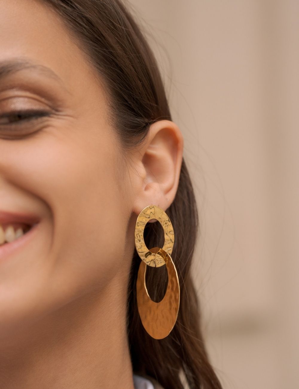 Boucles d'oreilles graphiques à puce composées de 2 anneaux martelés entrelacés.