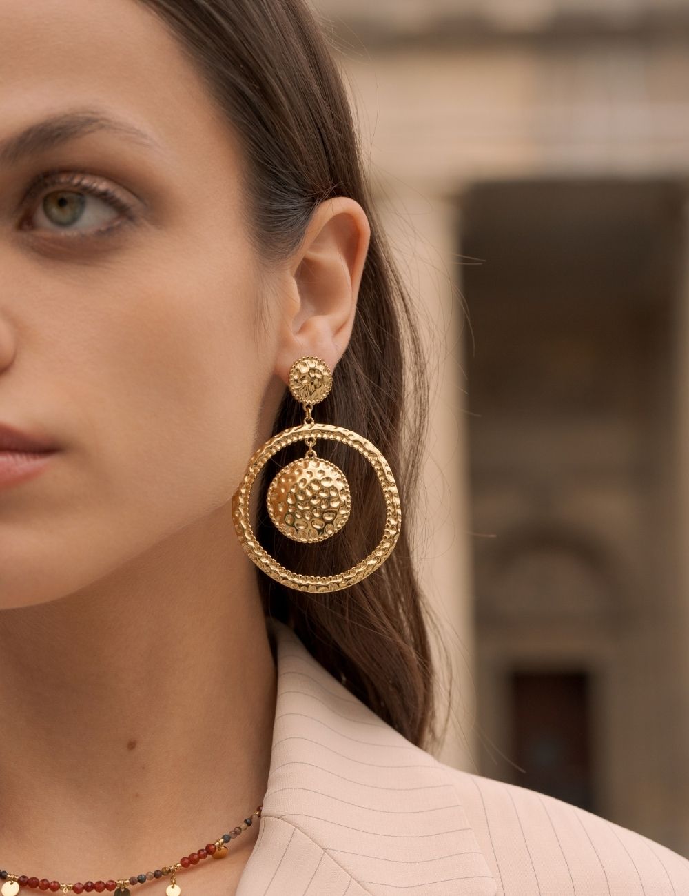 Boucles d'oreilles graphiques pendantes à puce composées d'un jeu de pièces rondes martelées et d'une pièce texturée ajourée.