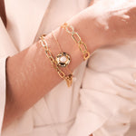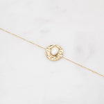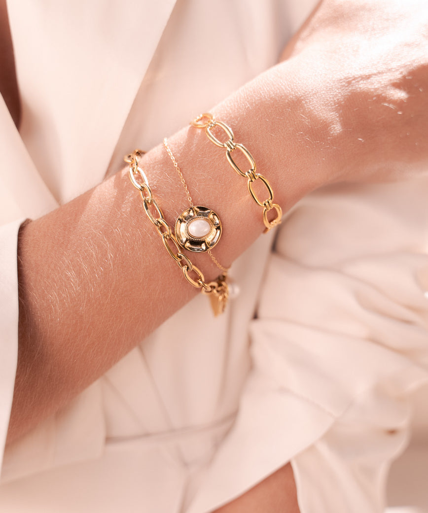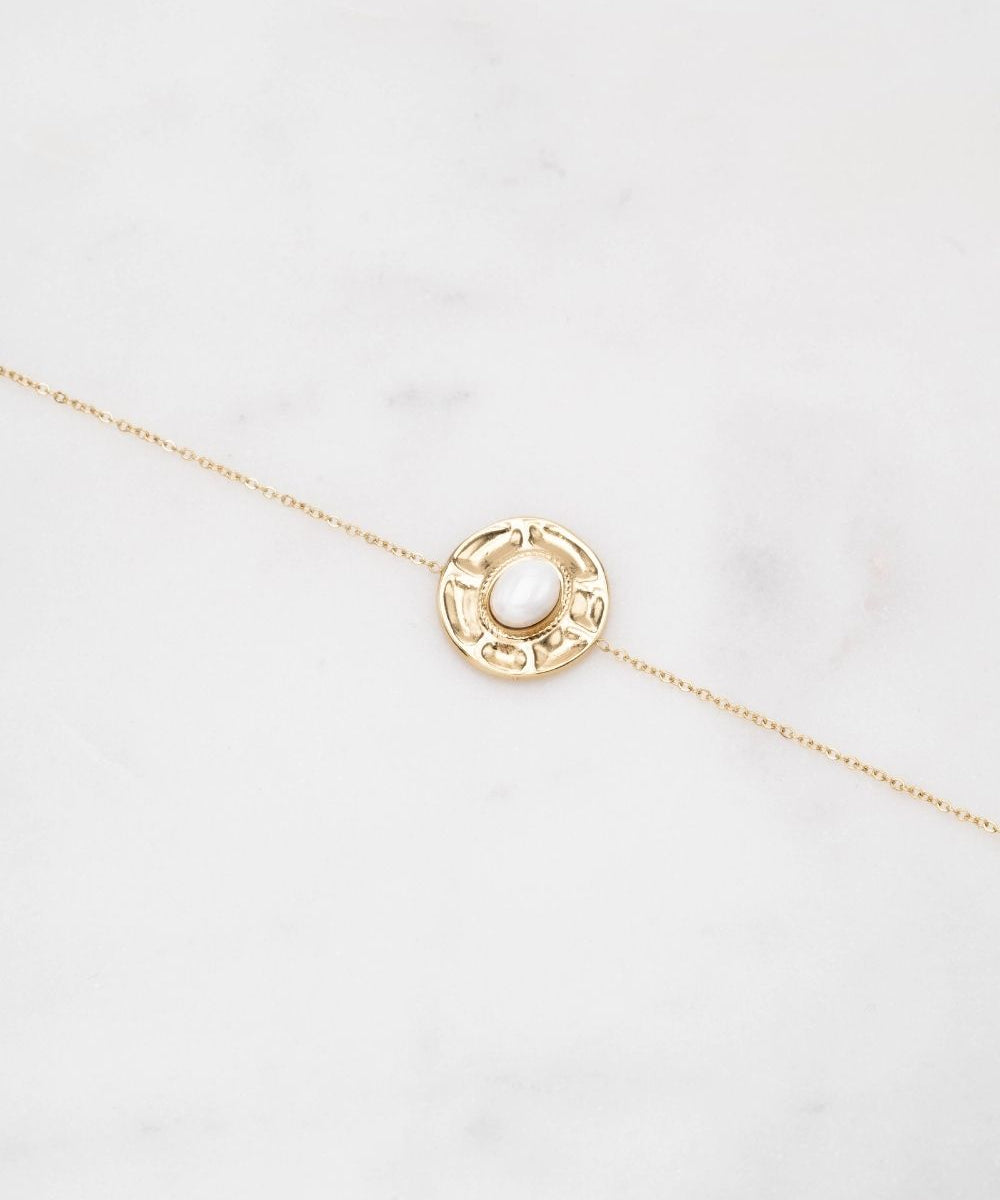 Bracelet réglable sur chaine composé d'un pendant martelé et serti d'une nacre. Fermoir mousquetion et chainette de réglage.