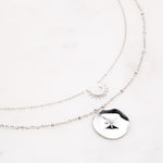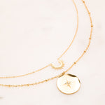 Collier réglable sur chaine 2 rangs composé d'un demi-soleil et d'une pampille étoilé ornée d'un petit strass zirconium. Fermoir mousqueton et chainette de réglage.