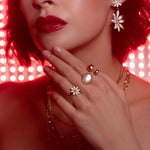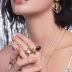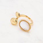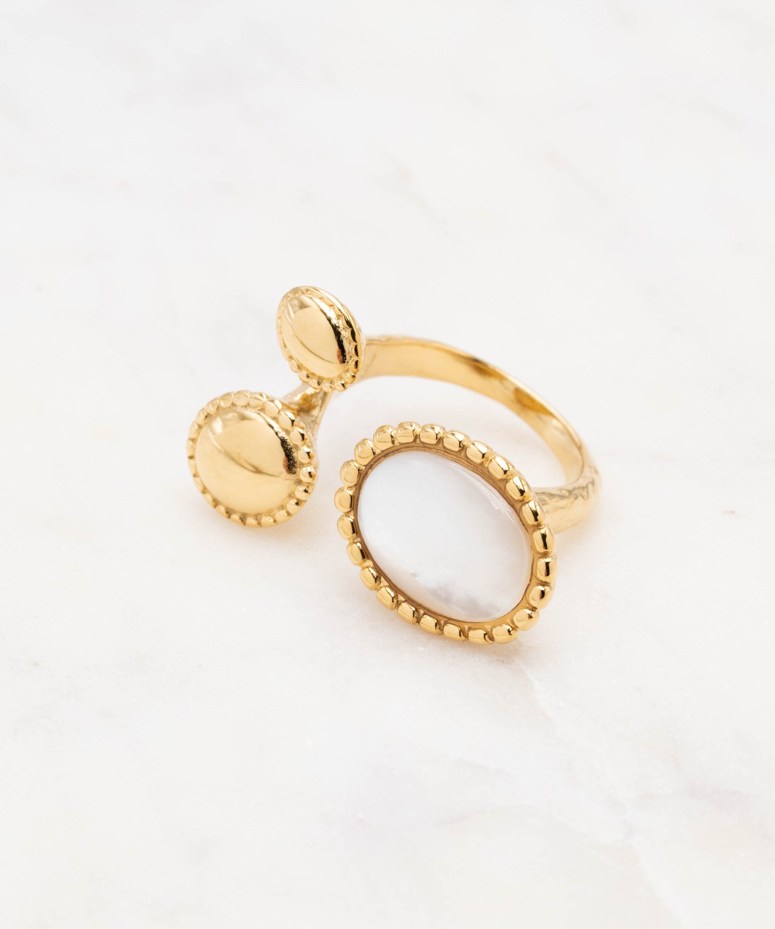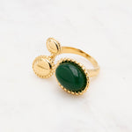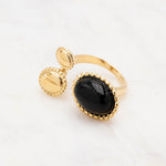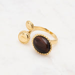 Bague graphique ajustable par le devant, est composée de trois pièces ovales dont l'une est sertie d'une pierre naturelle.