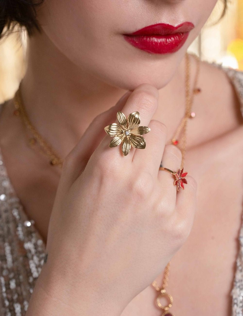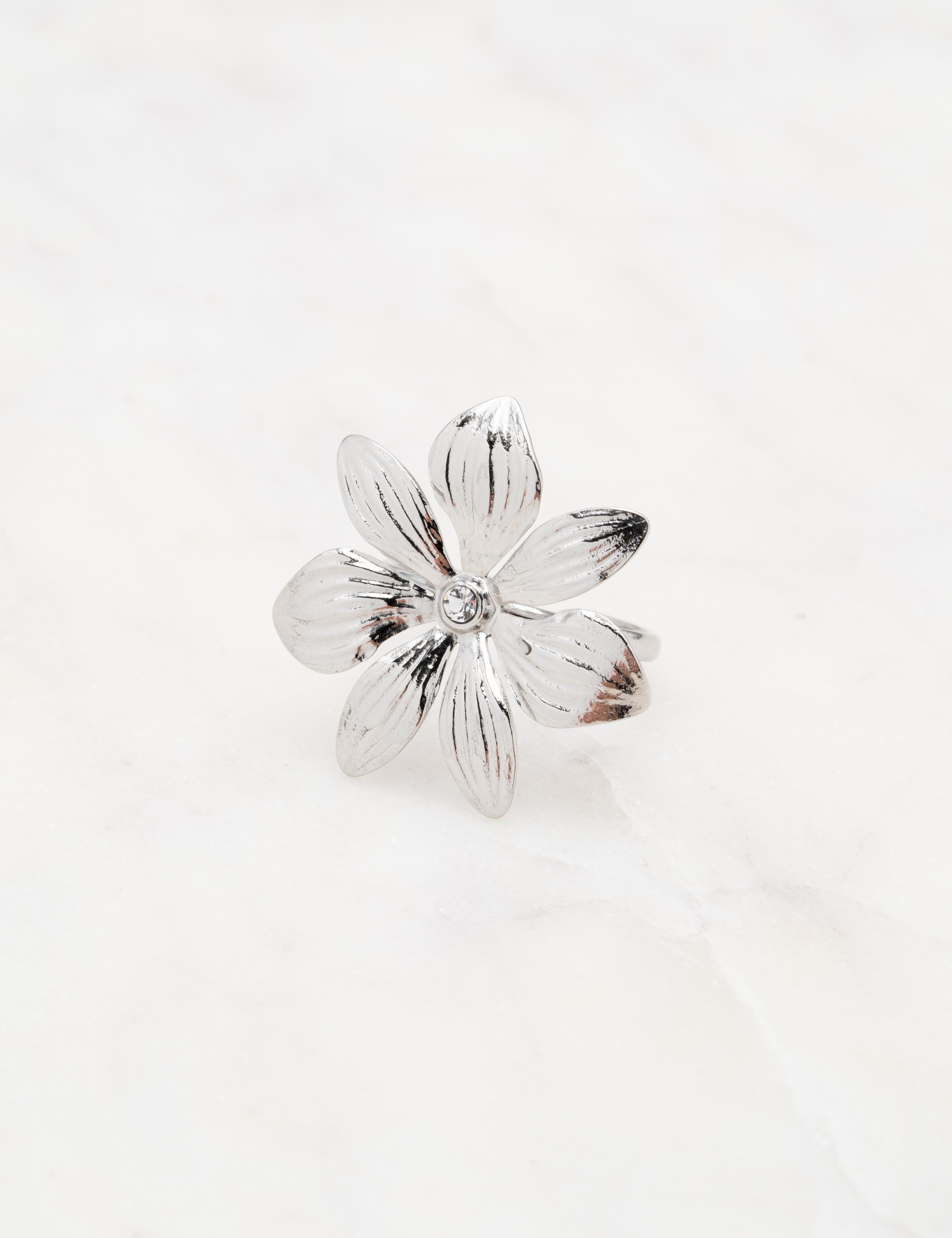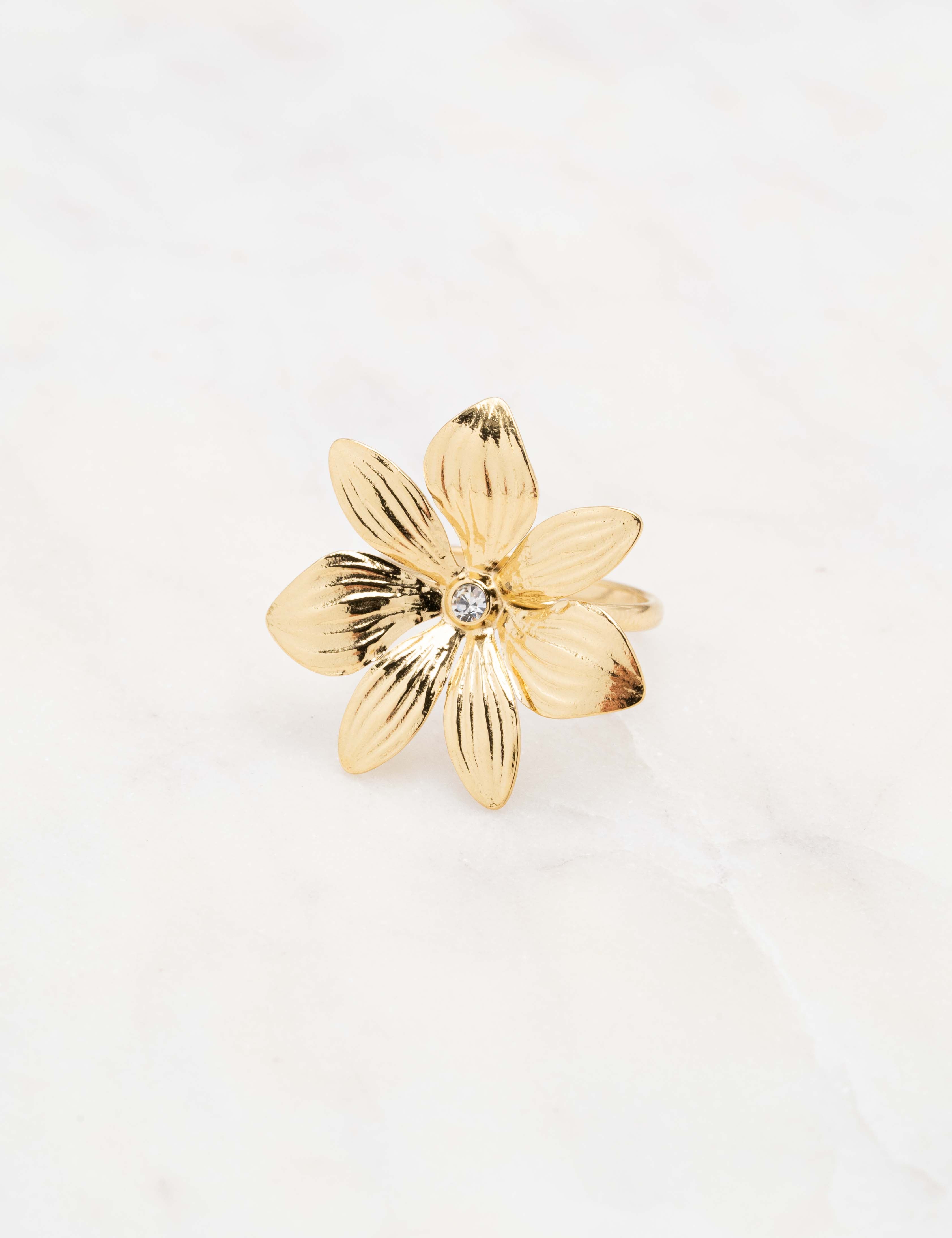 Bague fine ajustable composée d'une pièce florale ornée d'un strass zirconium.