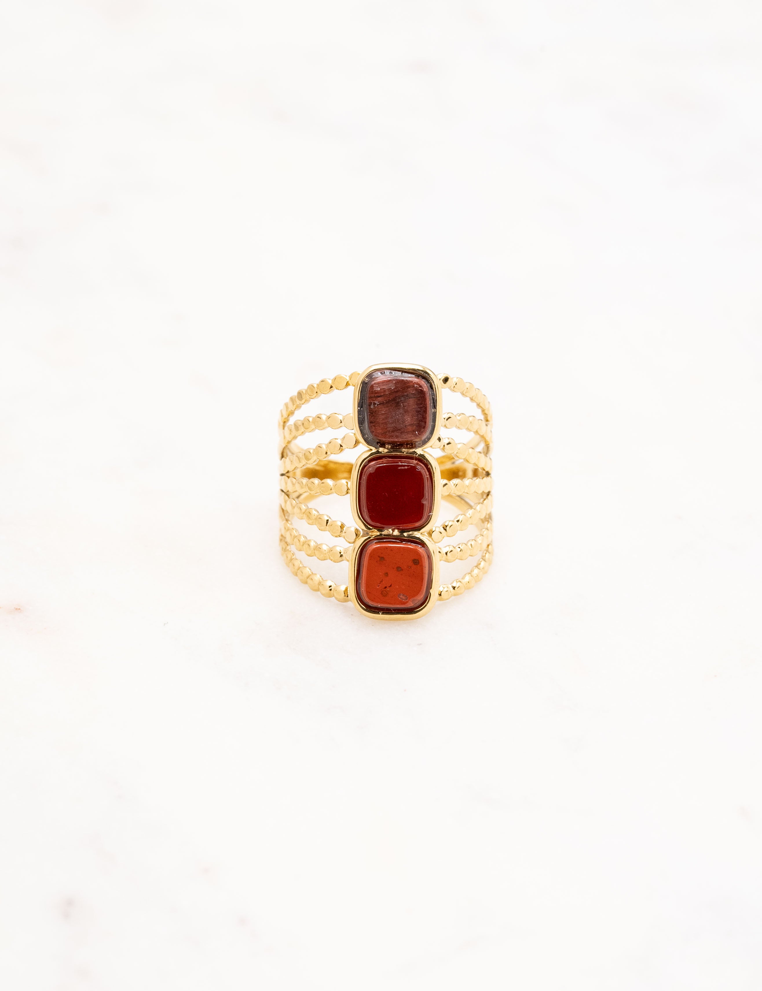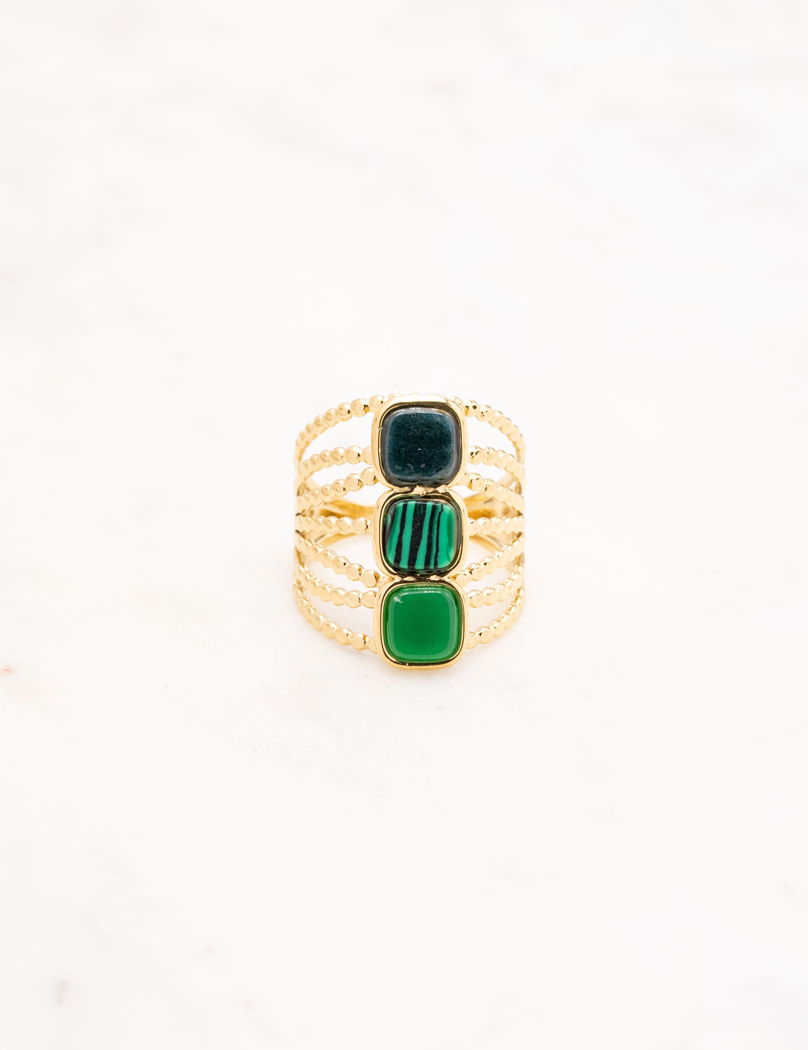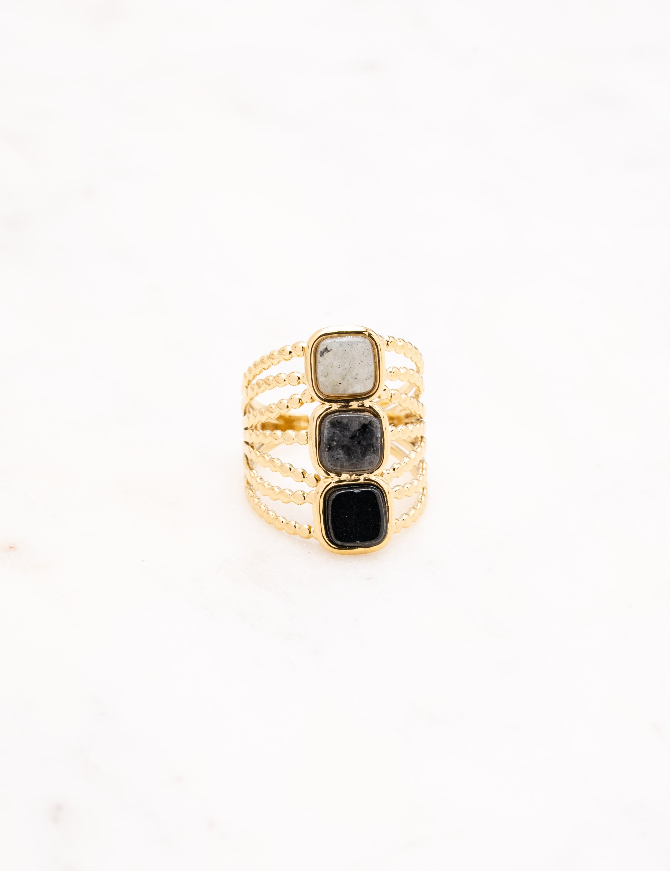 Bague graphique ajustable multi-rangs effet canelé ornée de pierres naturelles.