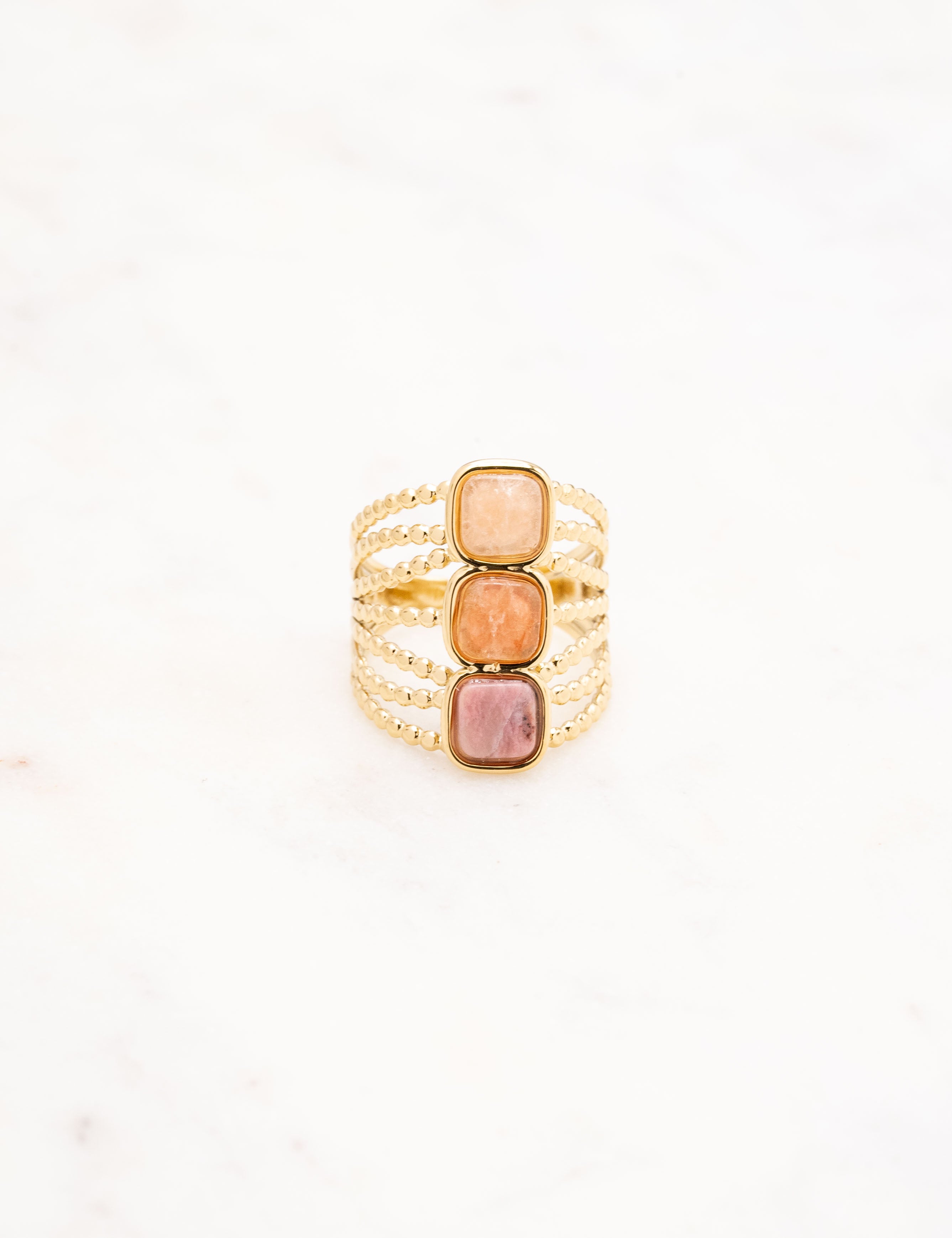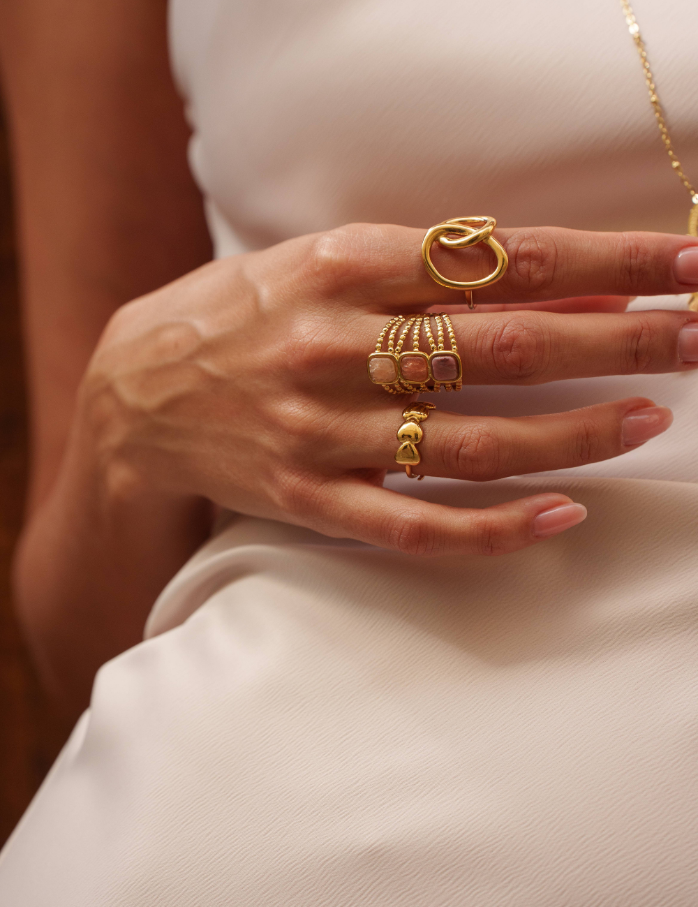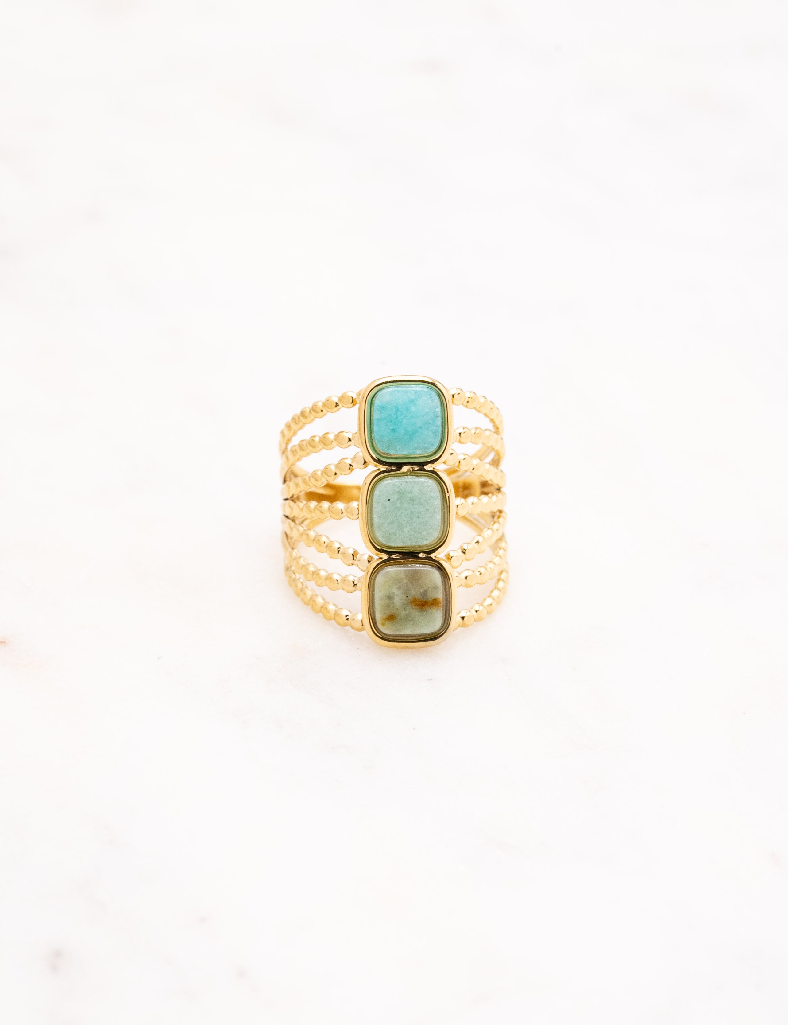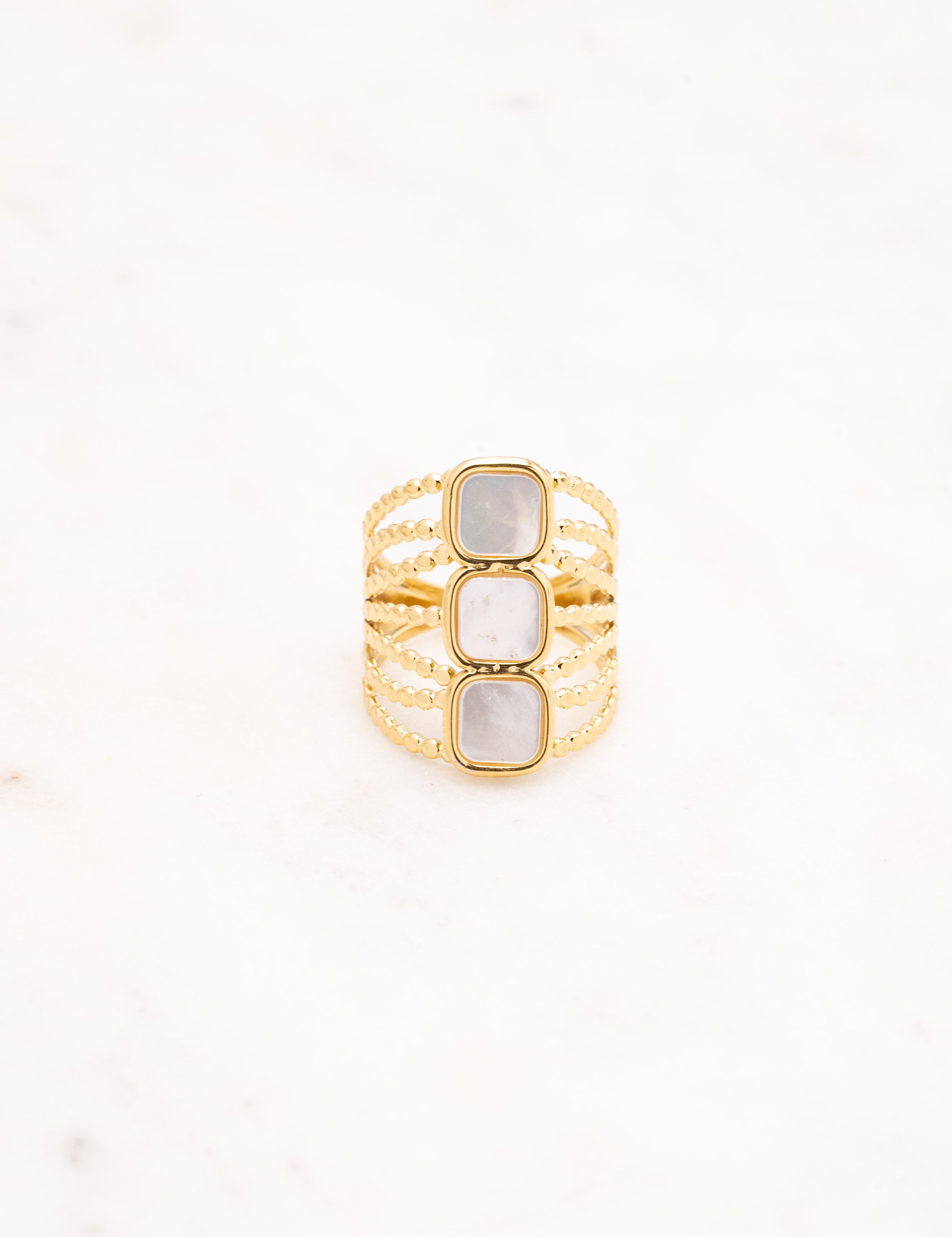 Bague graphique ajustable multi-rangs effet canelé ornée de pierres naturelles.