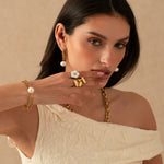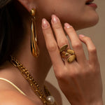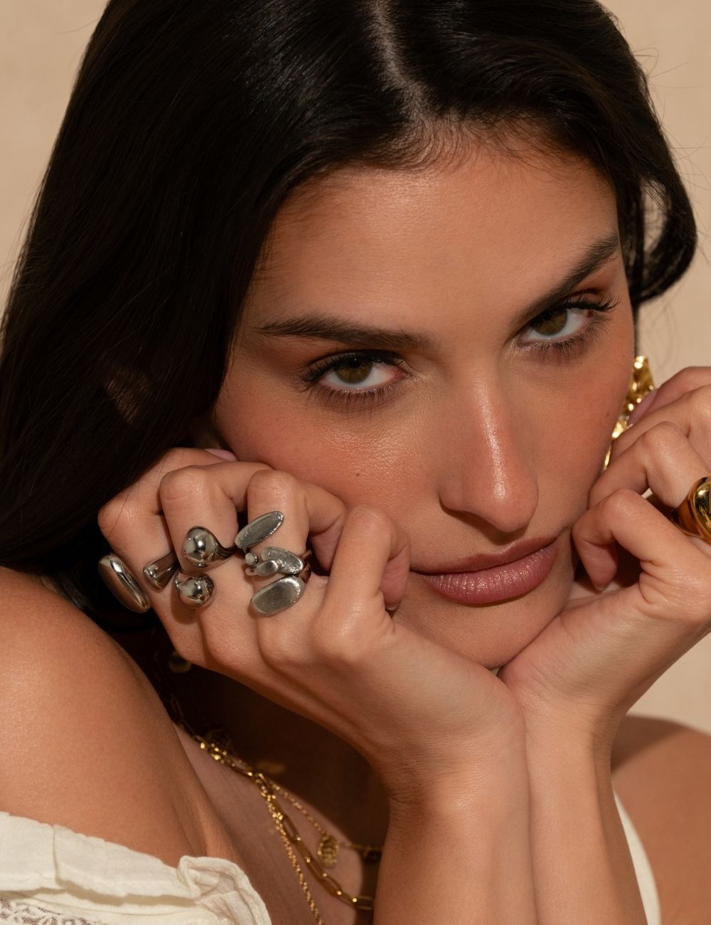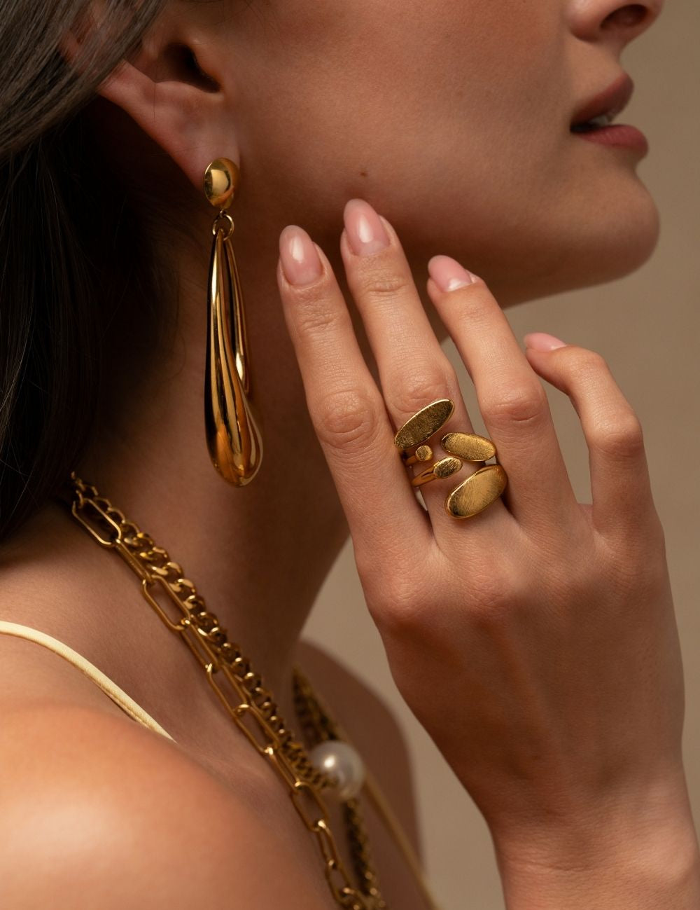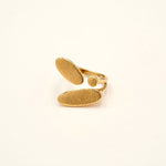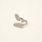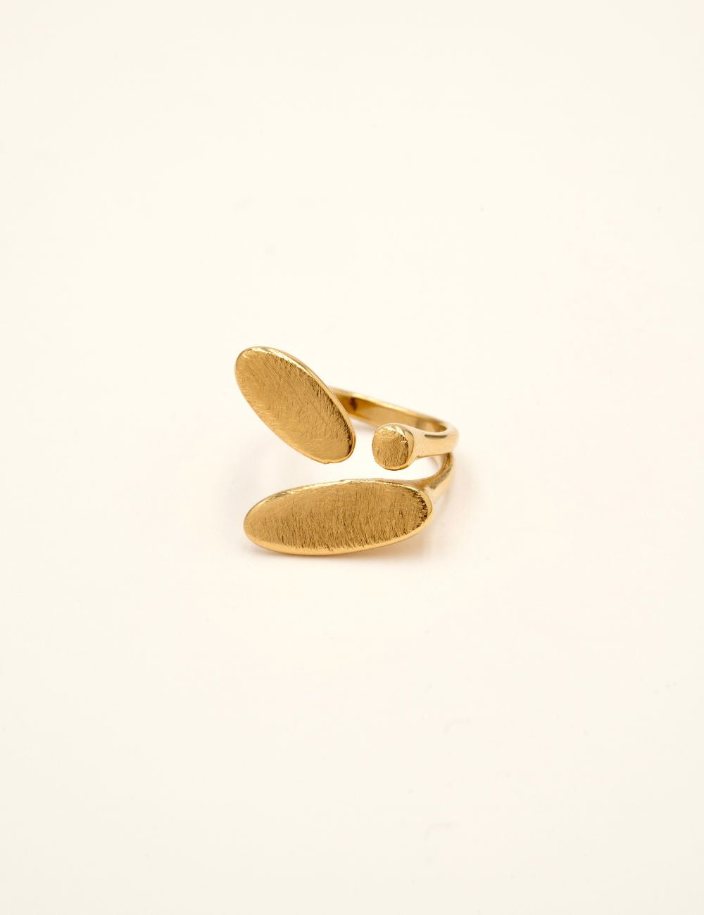 Bague ajustable graphique composée d'une pièce ronde et de deux pièces ovales avec un effet brossé.