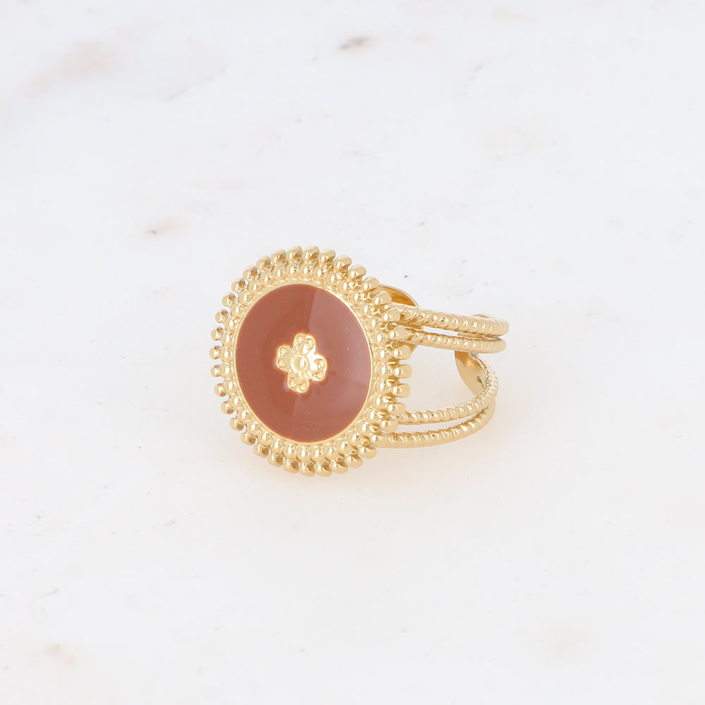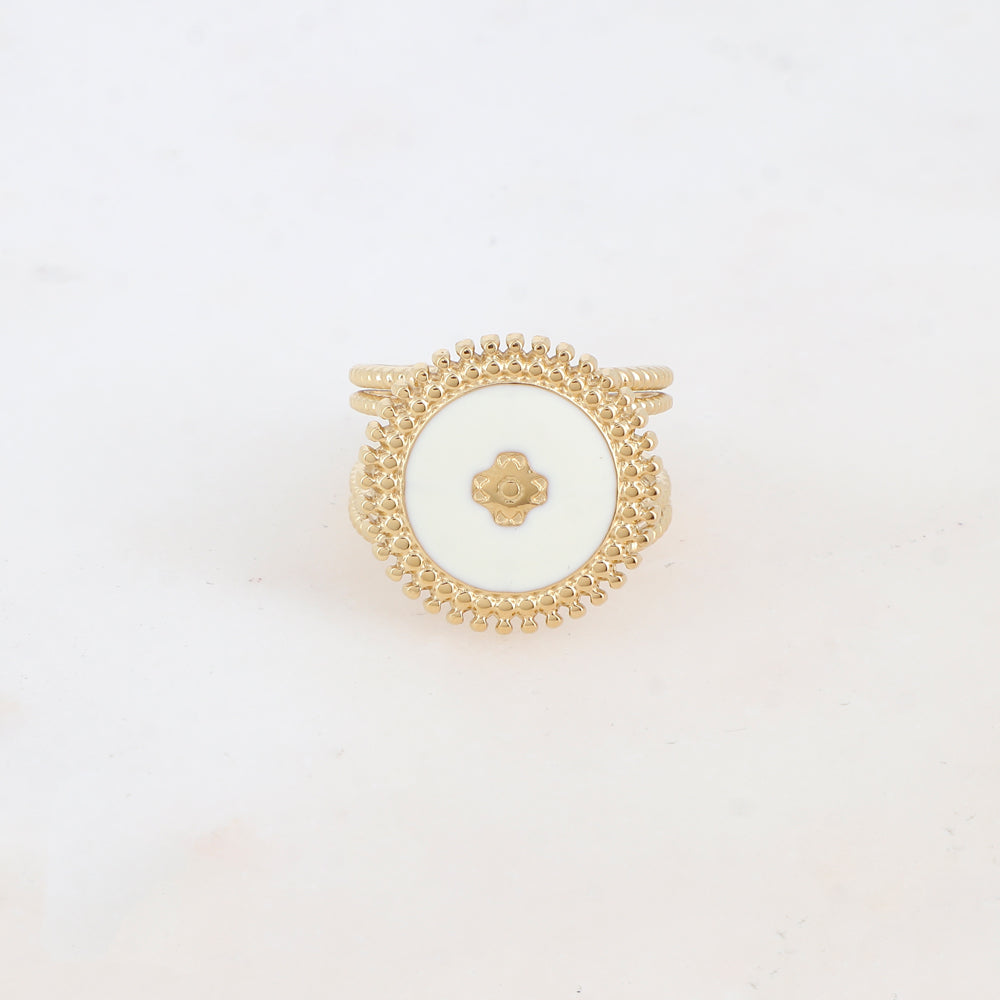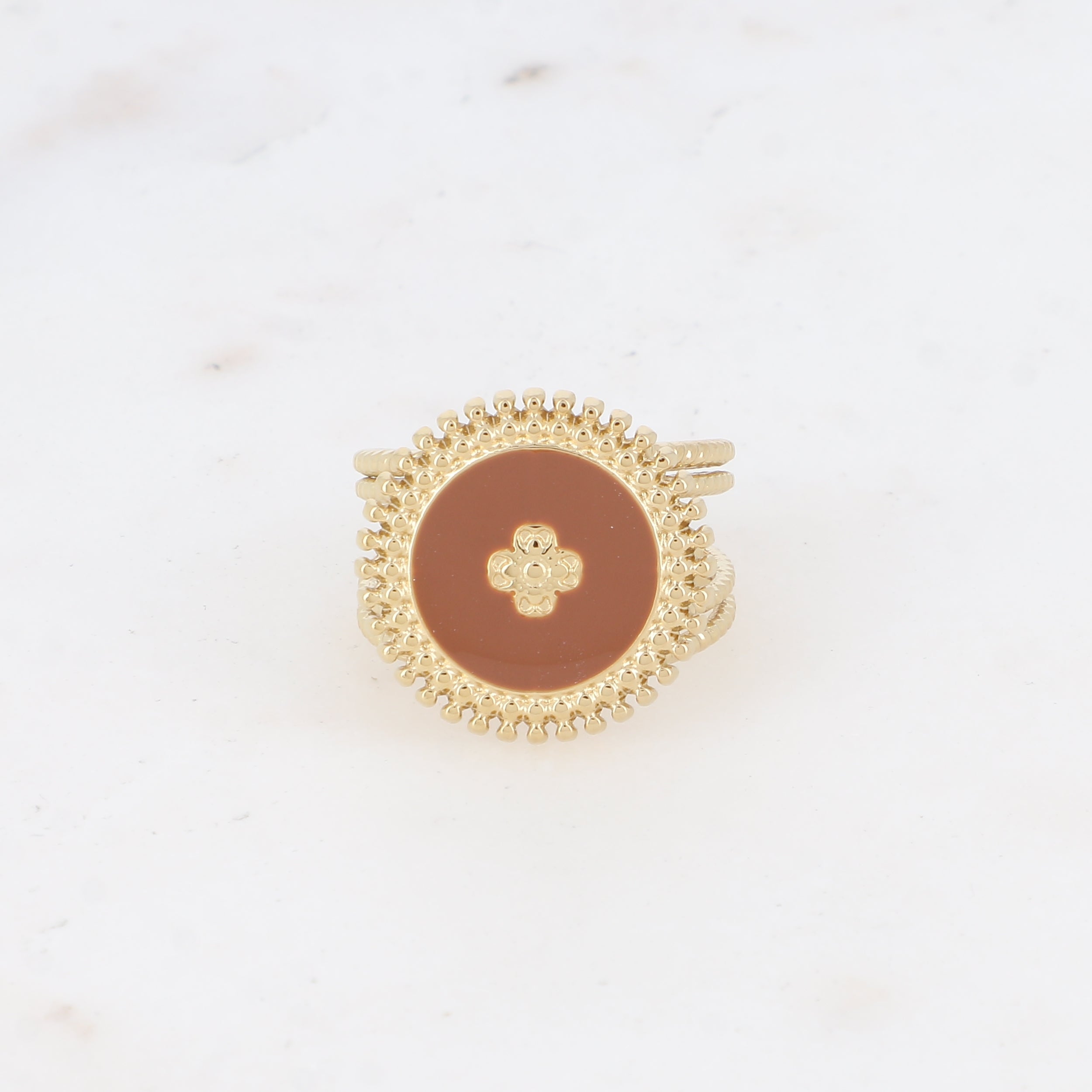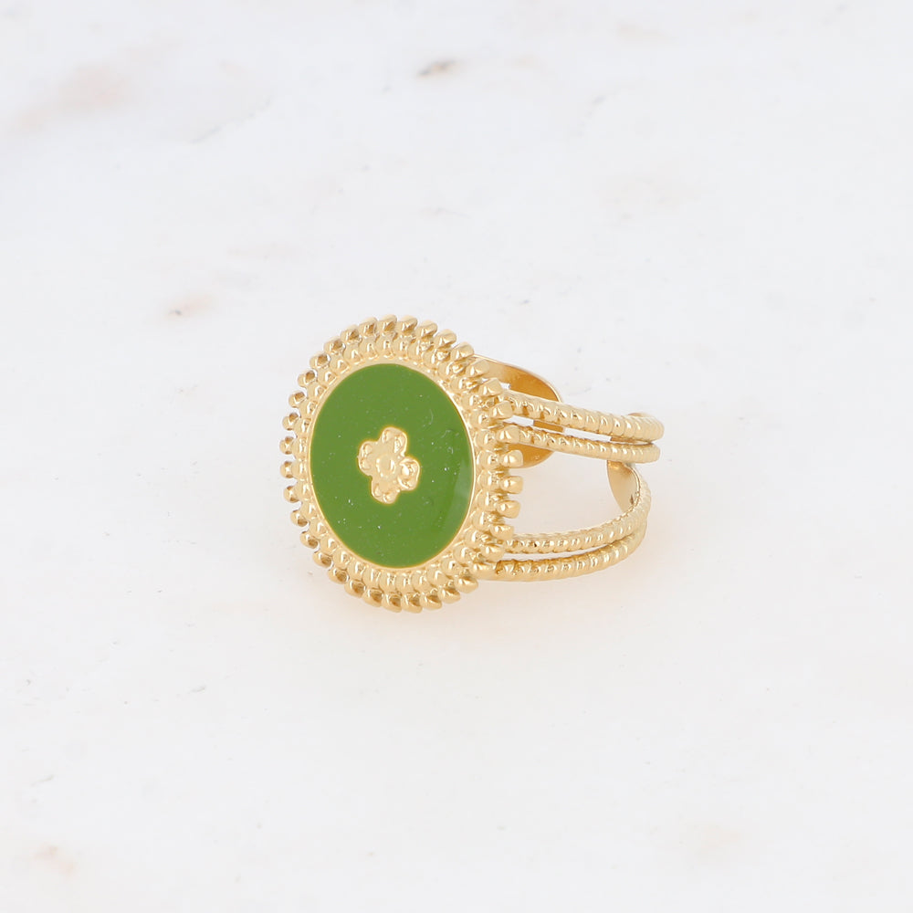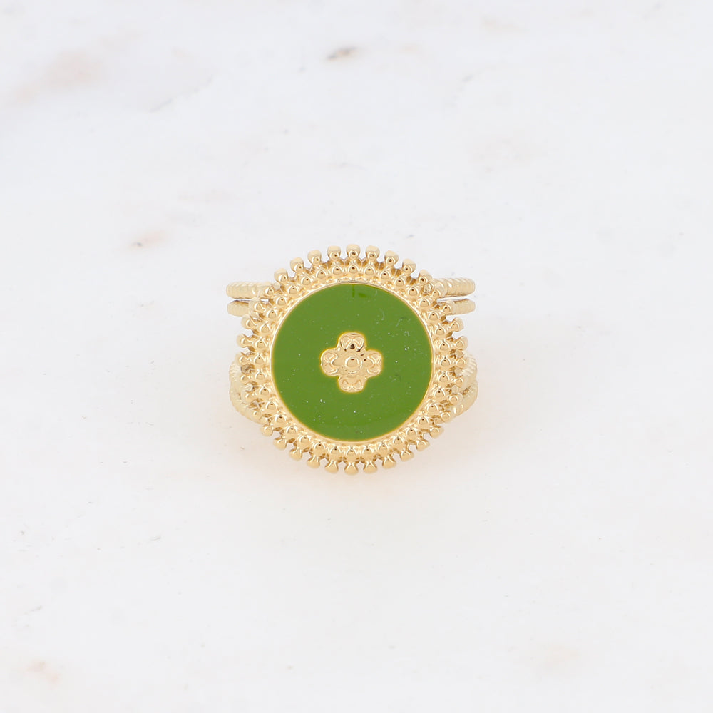 Bague graphique composée d'une pièce émaillée colorée avec une monture effet cannelé.