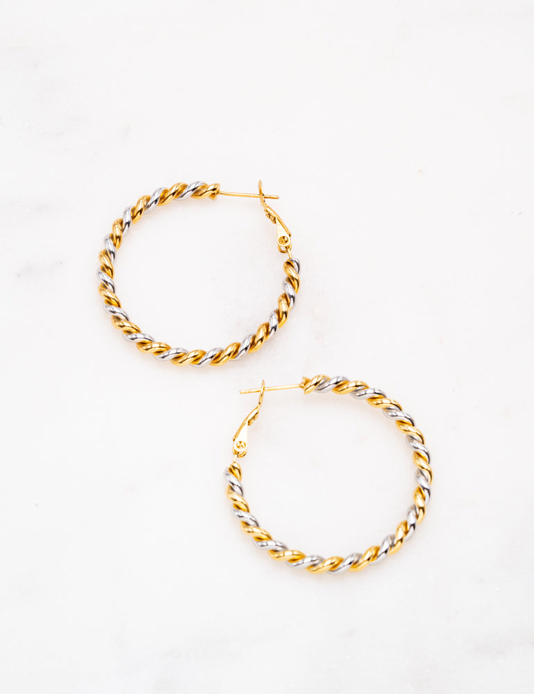Boucles d'oreilles graphiques bicolores (doré et argenté) type créoles texturées effet torsadé. Fermoir cliquet.