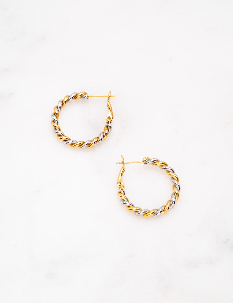 Boucles d'oreilles graphiques bicolores (doré et argenté) type créoles texturées effet torsadé. Fermoir cliquet.