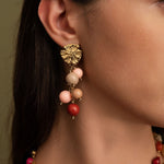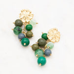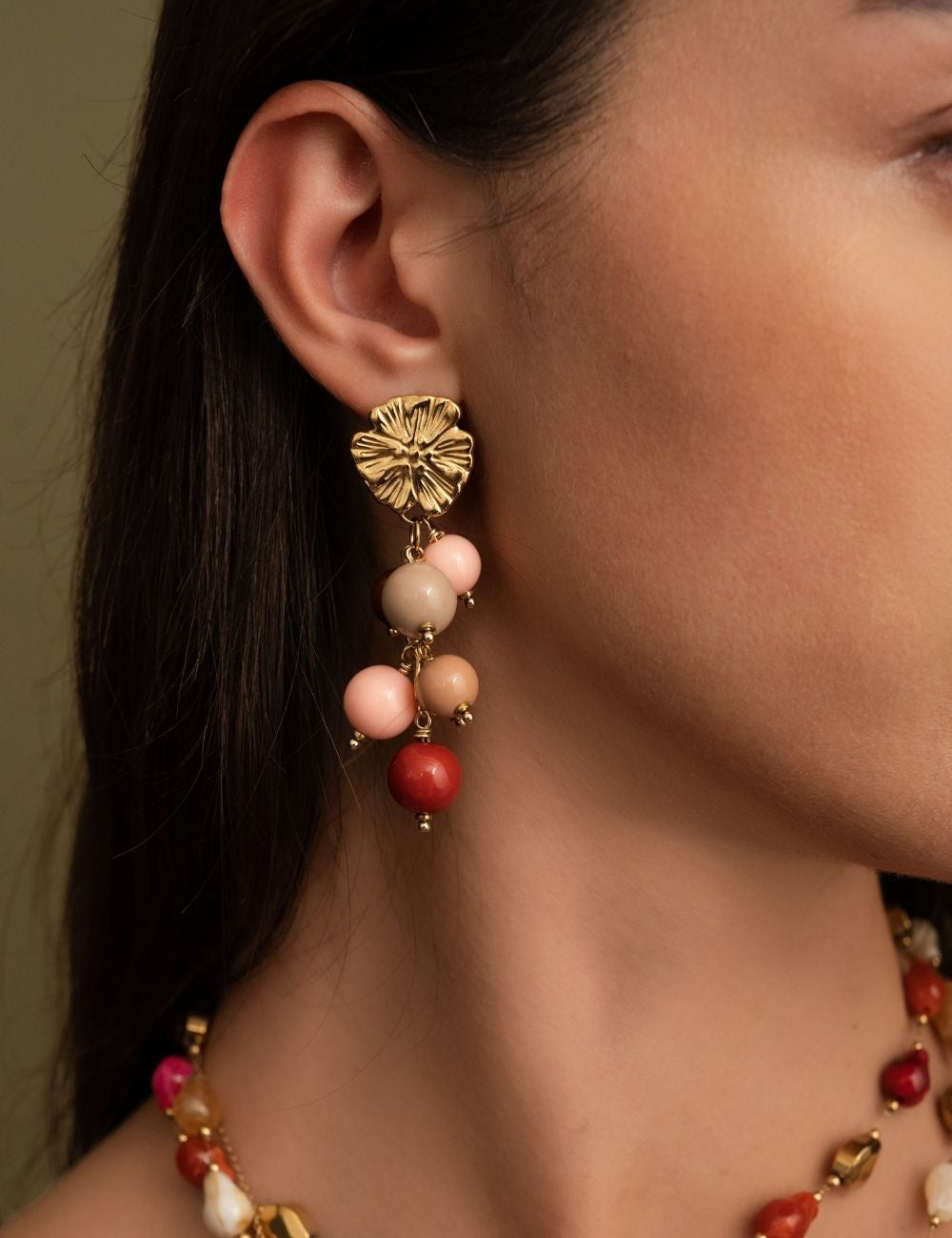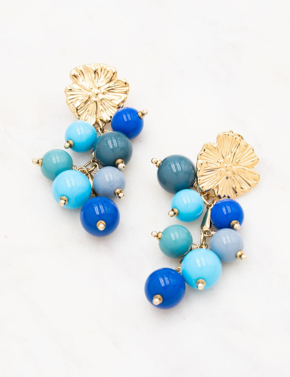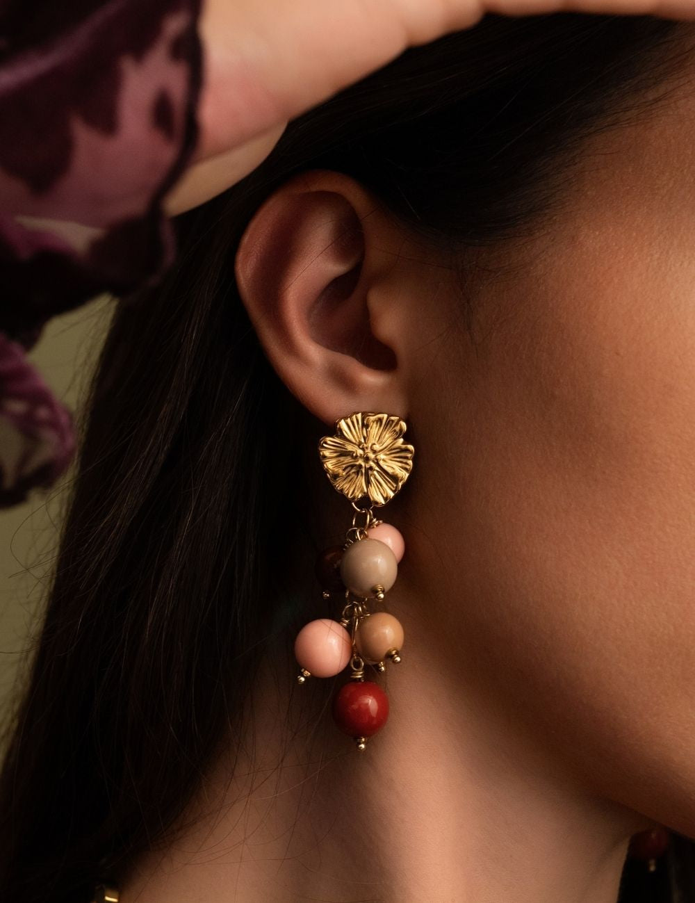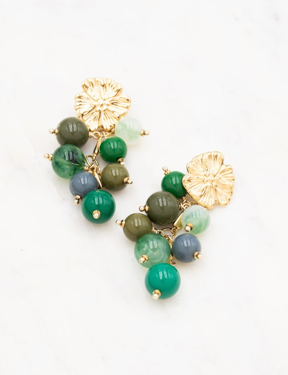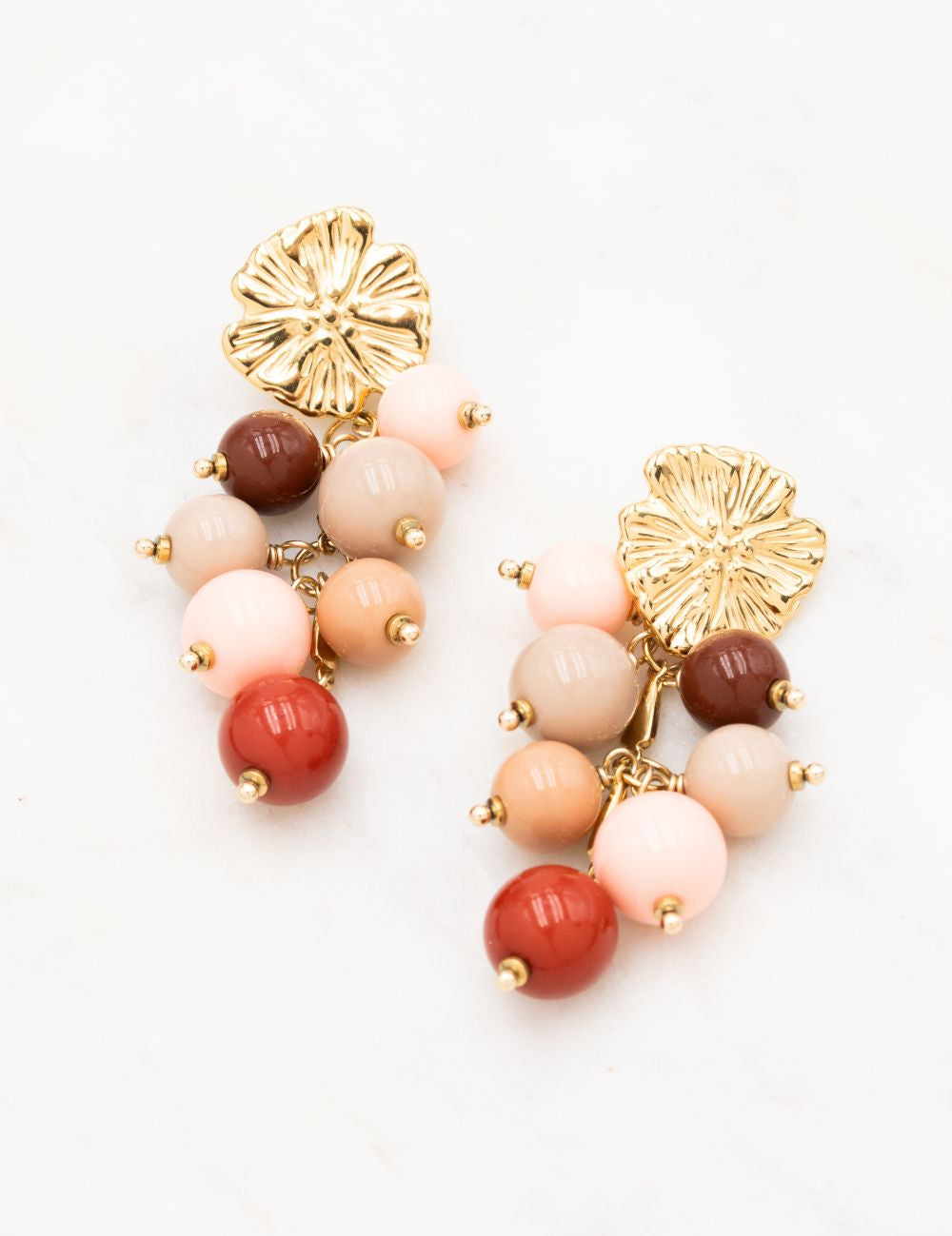 Boucles d'oreilles graphiques à puce composées d'une pièce au motif floral texturée et de perles en résine colorée.