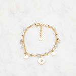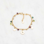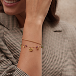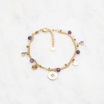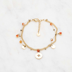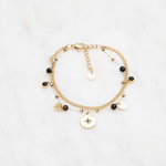 Bracelet réglable sur chaîne double rangs composé d'une chaine maille et une chaine ornée de pampilles rondes, de strass et de perles en pierres naturelles.
