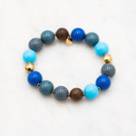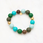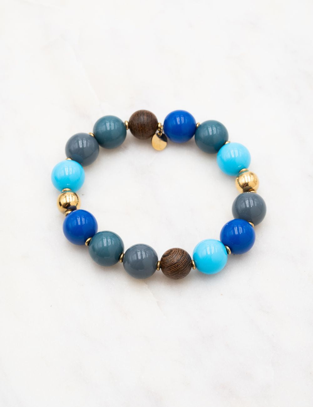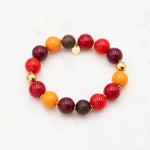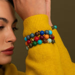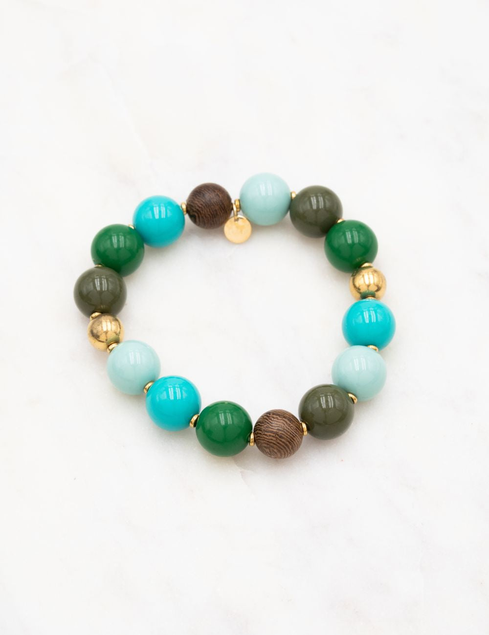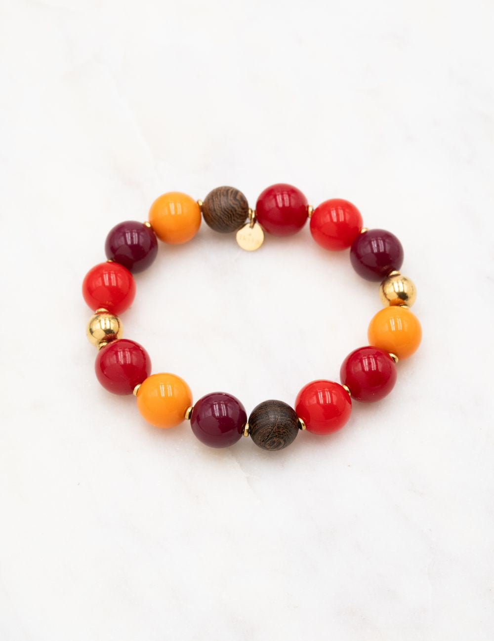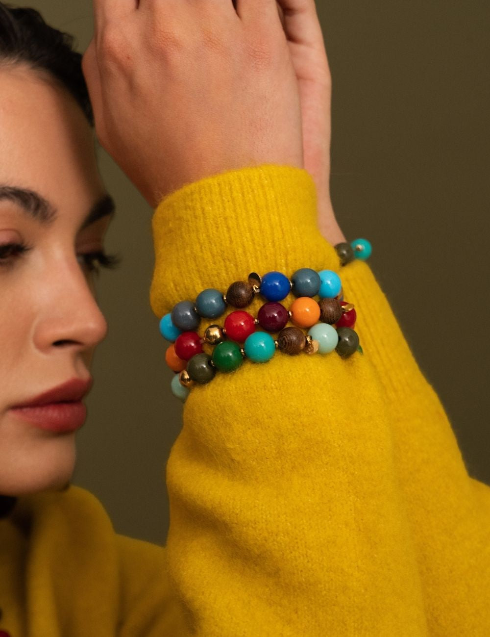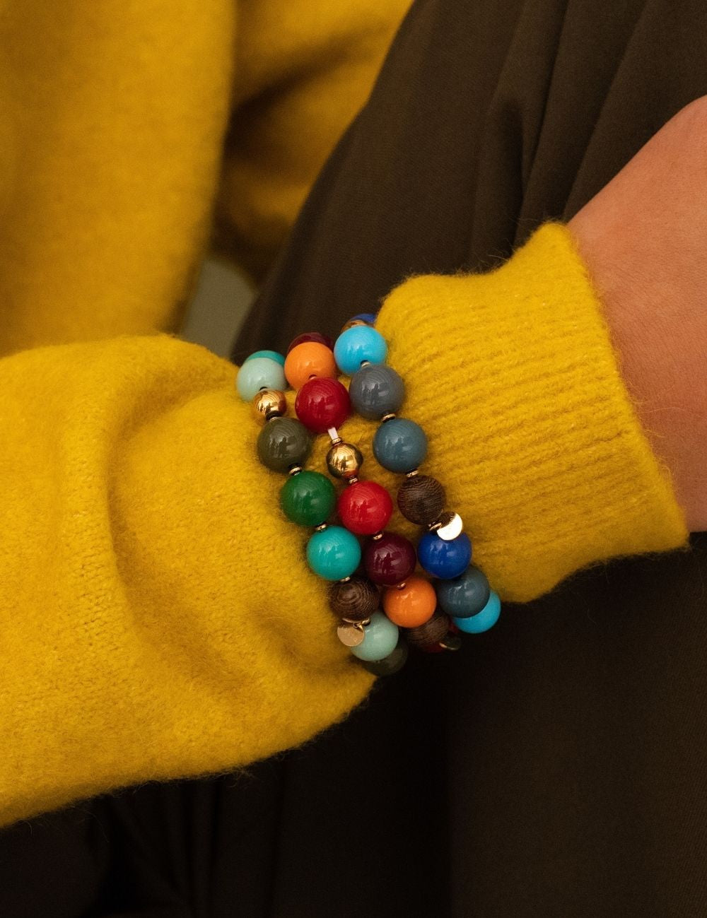 Bracelet élastique composé de d'un joli enfilage de perles en résine colorée, de perles en bois et de perles en acier.