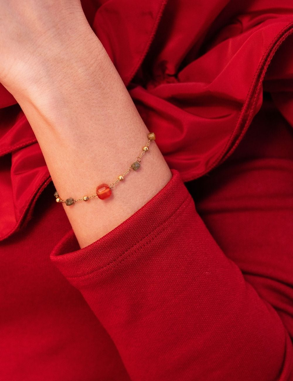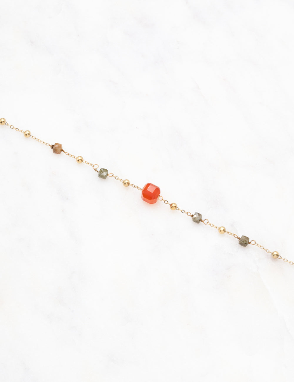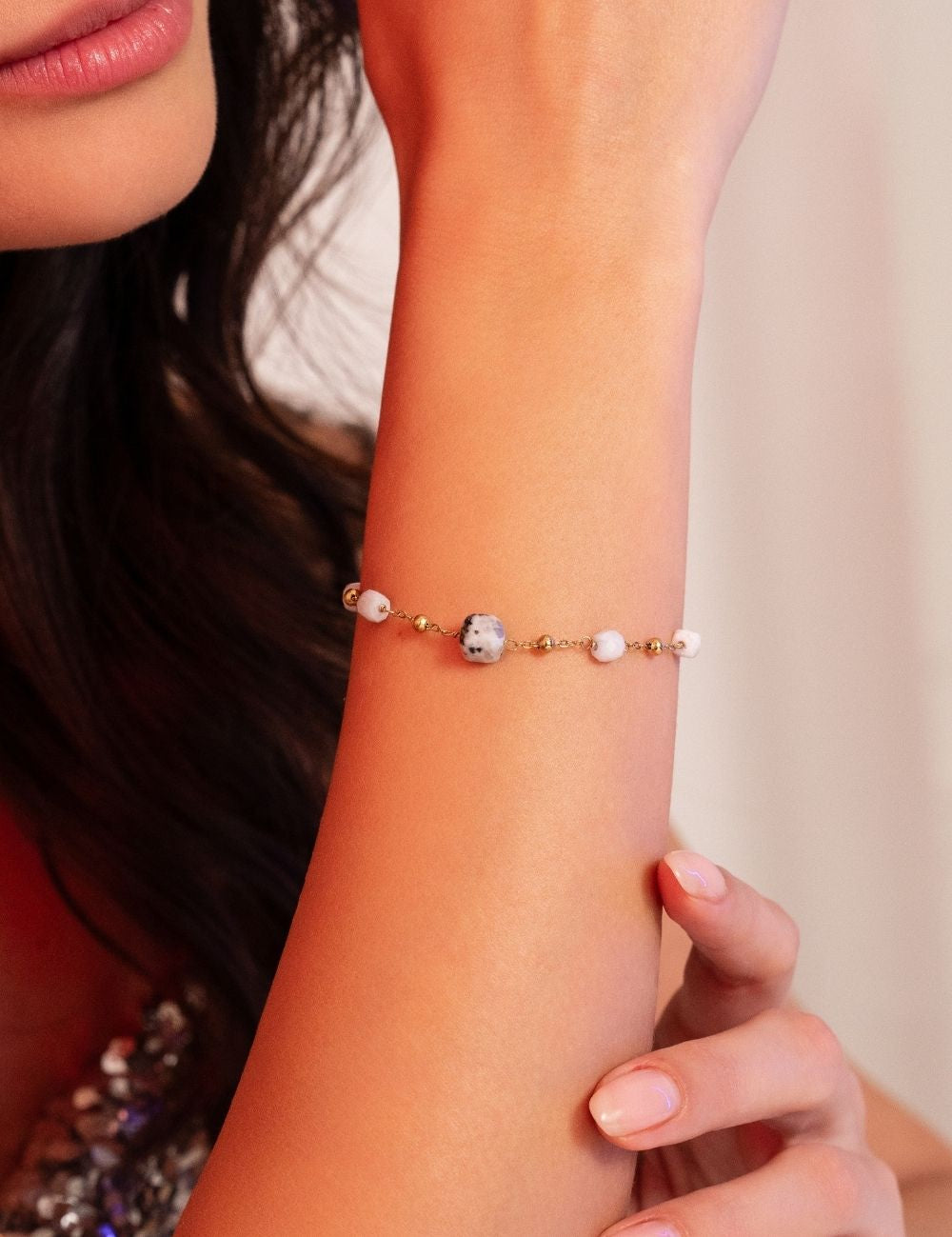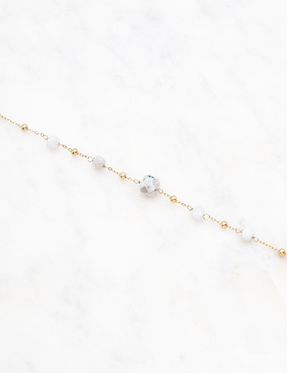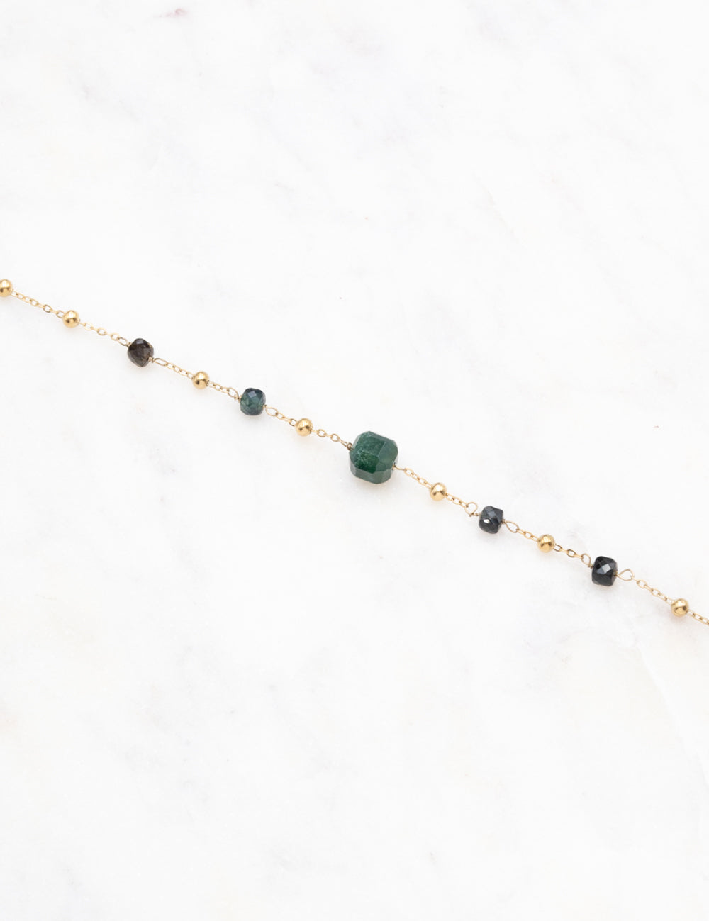 Bracelet réglable sur chaîne composé de perles en pierres naturelles et boules dorées.