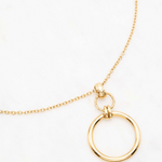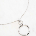 Collier réglable sur chaîne type sautoir composé d'anneaux texturés et d'un pendentif anneau lisse.