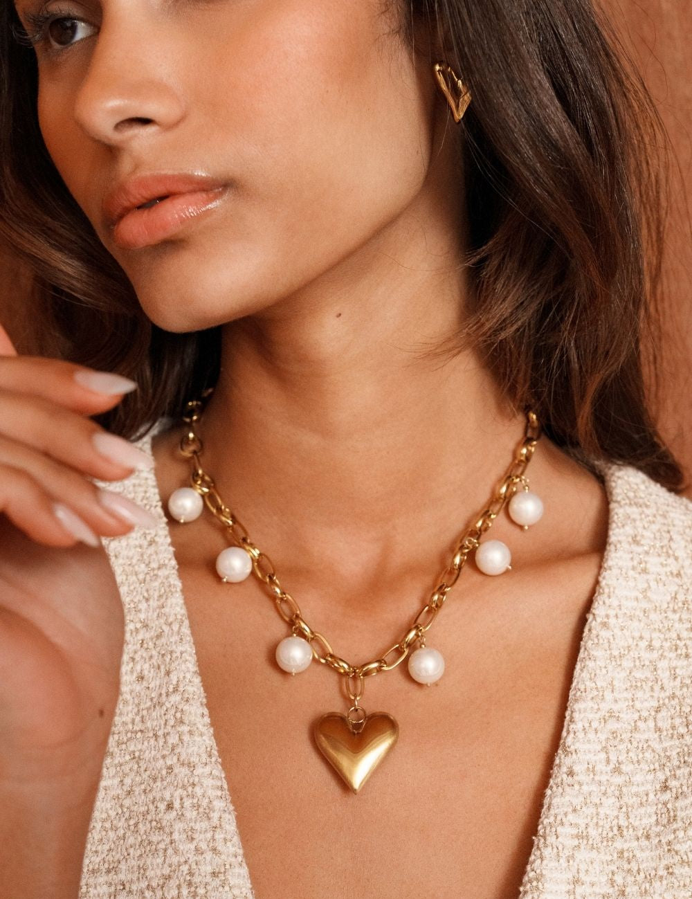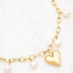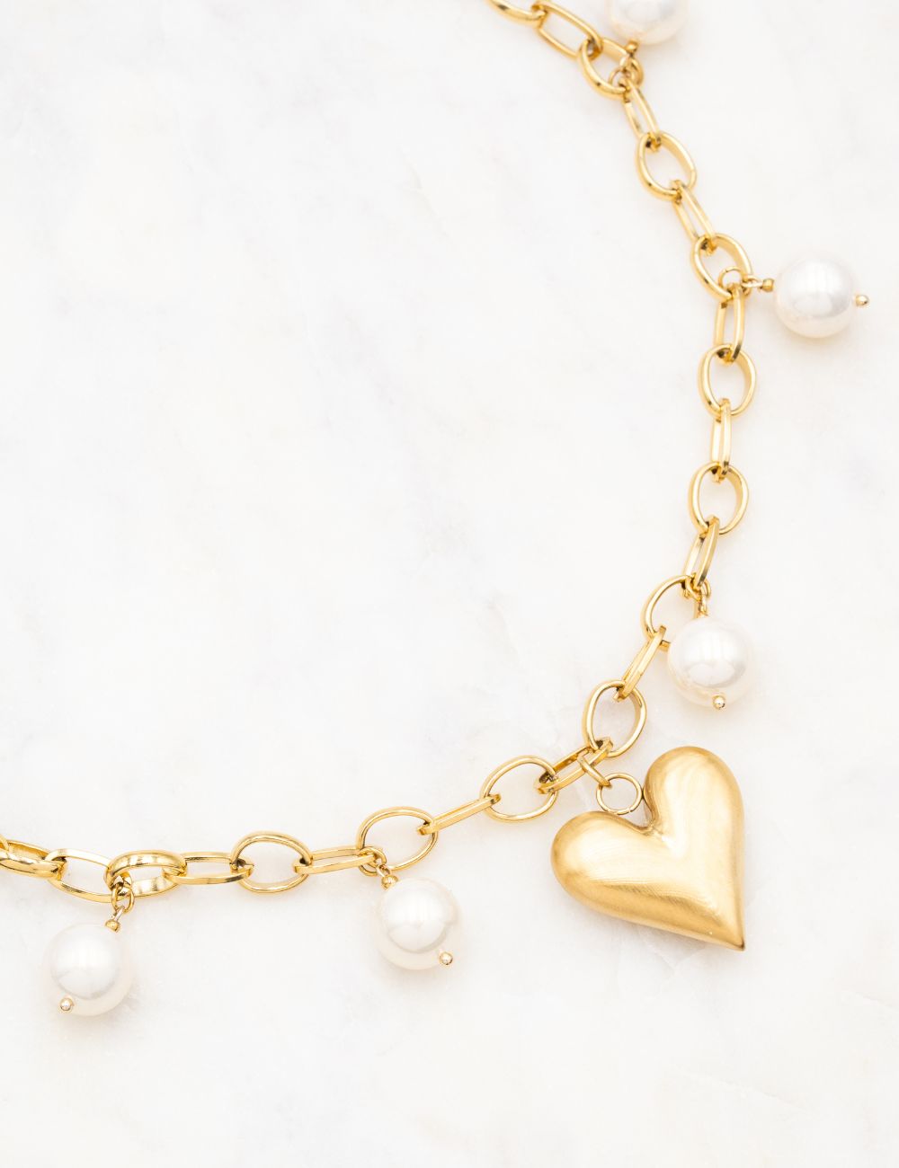 Collier en maille sur chaîne composé d'un pendentif forme cœur bombé effet brossé et de perles en résine effet nacré.