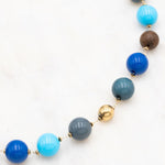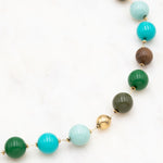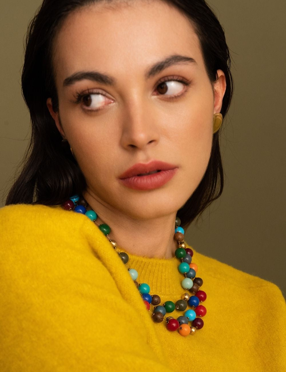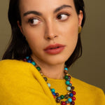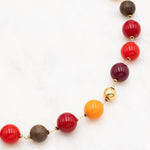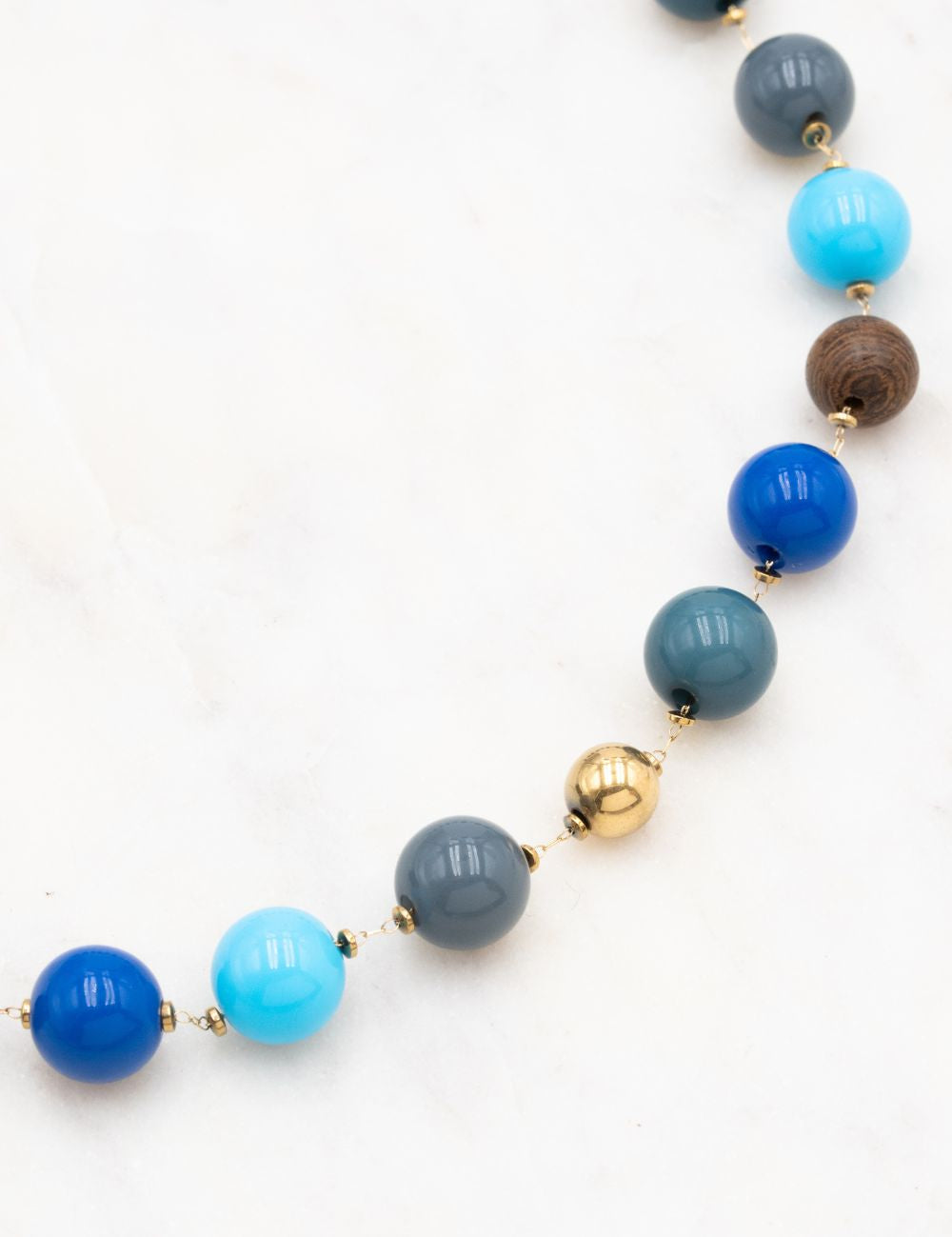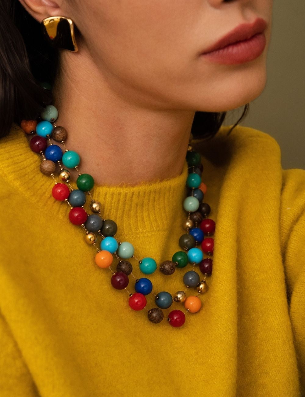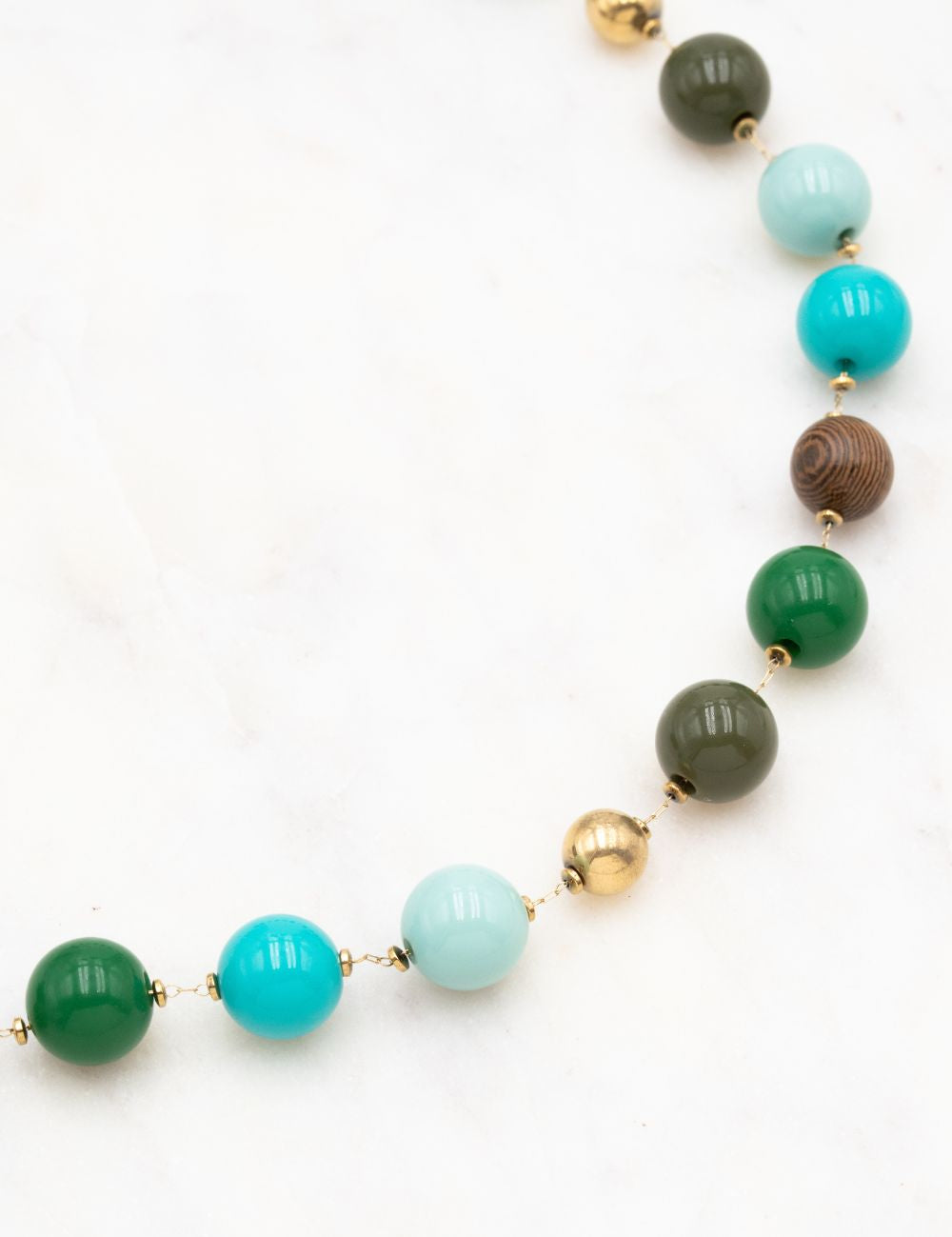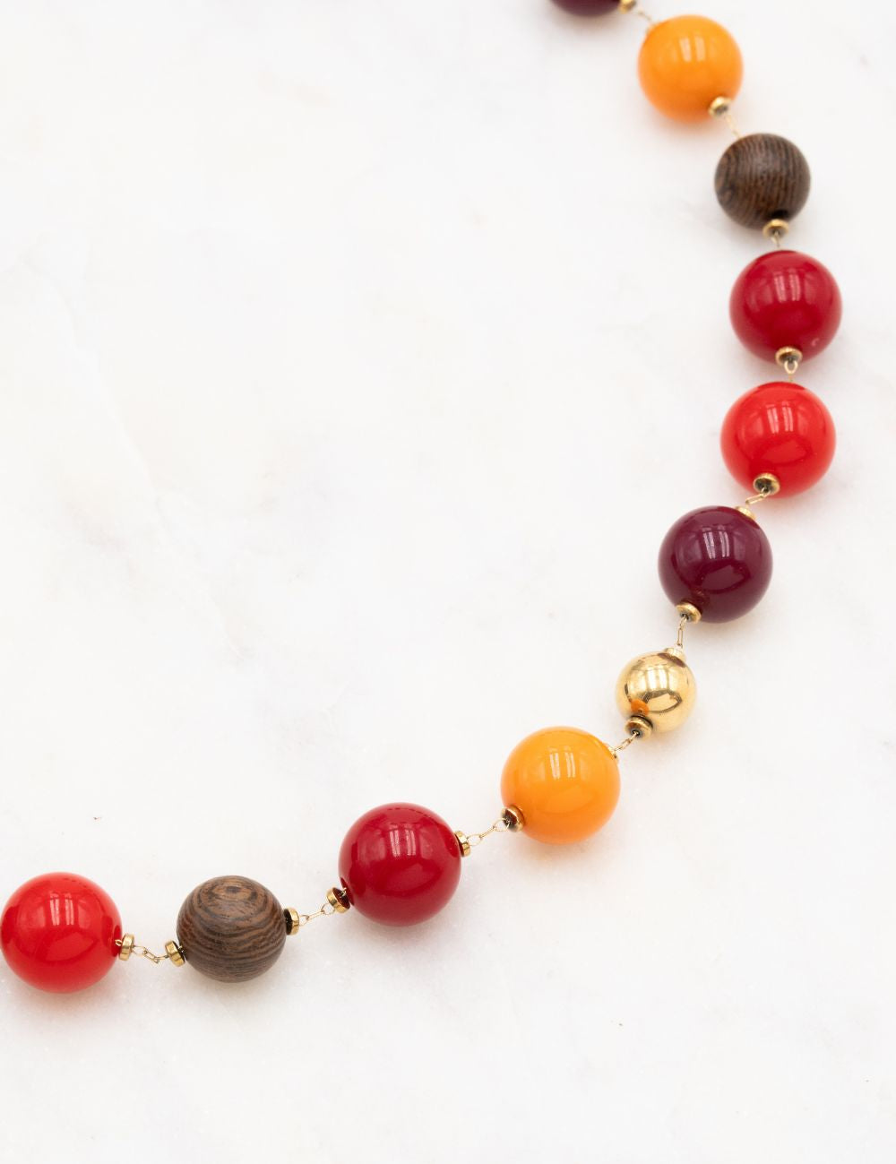Collier réglable sur chaîne composé de perles en résine colorée, de perles en bois et de perles en acier.