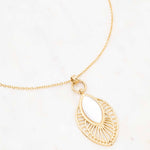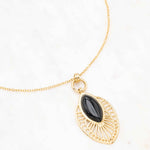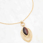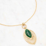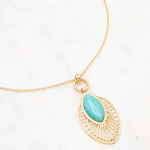 Collier réglable sur chaîne type sautoir composé d'un pendentif ajouré orné d'une pierre naturelle.